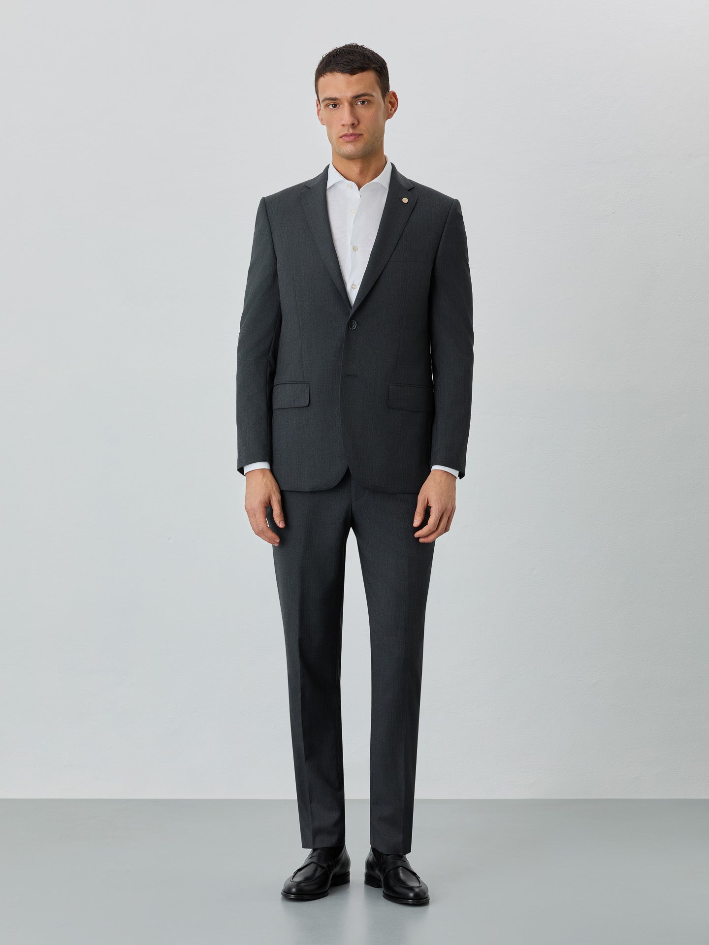 ICON Business line herringone suit expertly tailored from 100% Wool. This Special Edition slim fit formal two-piece suit has flawless details and full lining. Two-button blazer with notch lapels and welt pockets with flap, four-button cuffed, two back slits, front and interior pockets. Trousers with zip fly, button and hook extended waistband fastening, two side pockets with coin pocket, two back welt pockets and belt loops. All suits have regular fitting measures from sizes 56 to 62.