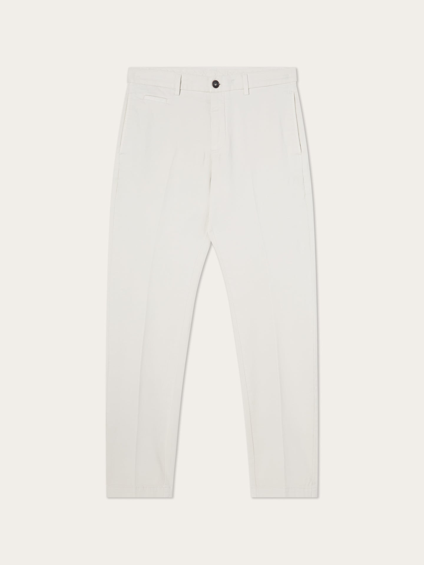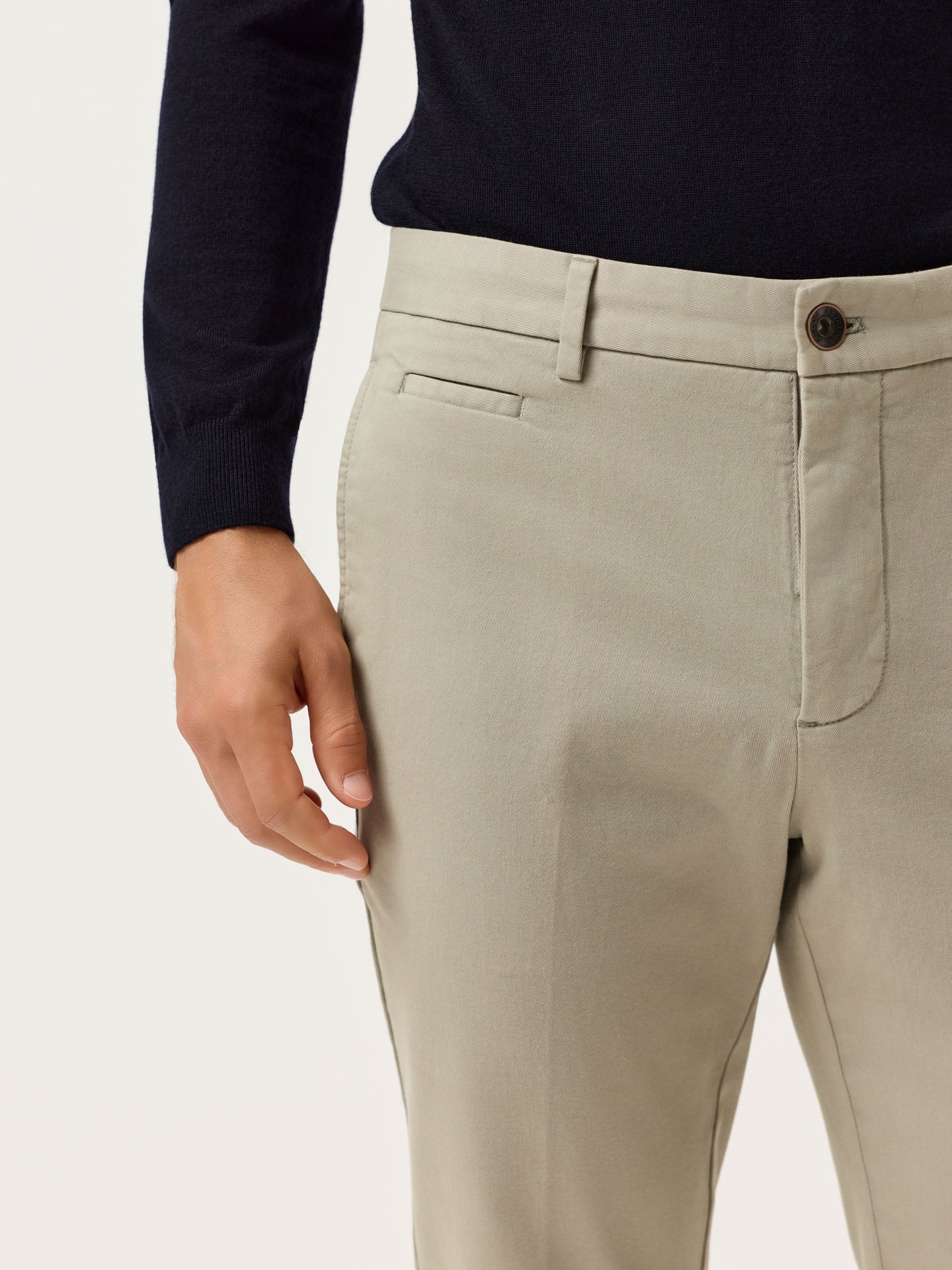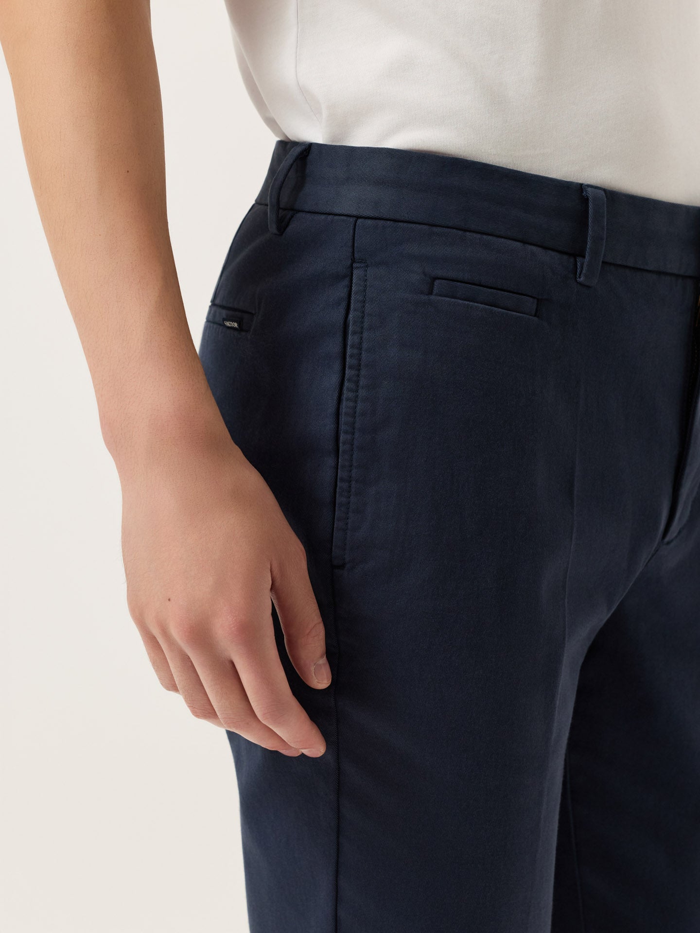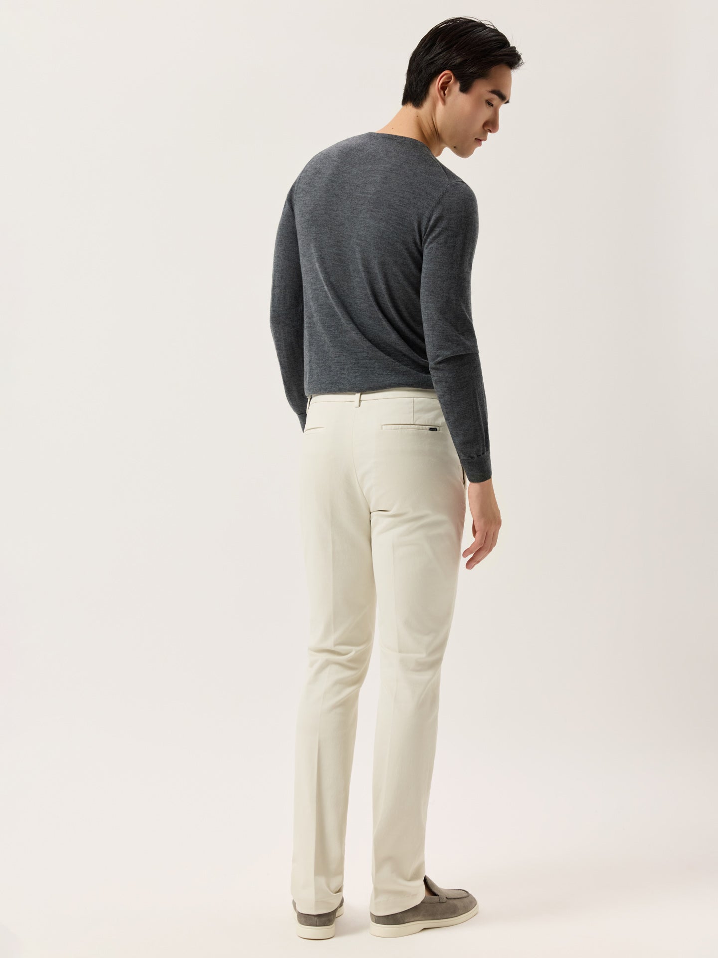 These slim-fit chinos are cut from a faded twill in stretch cotton and garment-dyed for depth and softness. Designed with slanted front pockets, stitched fly, and welt back pockets, they feature classic tailoring details like a “V” notch waistband and horn-effect front button engraved with the Sacoor signature. Inside, all linings—including waistband, fly, and pocket bags—are made in tonal herringbone.