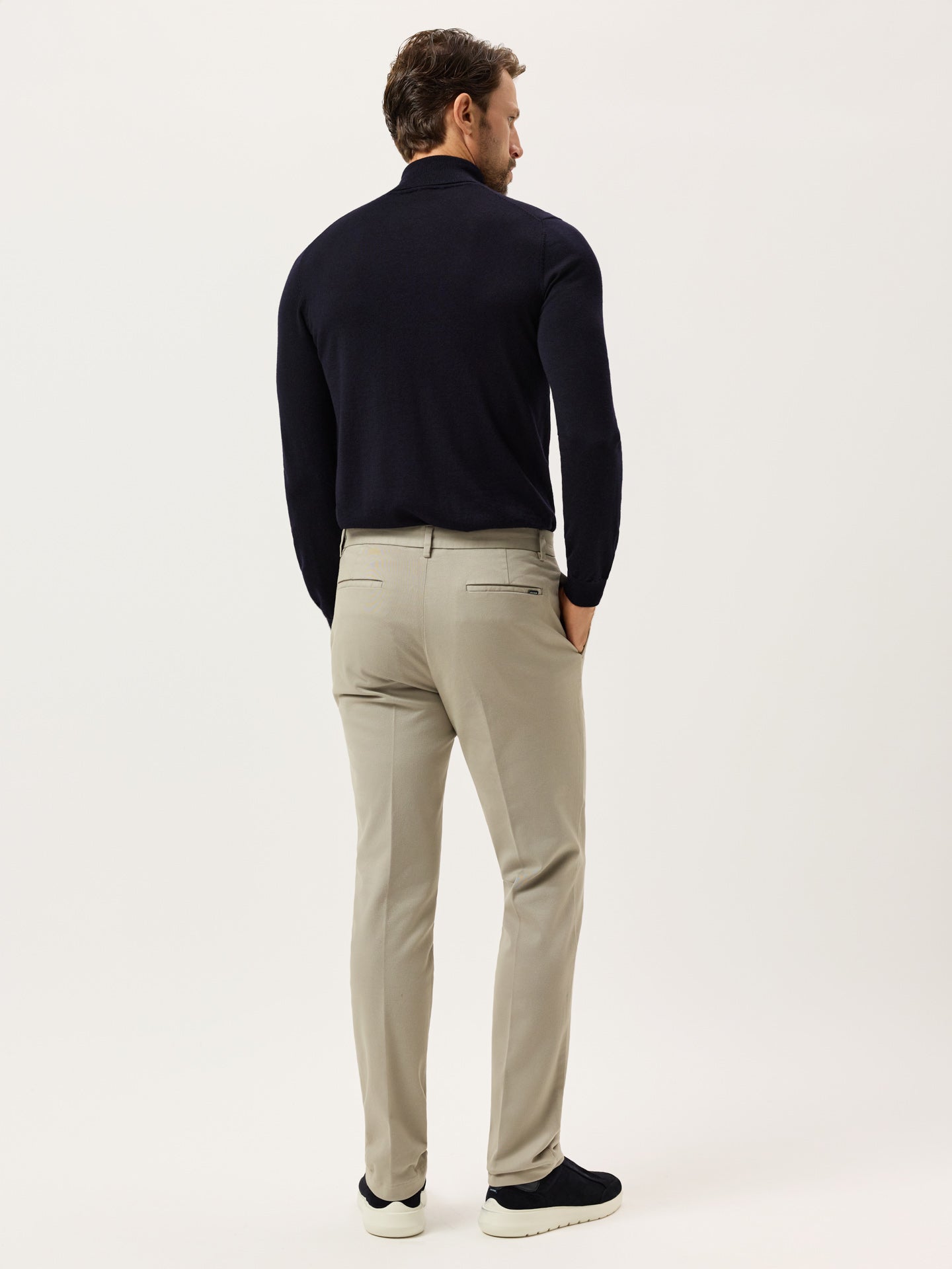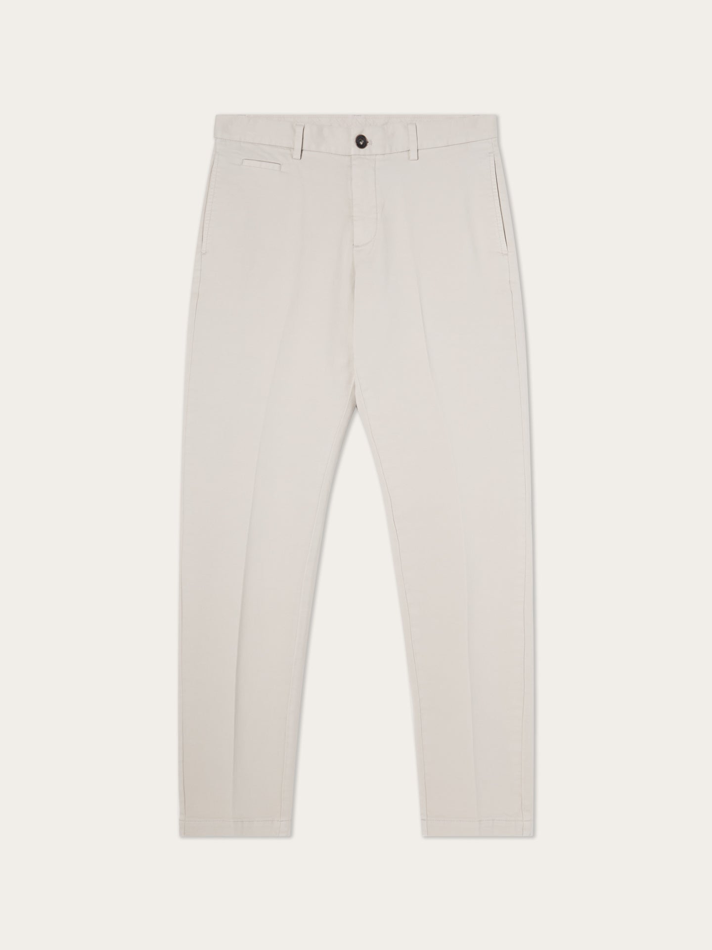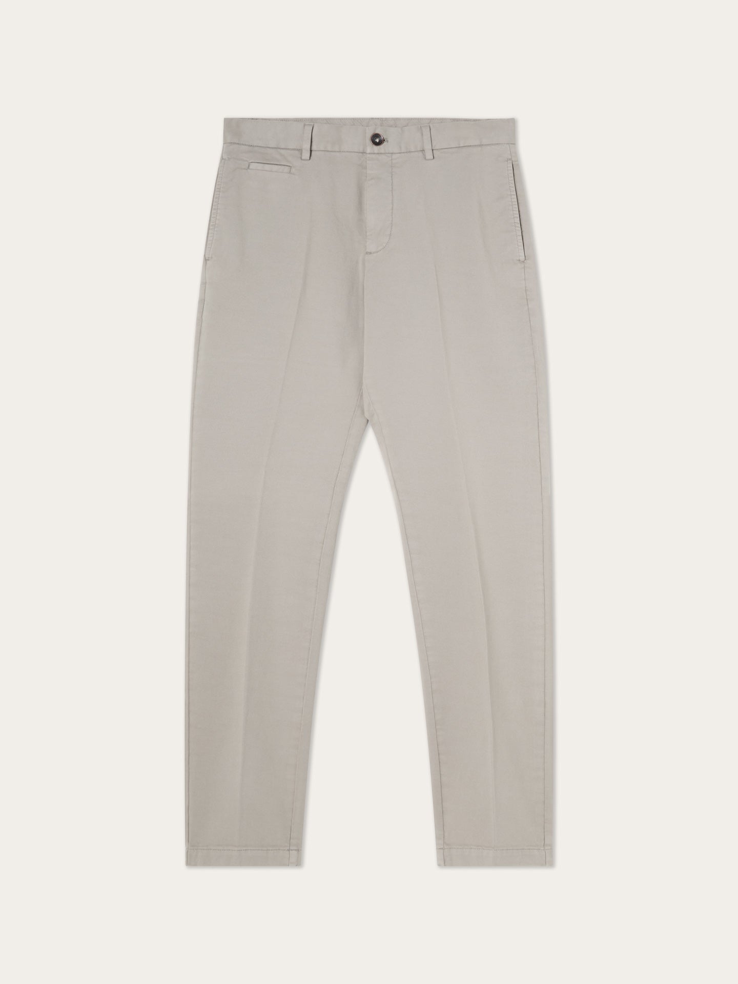 These slim-fit chinos are cut from a faded twill in stretch cotton and garment-dyed for depth and softness. Designed with slanted front pockets, stitched fly, and welt back pockets, they feature classic tailoring details like a “V” notch waistband and horn-effect front button engraved with the Sacoor signature. Inside, all linings—including waistband, fly, and pocket bags—are made in tonal herringbone.