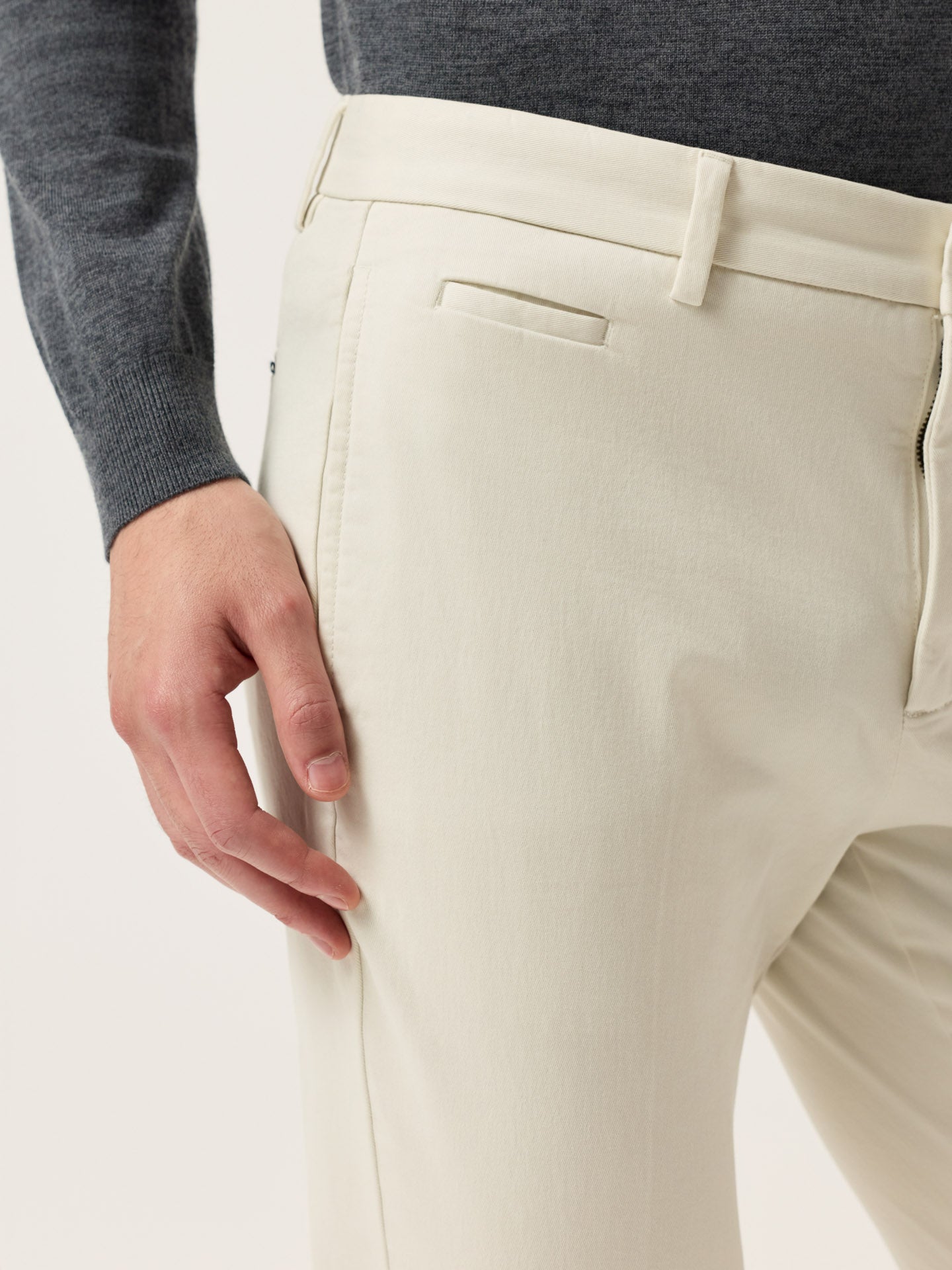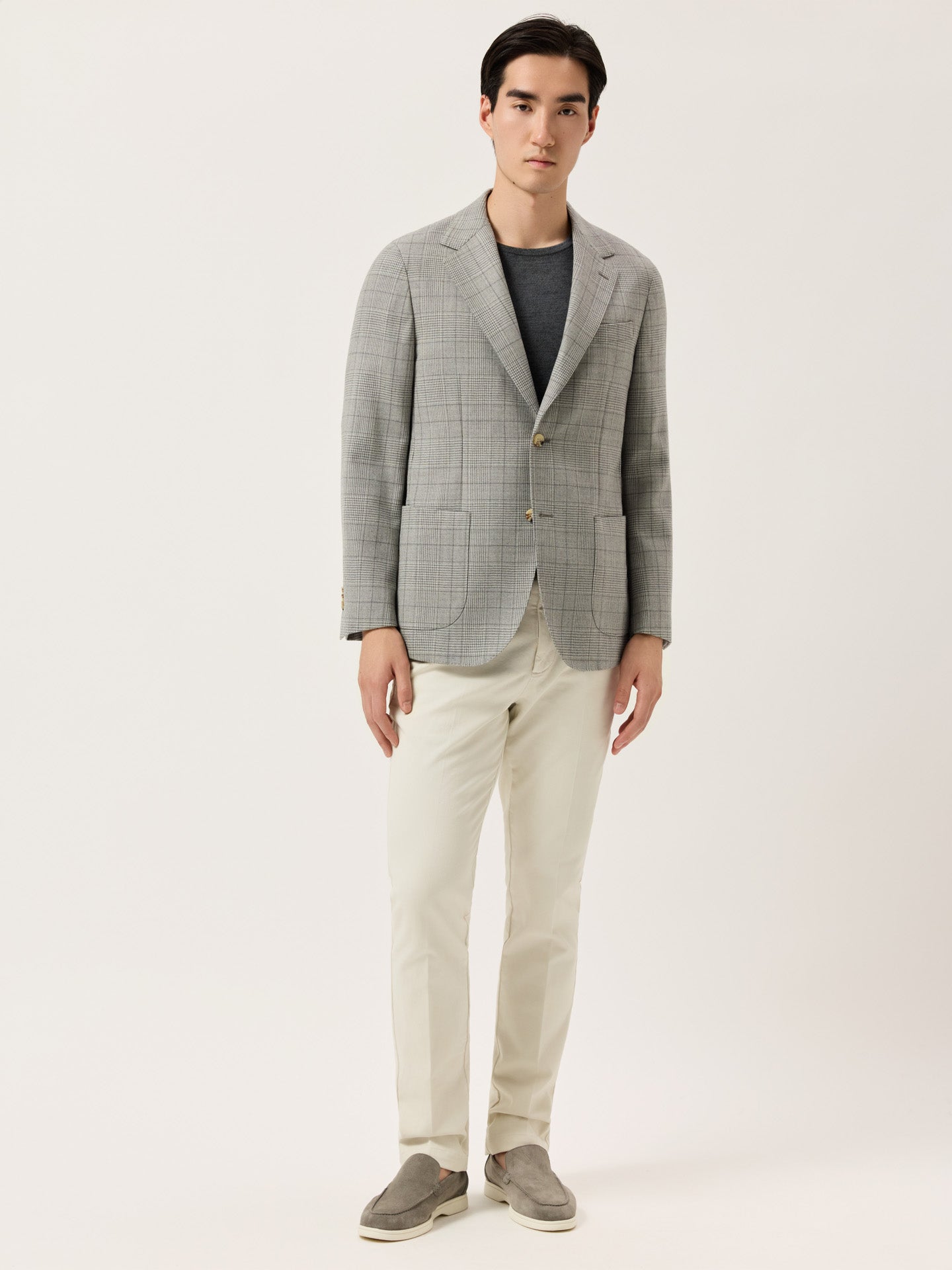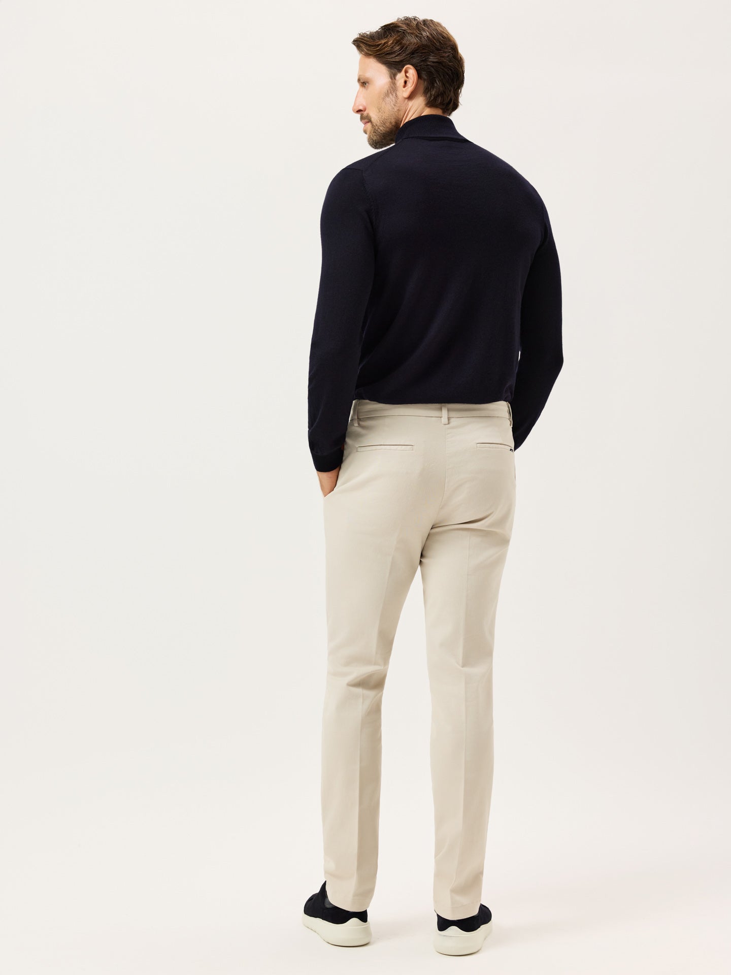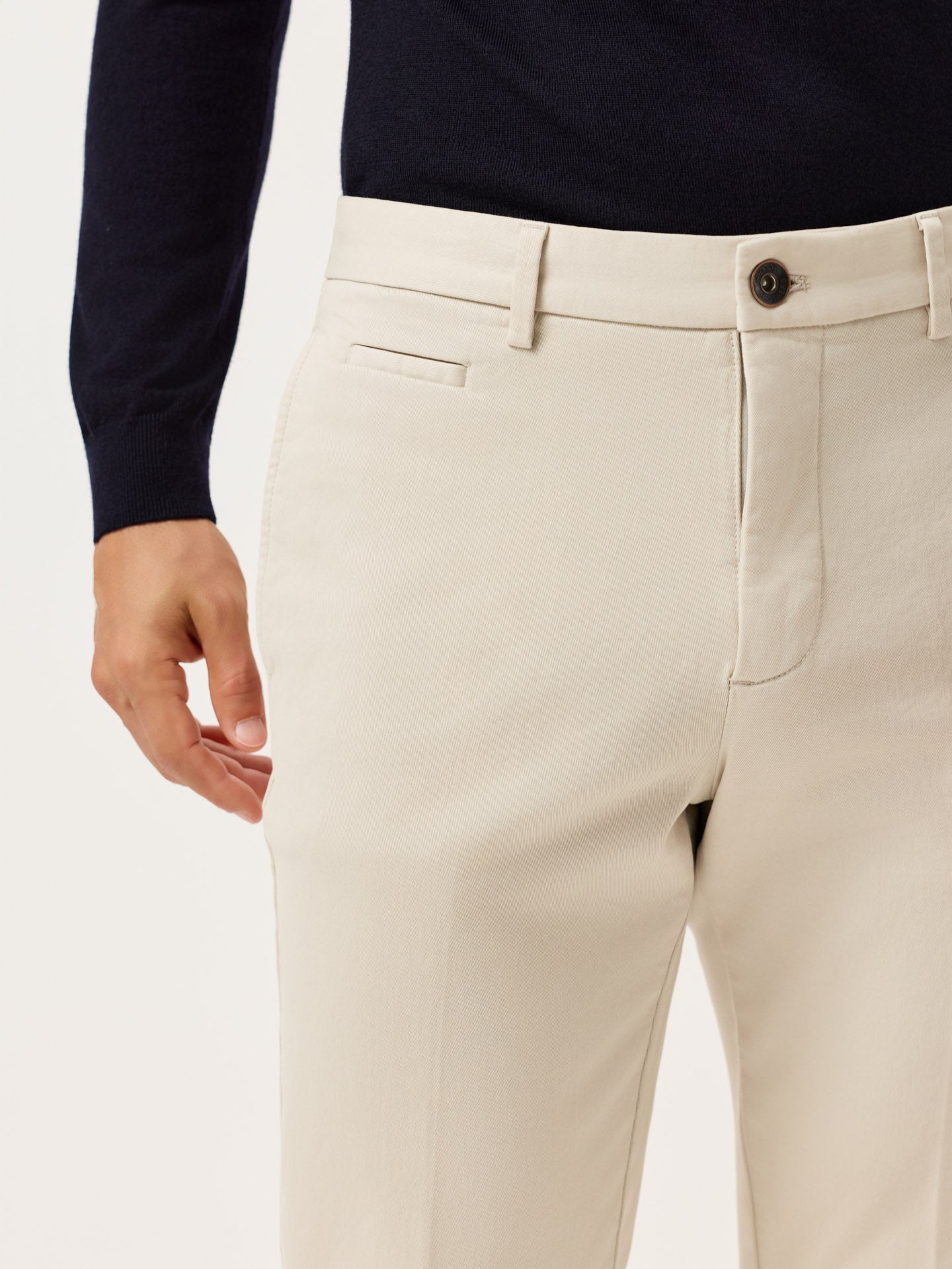 These slim-fit chinos are cut from a faded twill in stretch cotton and garment-dyed for depth and softness. Designed with slanted front pockets, stitched fly, and welt back pockets, they feature classic tailoring details like a “V” notch waistband and horn-effect front button engraved with the Sacoor signature. Inside, all linings—including waistband, fly, and pocket bags—are made in tonal herringbone.