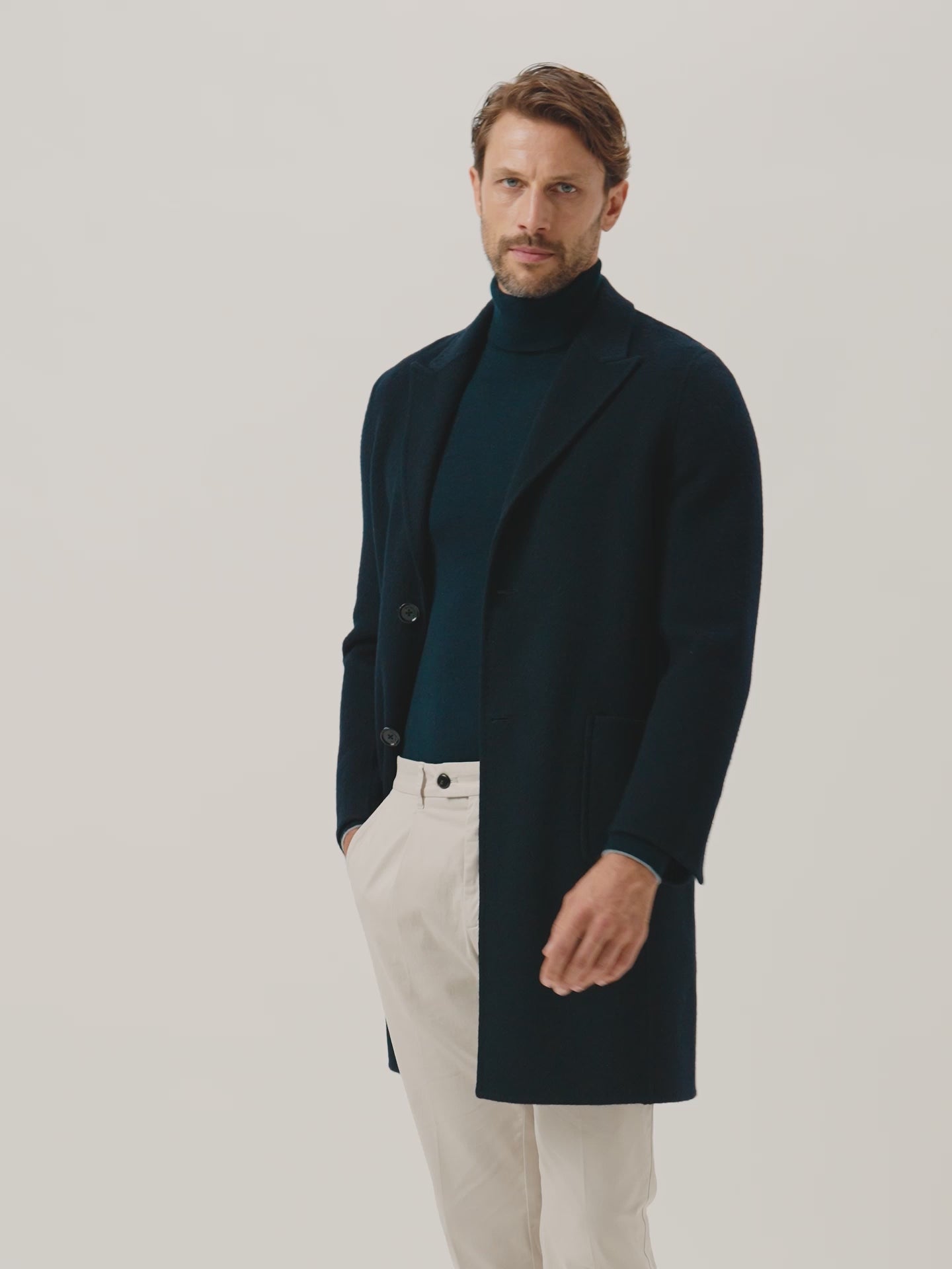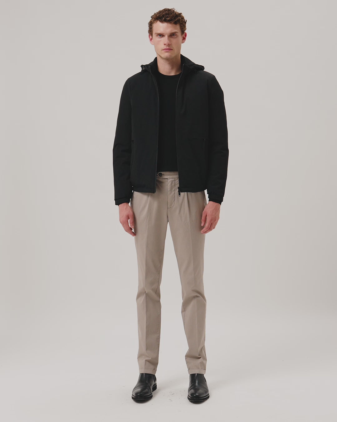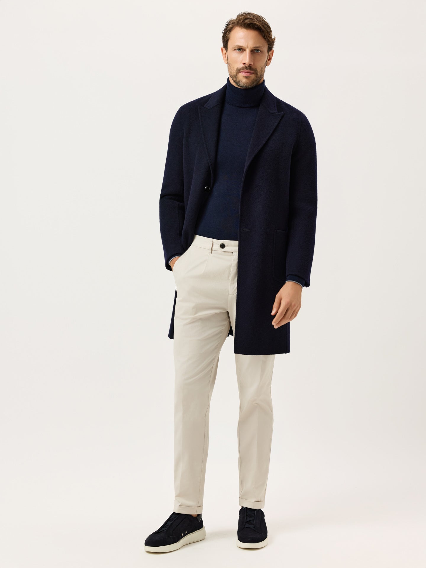 These slim-fit chinos are tailored from a light twill cotton blend and garment-dyed for depth and softness. They feature a clean front pleat, slanted side pockets, and welt back pockets, all finished with tonal herringbone lining for a tailored touch. The front waistband includes a “V” notch detail and personalized horn-effect button. Subtle refinements such as bartacks and inside binding add to the elevated construction.