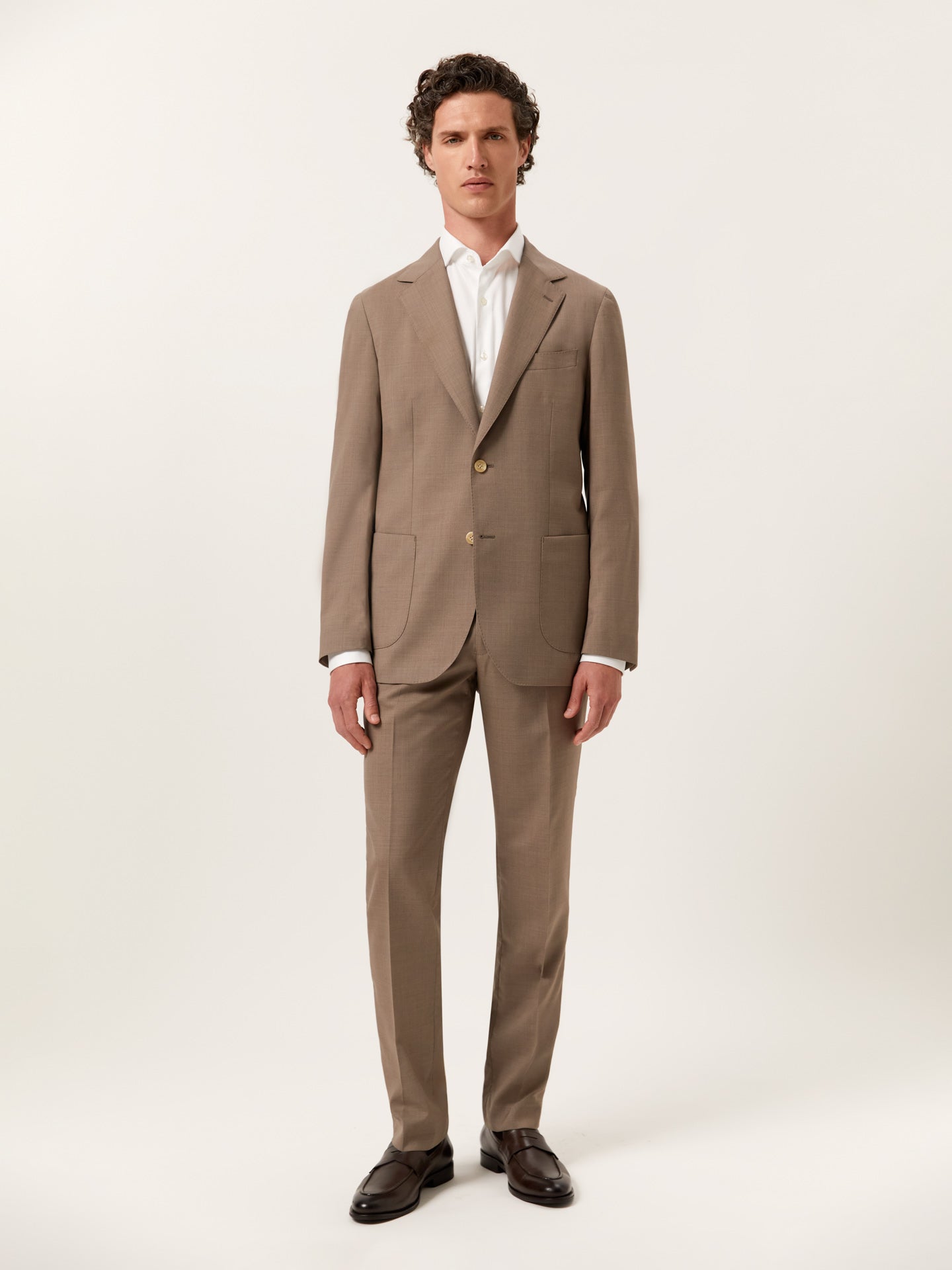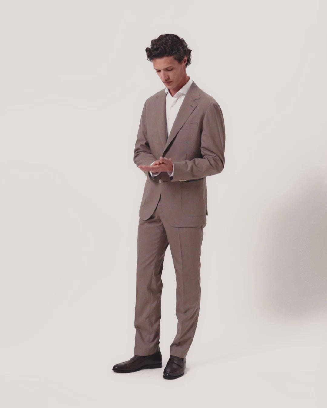 Part of the Wedding Capsule, this slim-fit two-piece suit is the perfect choice for a summer wedding, offering a blend of sophistication and comfort. Expertly crafted from 100% wool in an elegant mélange color, it features a sharp, refined silhouette that is perfect for both daytime and evening events. The blazer, with its half-lining, strikes a balance between structure and breathability, ensuring comfort without compromising on style. It features a classic two-button closure, notch lapels, and practical patch pockets, complemented by four-button cuffs and two back slits for ease of movement. Thoughtfully designed front and interior pockets provide functional storage while maintaining a polished look. The trousers are equally refined, with a zip fly, extended button waistband fastening, two side pockets with a discreet coin pocket, two back welt pockets, and belt loops, ensuring versatility and understated elegance. This suit seamlessly blends classic tailoring with modern ease, making it the ideal choice for a sophisticated summer wedding celebration. All suits follow regular fitting measurements from sizes 56 to 62.