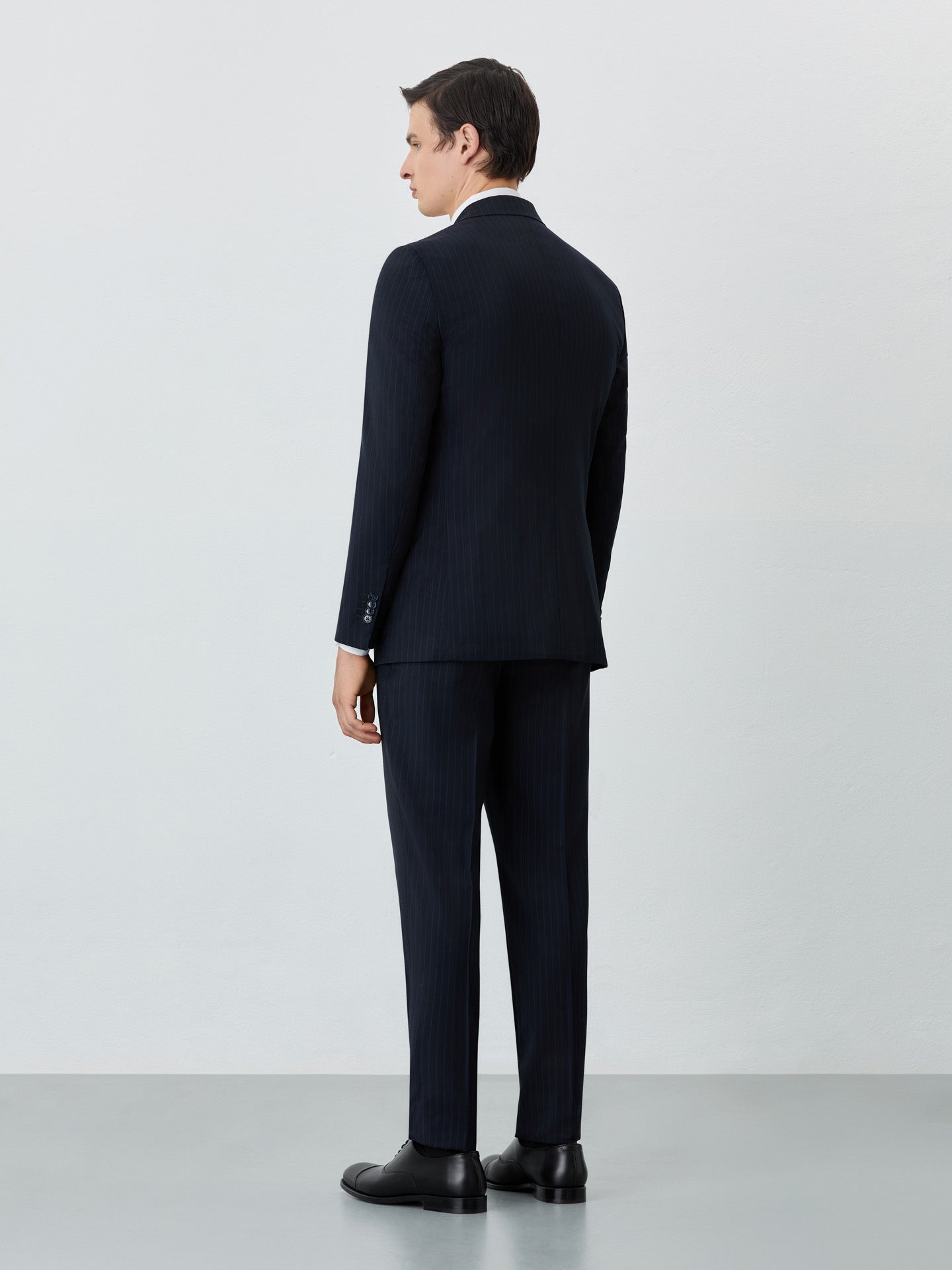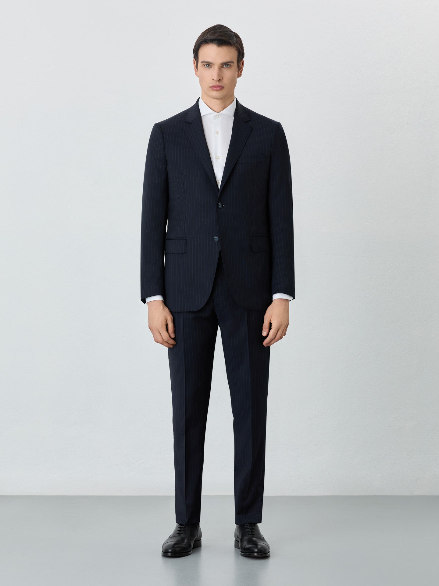Business line striped suit expertly tailored from 100% Wool, made in Portugal. This Special Edition slim fit formal two-piece suit has flawless details and full lining. Two-button blazer with notch lapels and welt pockets with flap, four-button cuffed, two back slits, front and interior pockets. Trousers with zip fly, button and hook extended waistband fastening, two side pockets with coin pocket, two back welt pockets and belt loops. All suits have regular fitting measures from sizes 56 to 62.