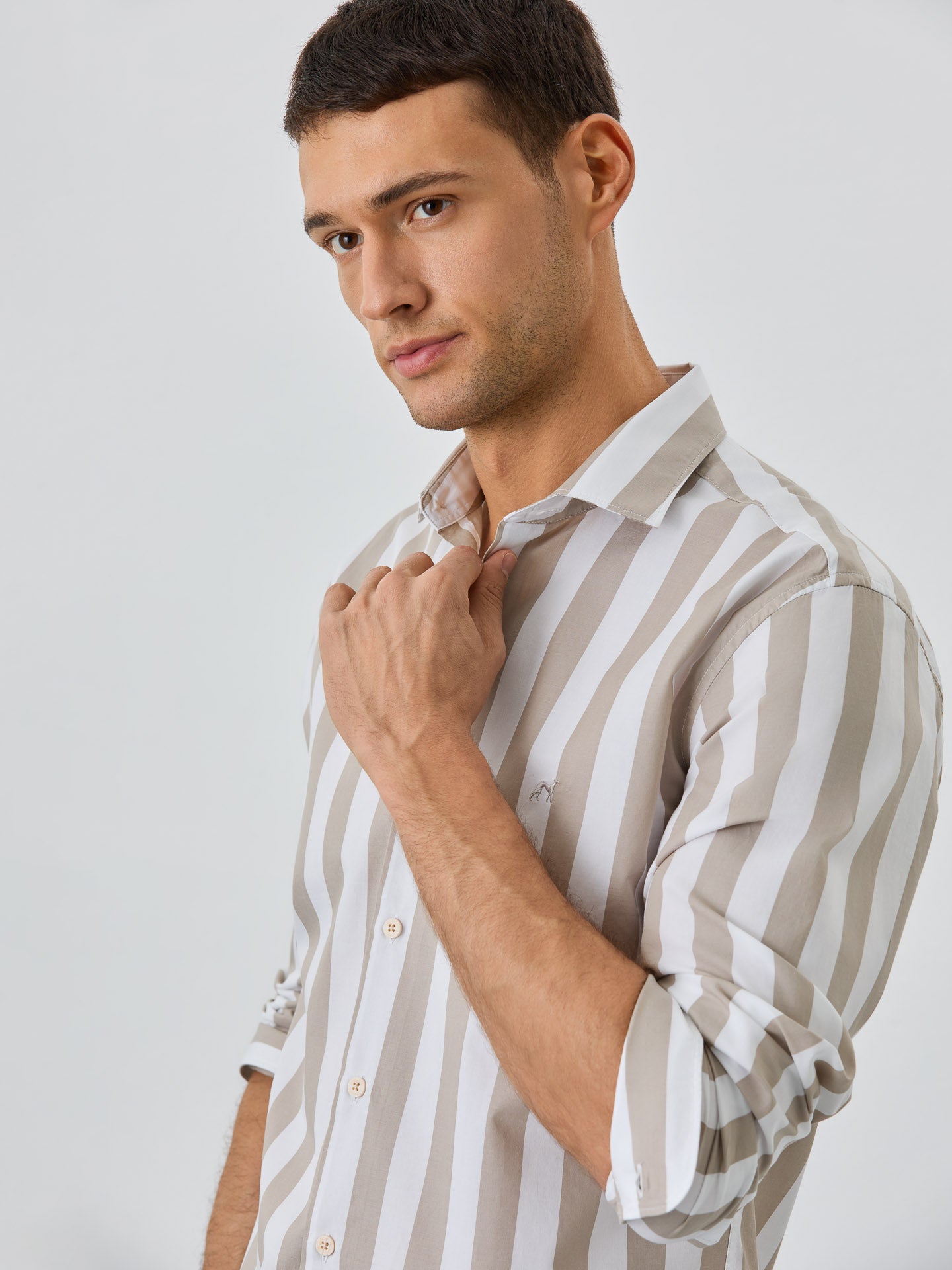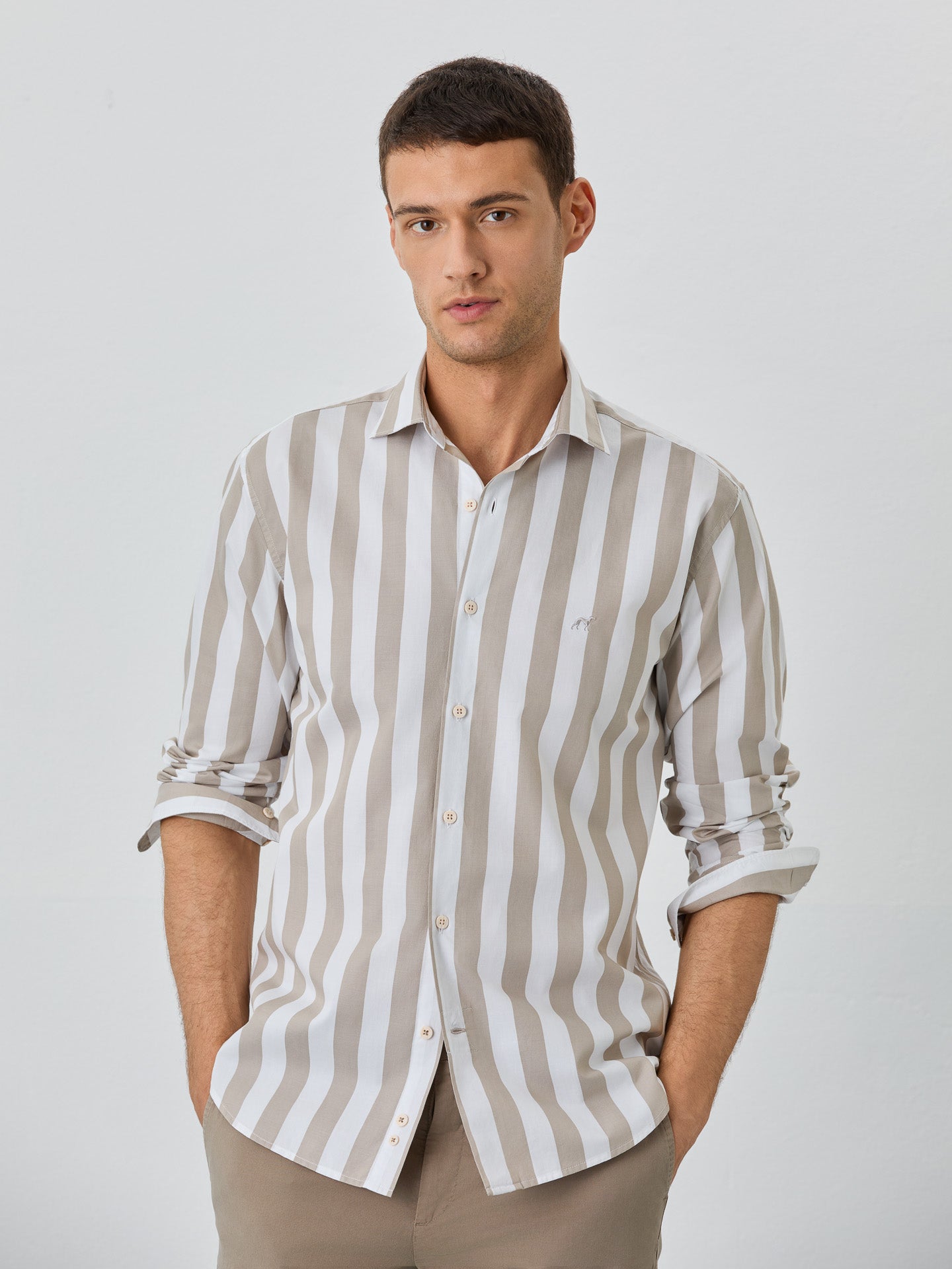 Slim Fit Shirt With Open Collar In BCI Cotton With Stripes