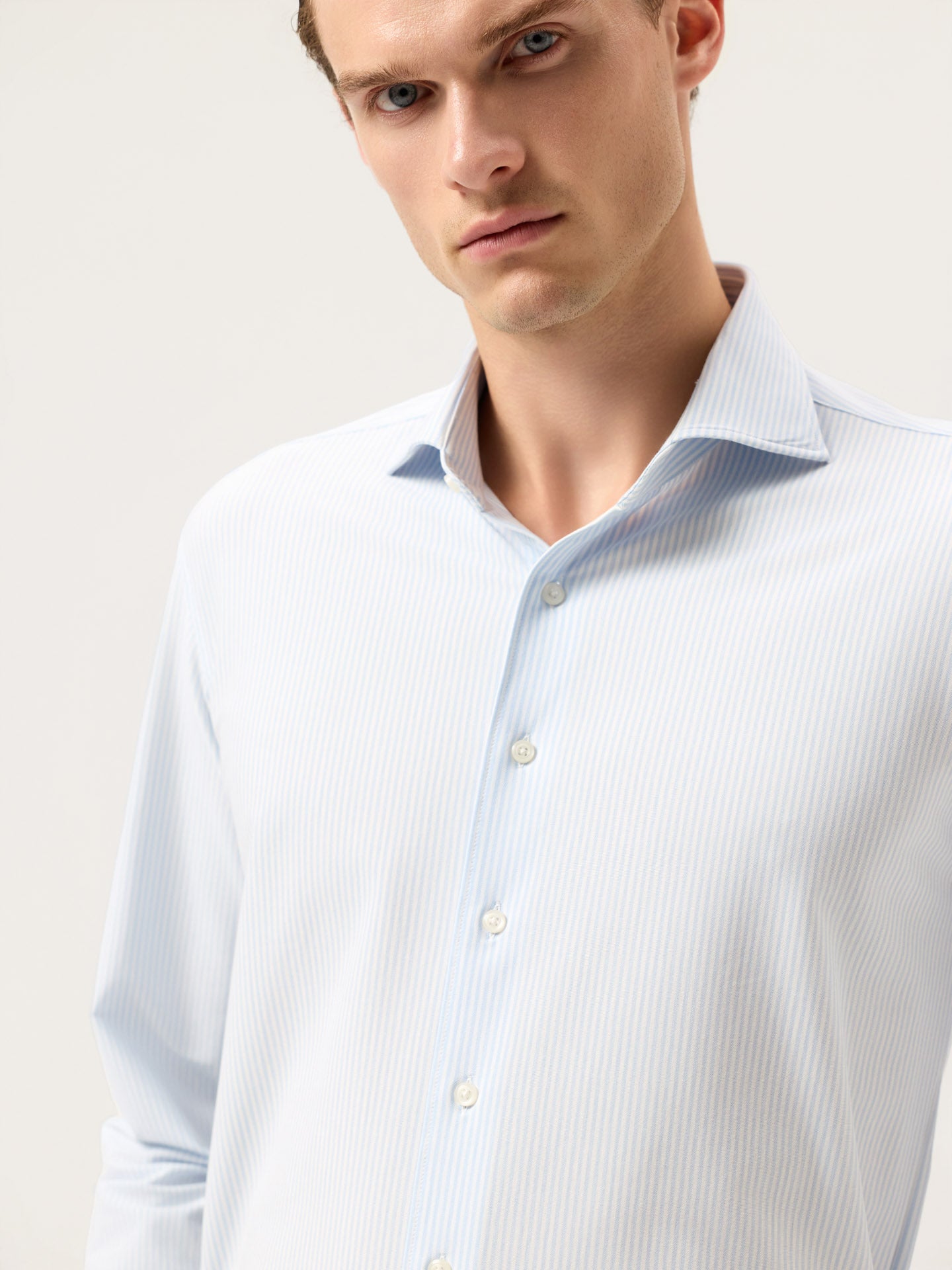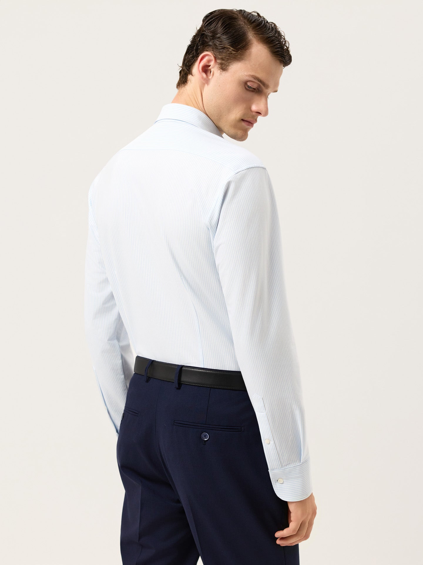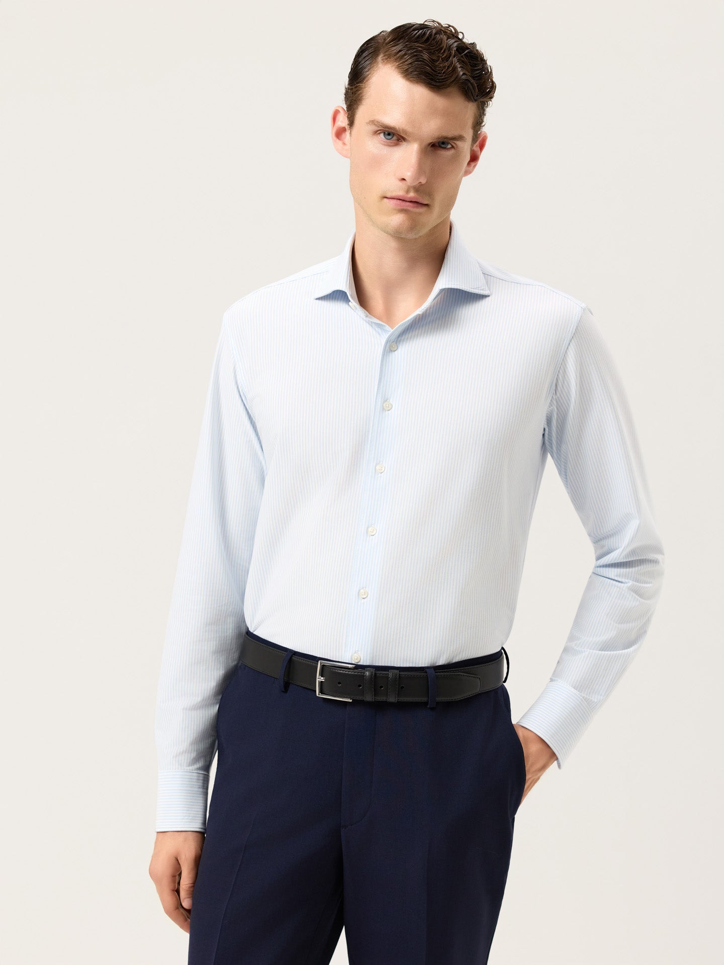 This long-sleeve shirt is cut in a slim fit from a travel jersey fabric with a refined stripe pattern, offering lightweight comfort and refined structure. It features a Newport collar, single placket, and standard cuffs. The shirt includes a discreet pleat on the sleeve, triangle inserts at the side seams in self-fabric, a horizontal last buttonhole in contrast thread, and off-white buttons. Detailed with removable collar stays, and reinforced construction for durability. Available in regular fit sizes starting from size 44. This shirt is perfect for office wear and any occasion where a sharp look matters.