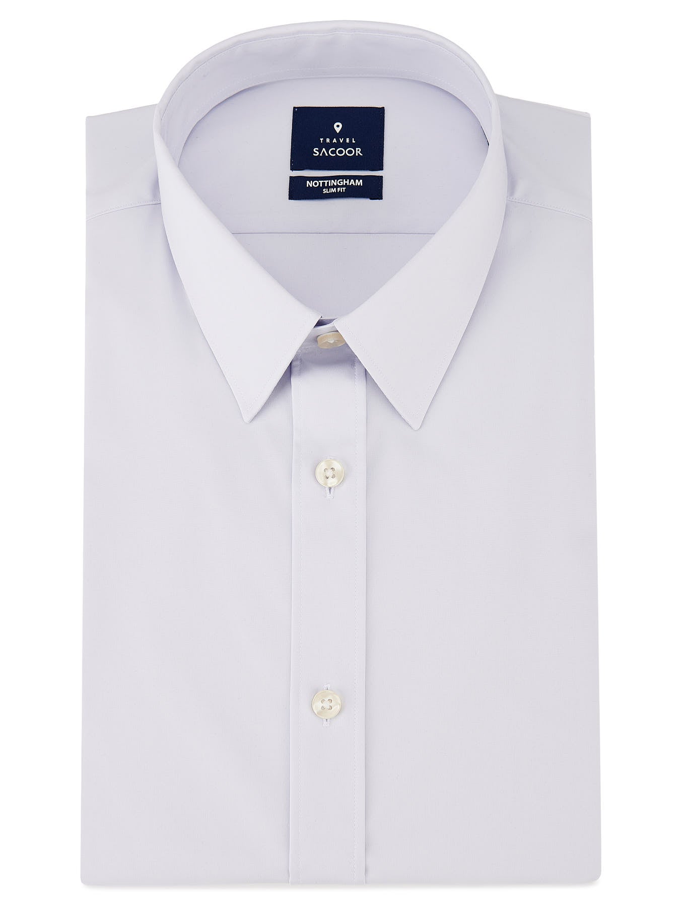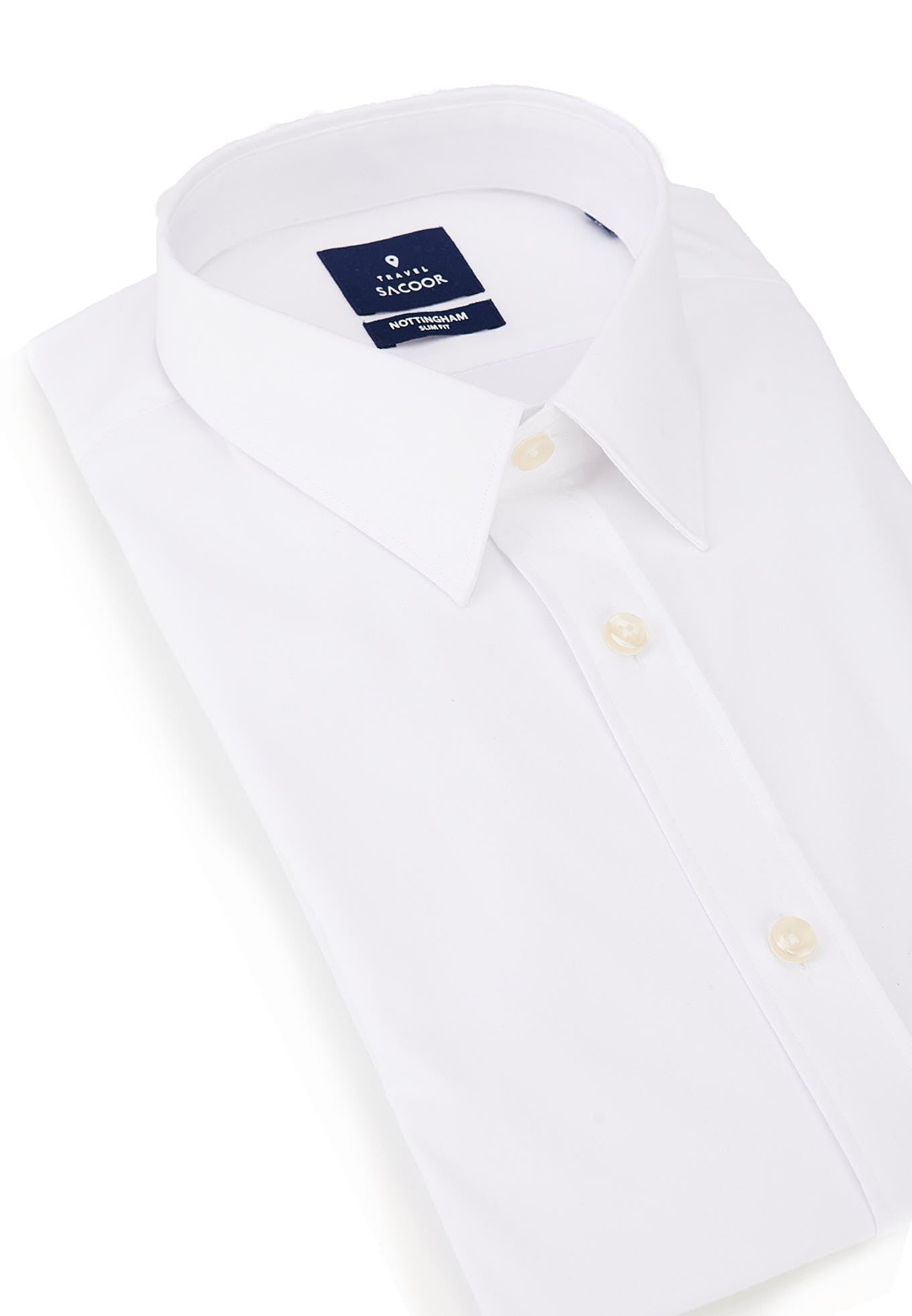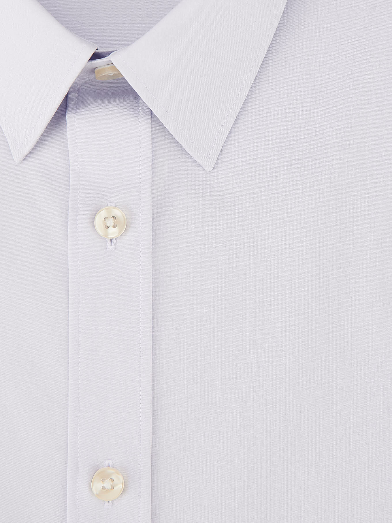 Travel line shirt in plain 120's fabric made of blended cotton and elastane. With exceptional looks and utmost care this slim fit shirt has special details such as engraved buttons on single placket. Featuring a Nottingham collar and front fastening through seven buttons. Long sleeves with single cuffs with 1 button. Side gussets in self fabric.