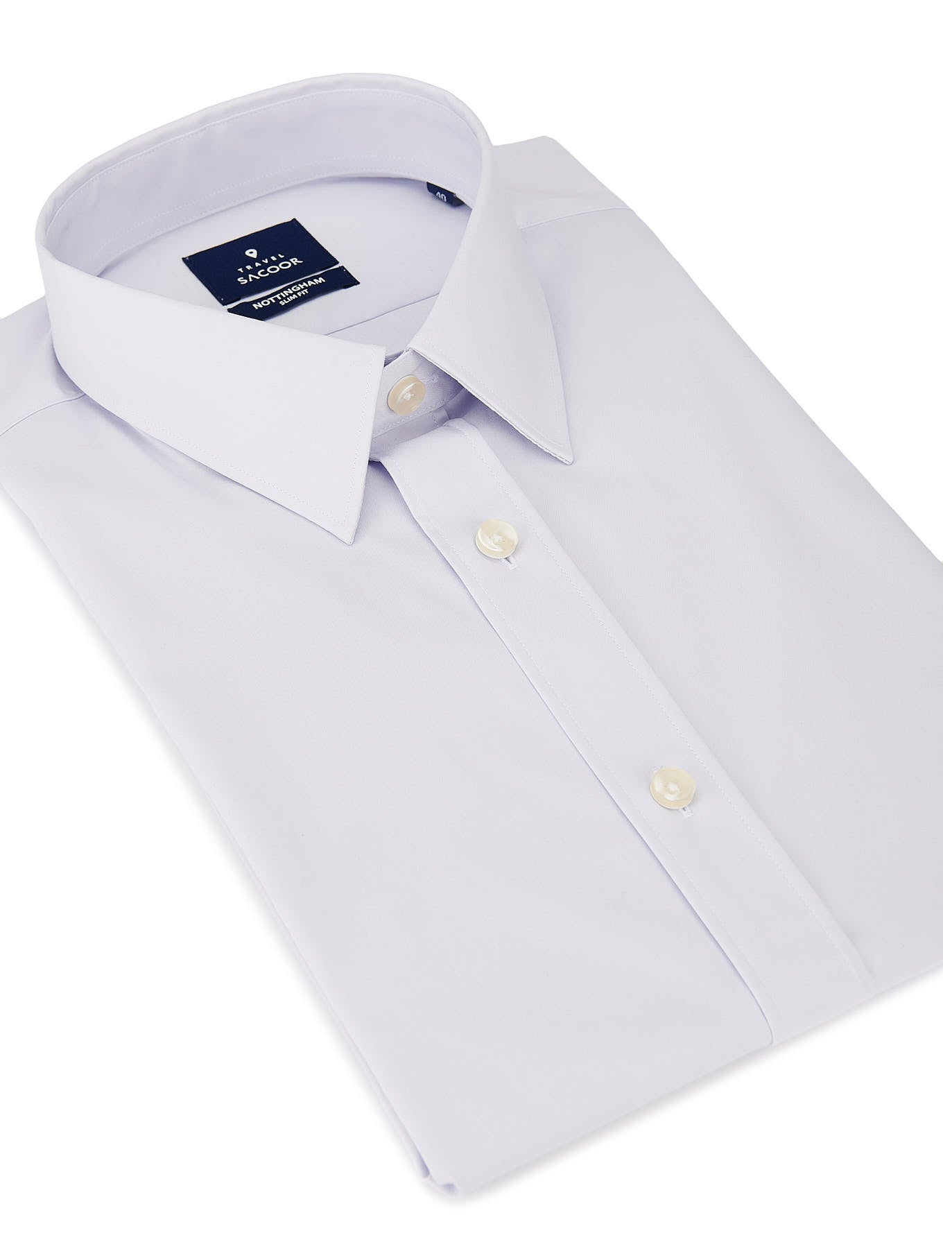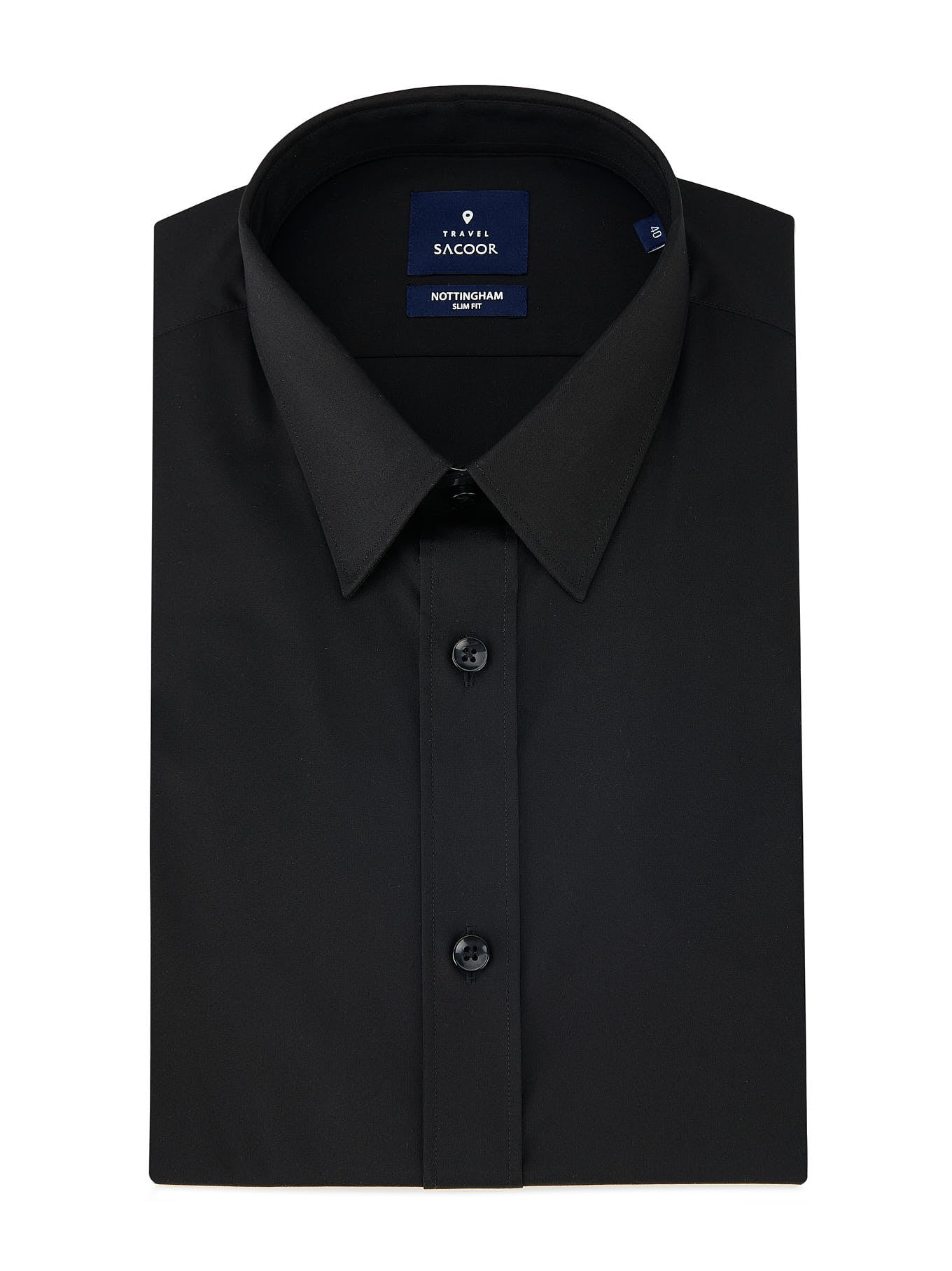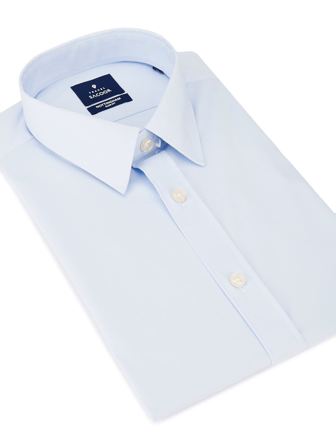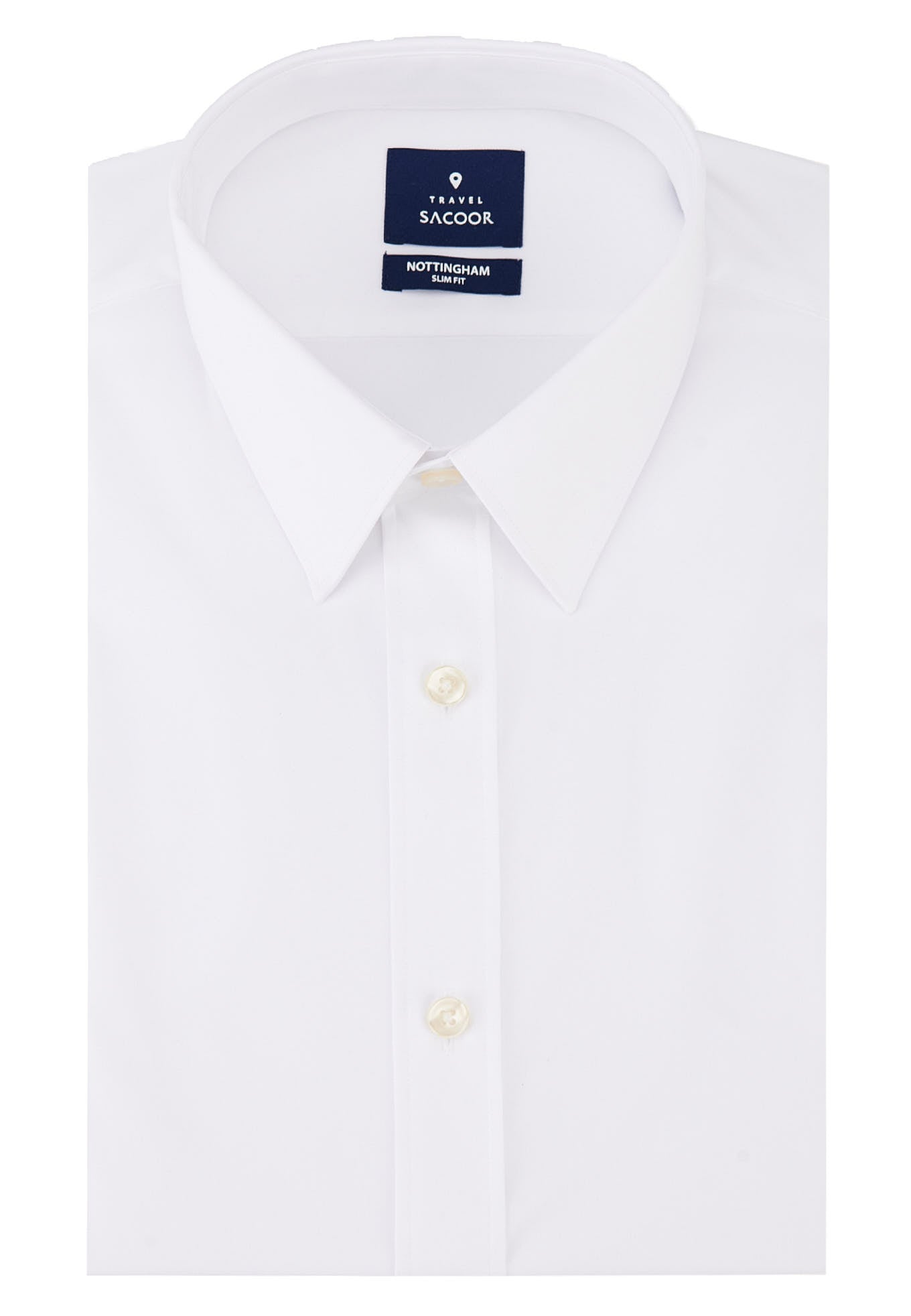Travel line shirt in plain 120's fabric made of blended cotton and elastane. With exceptional looks and utmost care this slim fit shirt has special details such as engraved buttons on single placket. Featuring a Nottingham collar and front fastening through seven buttons. Long sleeves with single cuffs with 1 button. Side gussets in self fabric.