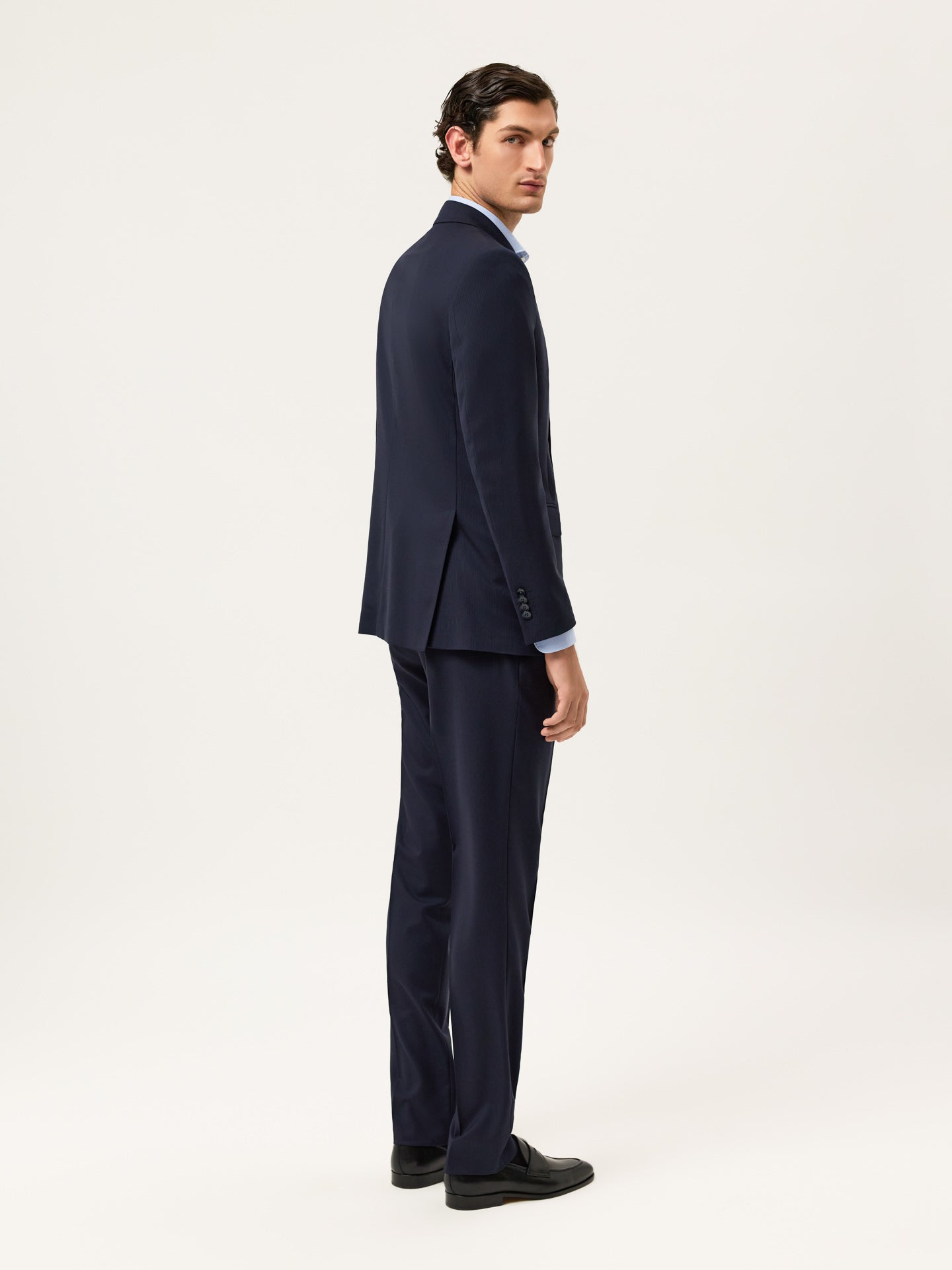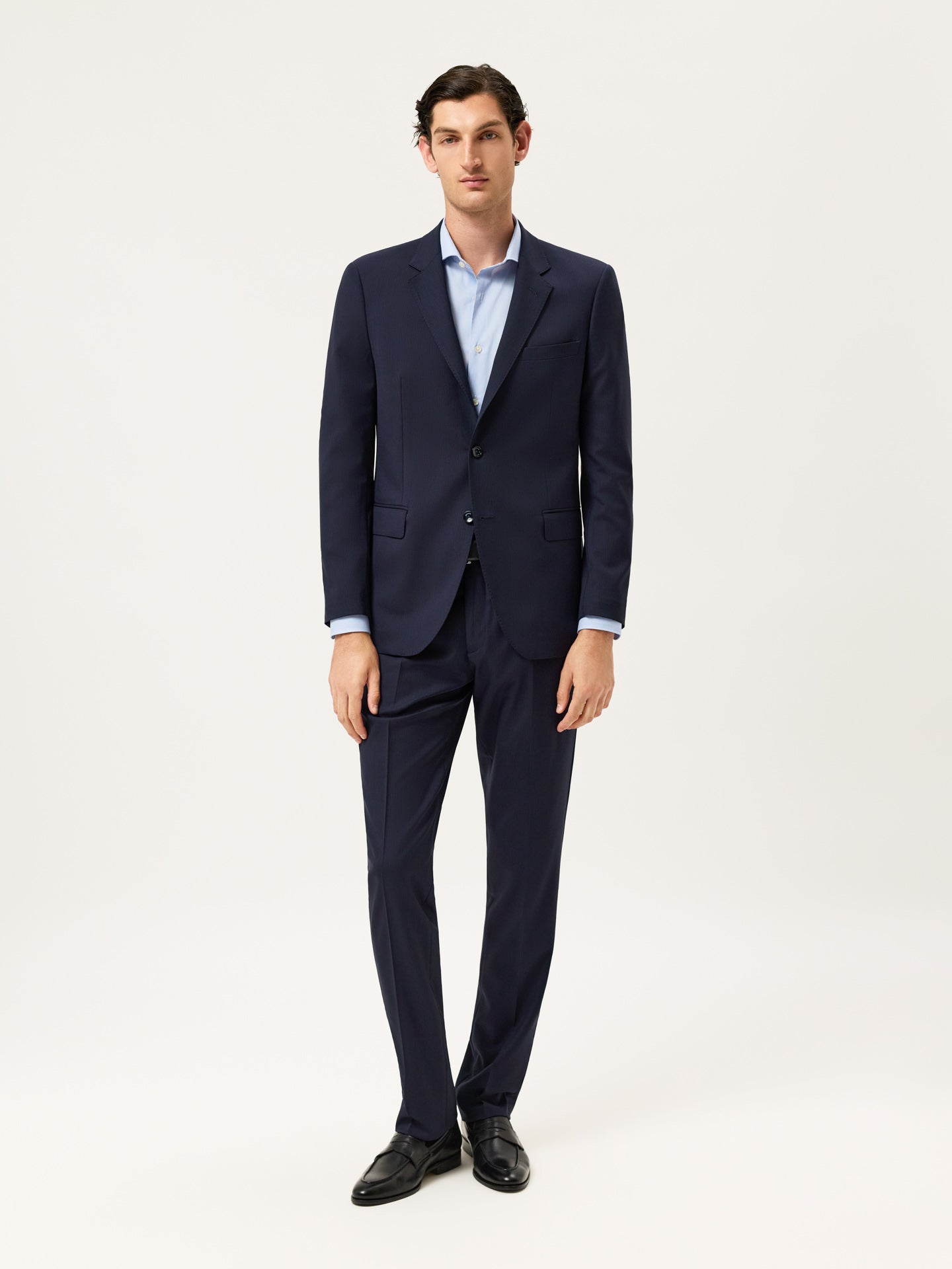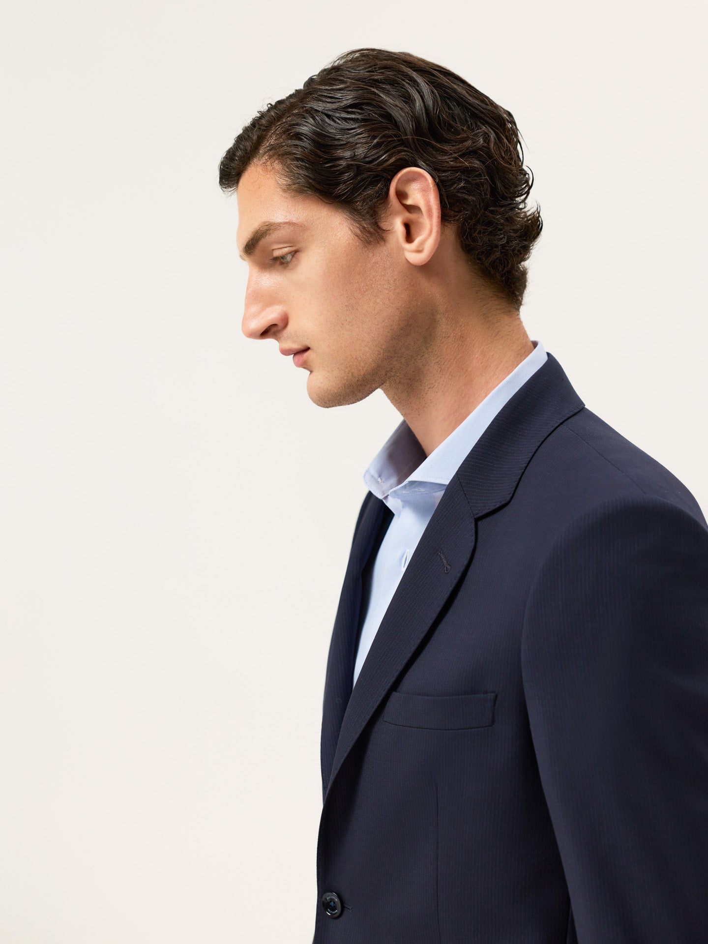Designed for dynamic lifestyles, this slim-fit travel suit is tailored using premium Italian Super 150’s wool, offering wrinkle resistance, natural stretch, and refined comfort. The blazer features overlapping 4-button closure, two back vents, AMF hand-stitching, flap pockets with double pipings, and a self-fabric undercollar. Fully lined in personalized jacquard for ease and elegance. The trousers include a coin pocket, extension with hook, and discreet knife pocket with tone-on-tone pic-pic stitch. A Sacoor travel pin and engraved buttons complete this sophisticated and functional set. Available in regular Fit measurements from size 56 to 62. Ideal for the office and any situation where a sharp look matters.