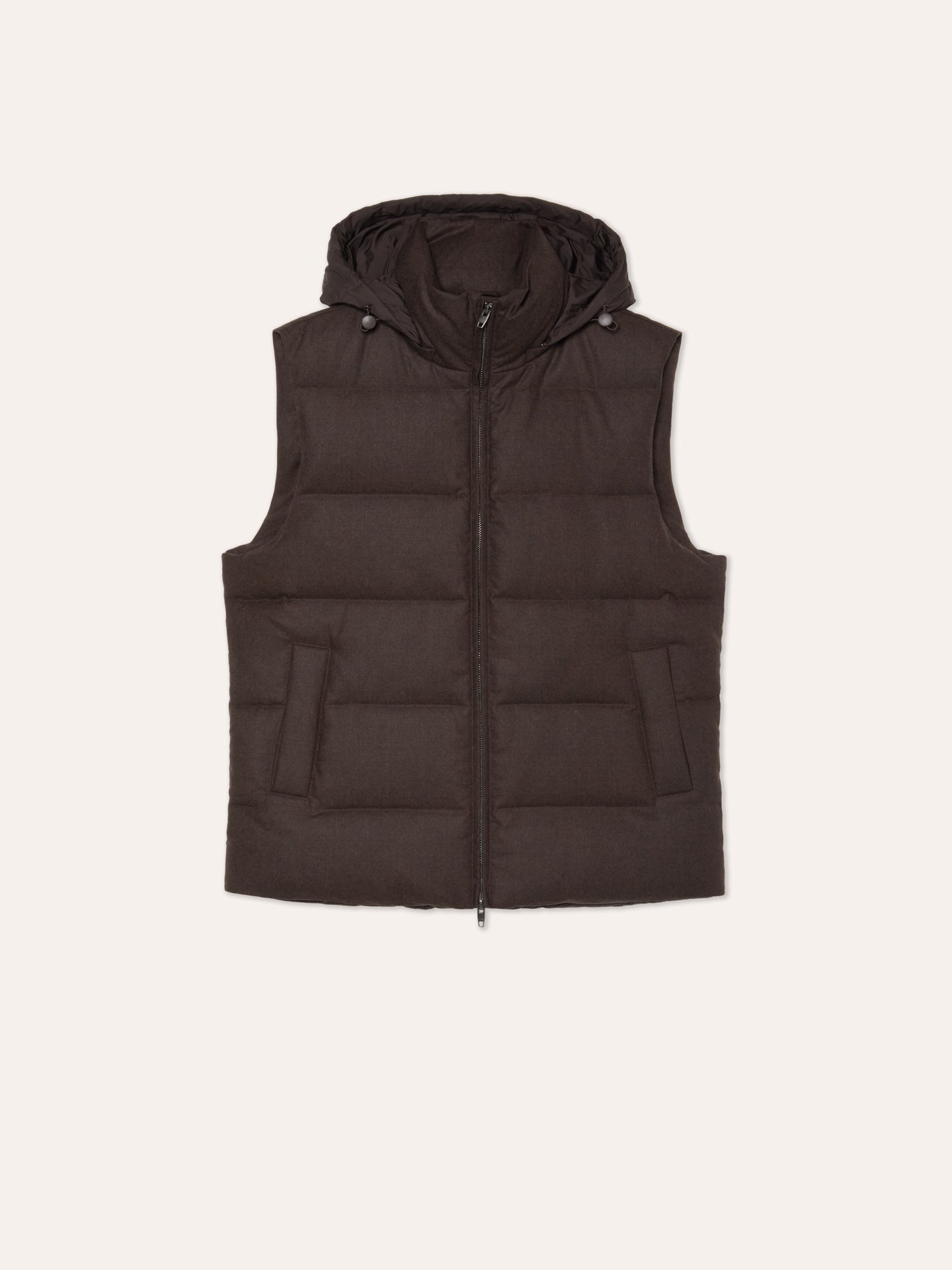 Sophisticated and warm, this waistcoat combines the luxurious texture of wool melange flannel at the front with a smooth polyester back and hood in a perfectly matched tone. It is padded with real down for excellent insulation and features horizontal quilting for a clean, structured look. Designed with a detachable hood, side welt pockets, and a double metal zipper puller on the front. The interior is fully lined with tonal piping and practical inner pockets. Finished with a metallic logo plate at the back collar and premium hardware in gunmetal shine.