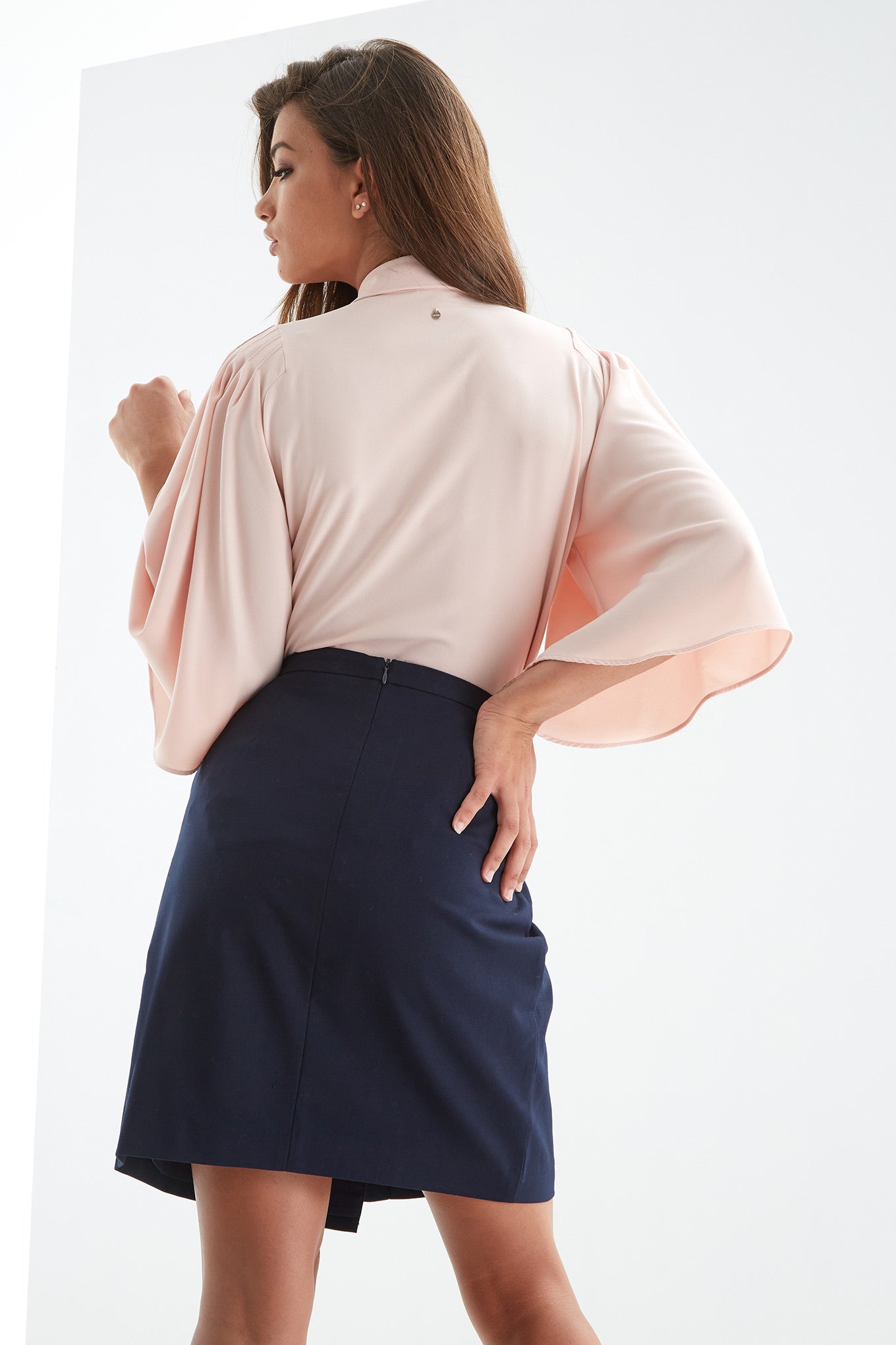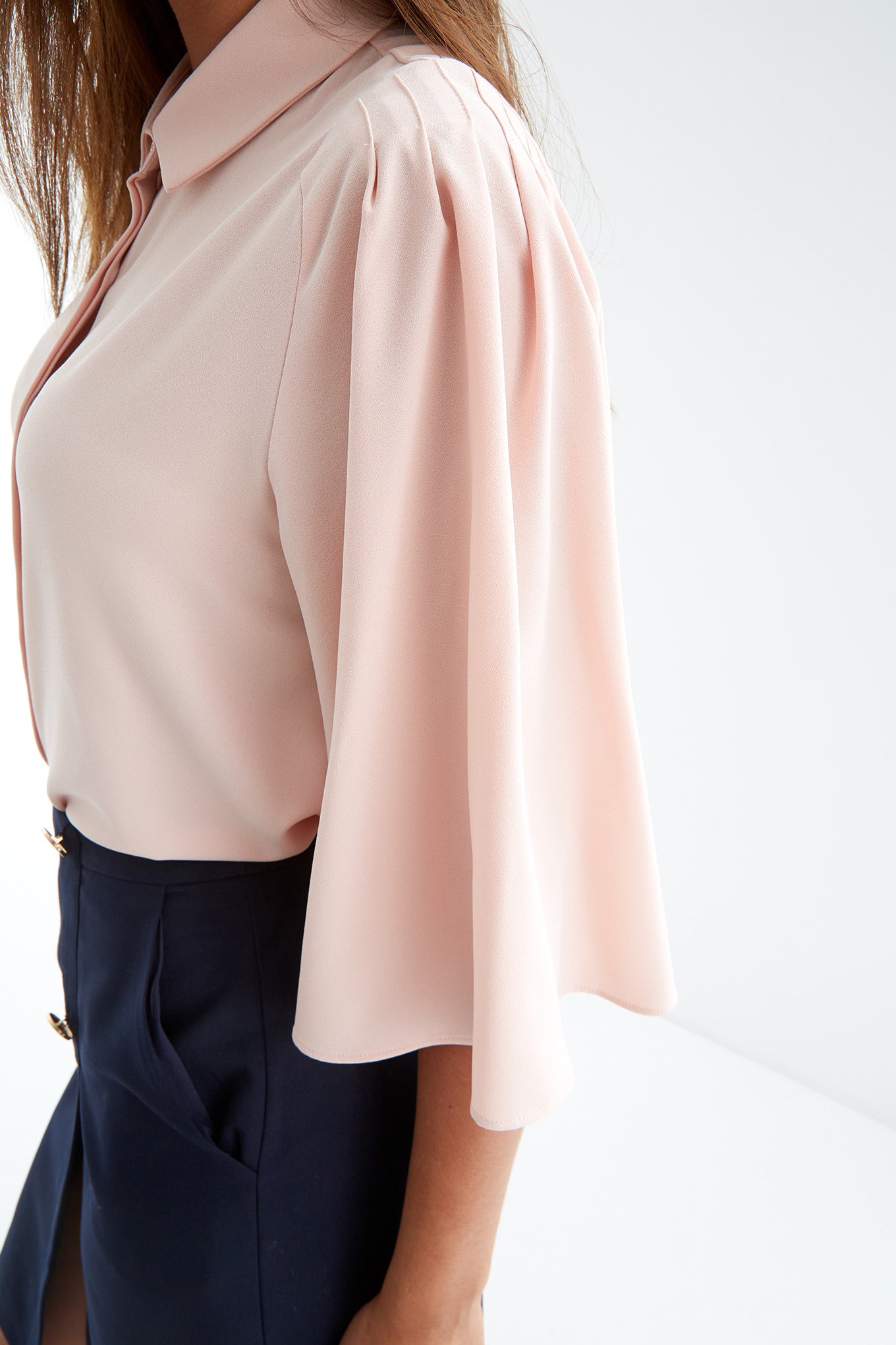 Women's elbow length bell sleeved fantasy blouse. Soft crepe blouse with collar and front button fastening.