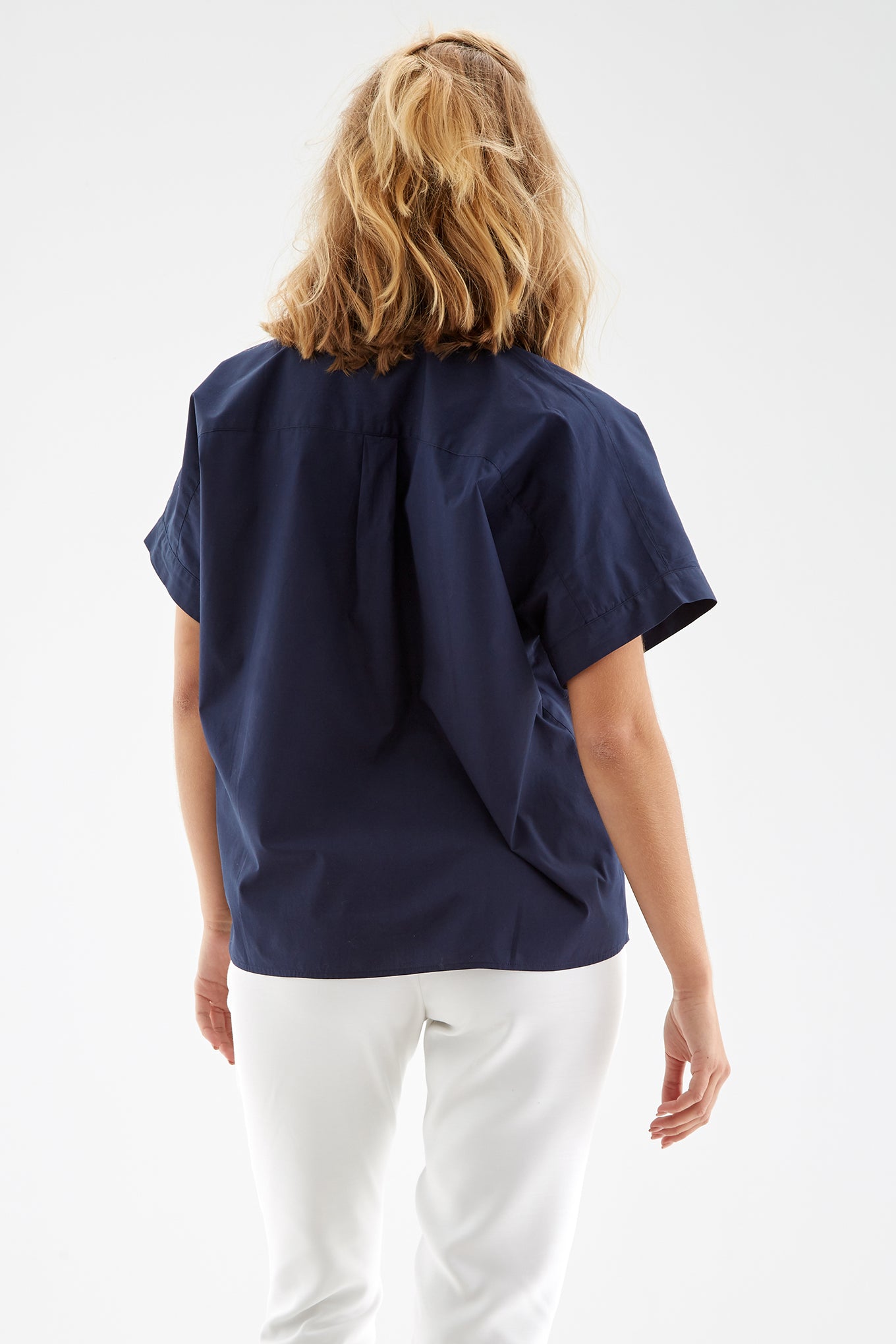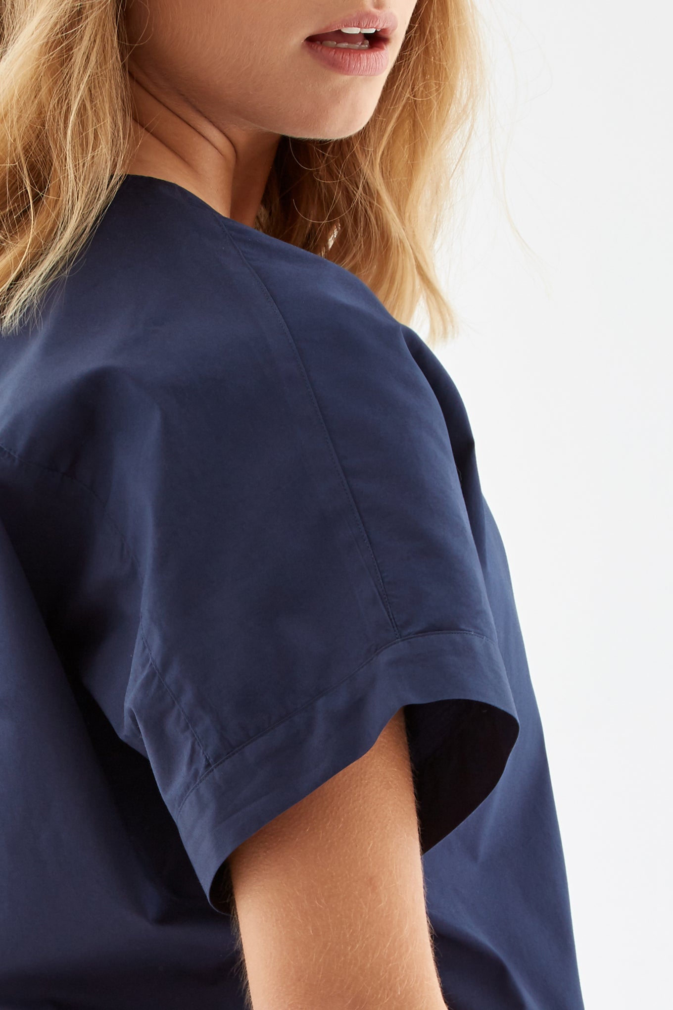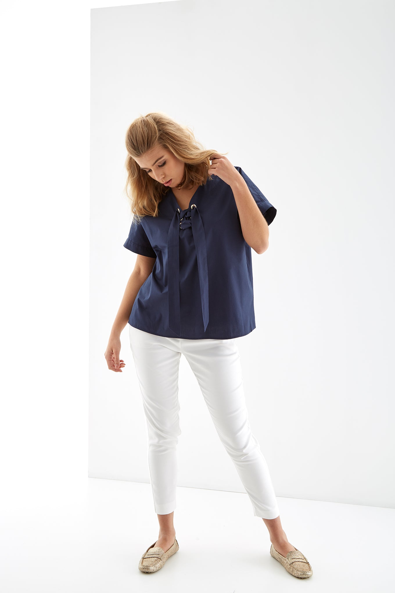 Women's relaxed fit casual blouse. V-neck with eyelets and tie detail on the neckline. Short kimono-style sleeves. Made of 100% cotton. From the 2018 Summer Collection on sale at Sacoor Brothers' online store.