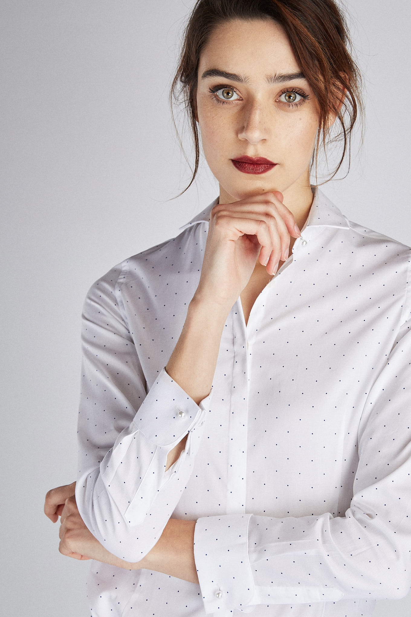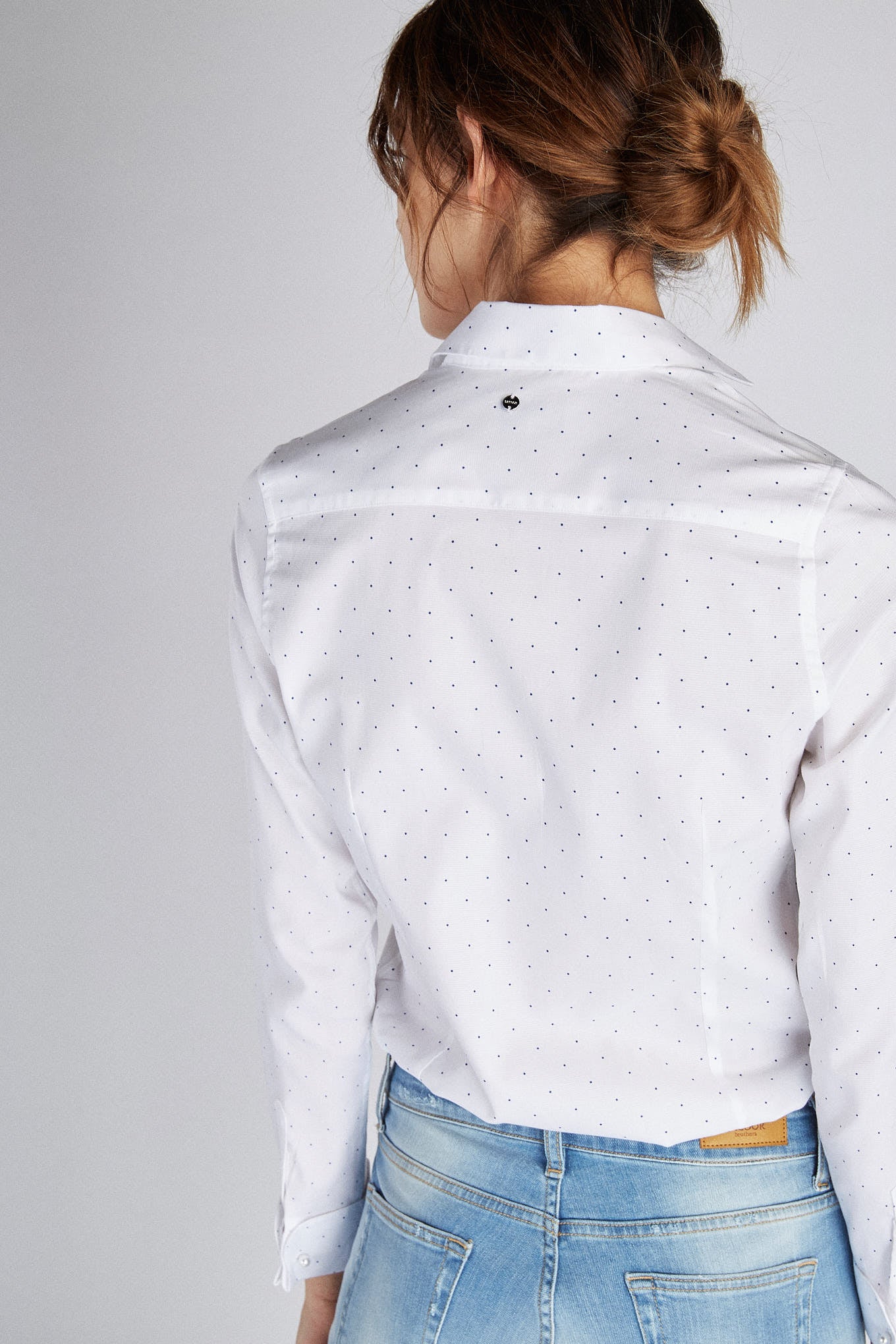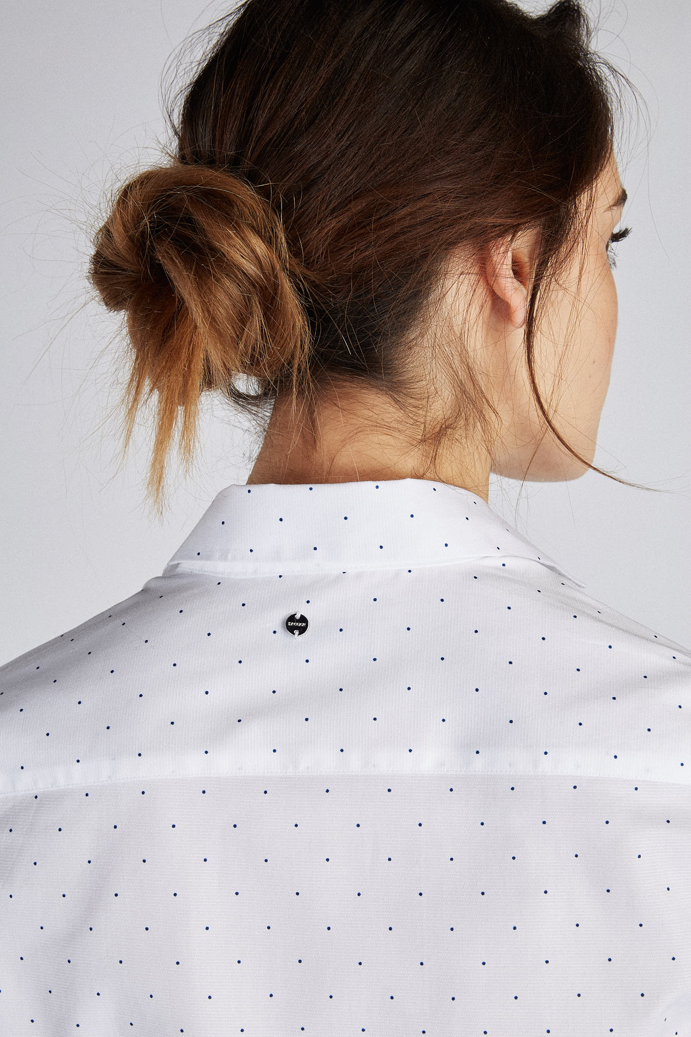 Woman's shirt with slight dotted pattern. Regular collar with pearl effect first button and the others hidden. Double cuff with pearl effect buttons. English stitching, more comfortable and for a quality finish. Very elegant shirt for wearing at the office or on more formal occasions. Sacoor Women's size 36 back length is 68 cm and sleeve length is 60 cm. See our Size Guide.