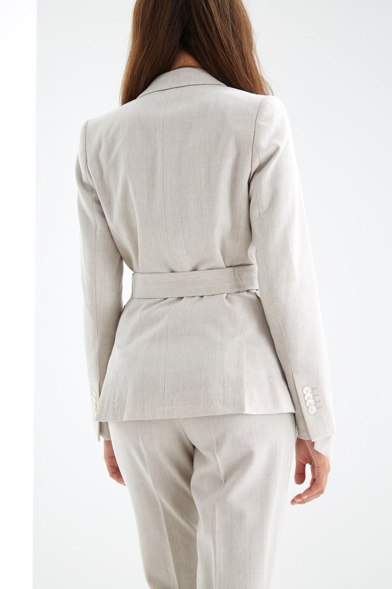 The ideal suit for the modern and sophisticated woman. This Fall, follow the trend and choose the neutral and timeless suit. This blazer comes with a pocket handkerchief. Back length on size 36 is 64cm and sleeve length is 61cm. Creased trousers with zip fastening and waist with belt loops. Ankle width on size 36 is 16cm.