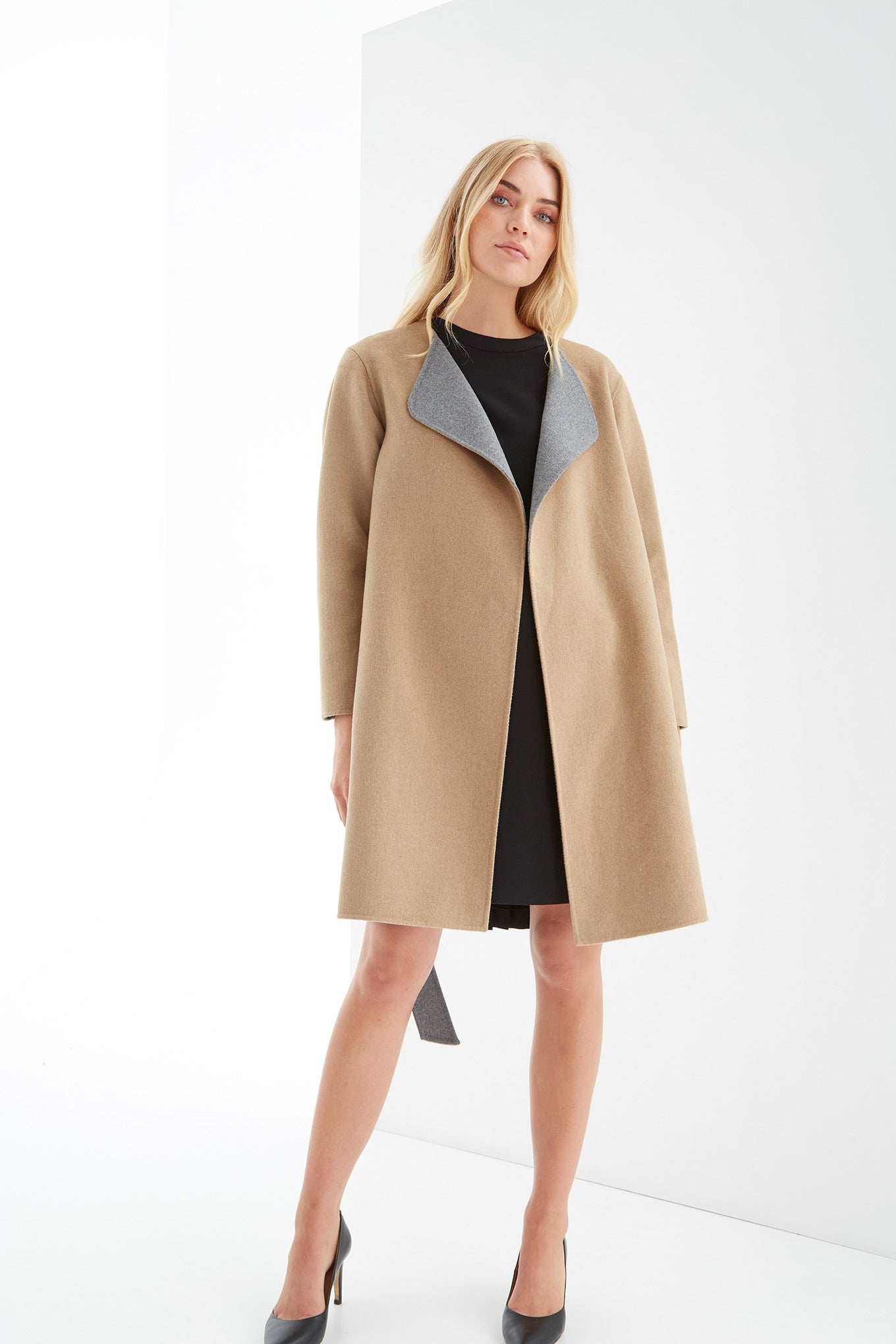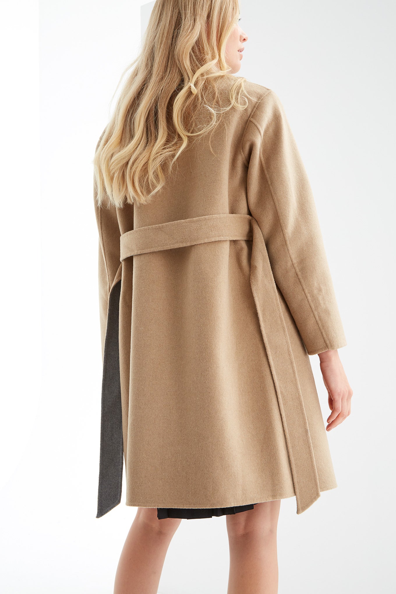An essential piece for practical women, ensuring elegance every day. Choose this wool overcoat with handmade finish and combine with casual pieces or with an executive look. Reversible knee-length model with belt and two pockets.