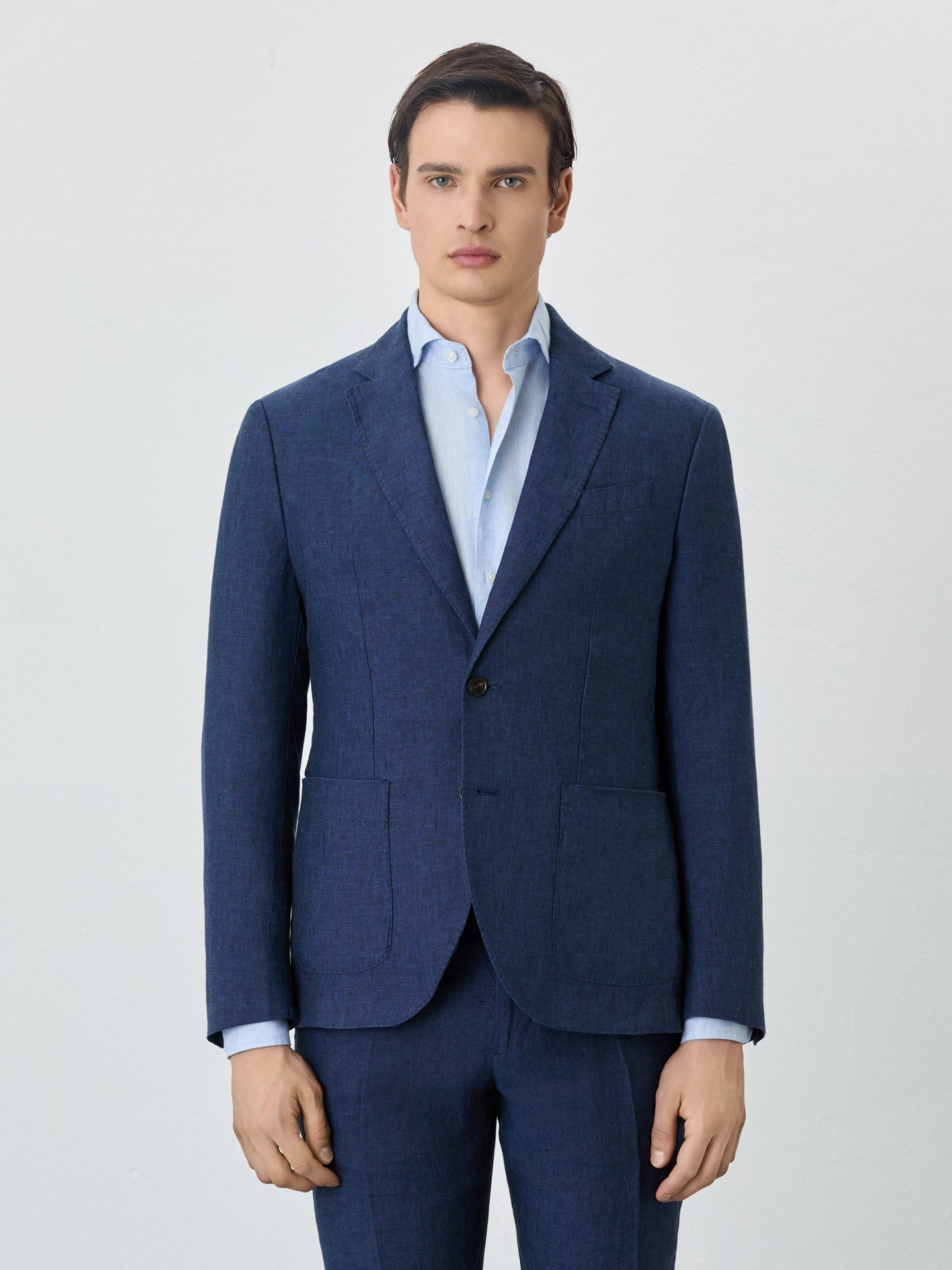 A summery modern linen dyed blazer, expertly tailored from 100% linen. This elegant suit blazer is tailored to a defined fit for a contemporary silhouette. Style with notch lapels, two-button closure, patch pockets and two back vents. Sleeves with four-button cuffs. It's partially lined. All blazers have regular fitting measures from sizes 56 to 62. This blazer is sure to become your summer favourite blazer. Blazer comes with special pin on lapel with the Sacoor Brothers logo. Fabric by Di Sondrio, italian brand which stands for luxury and quality. Special note: This blazer has a matching trouser with the same fabric.