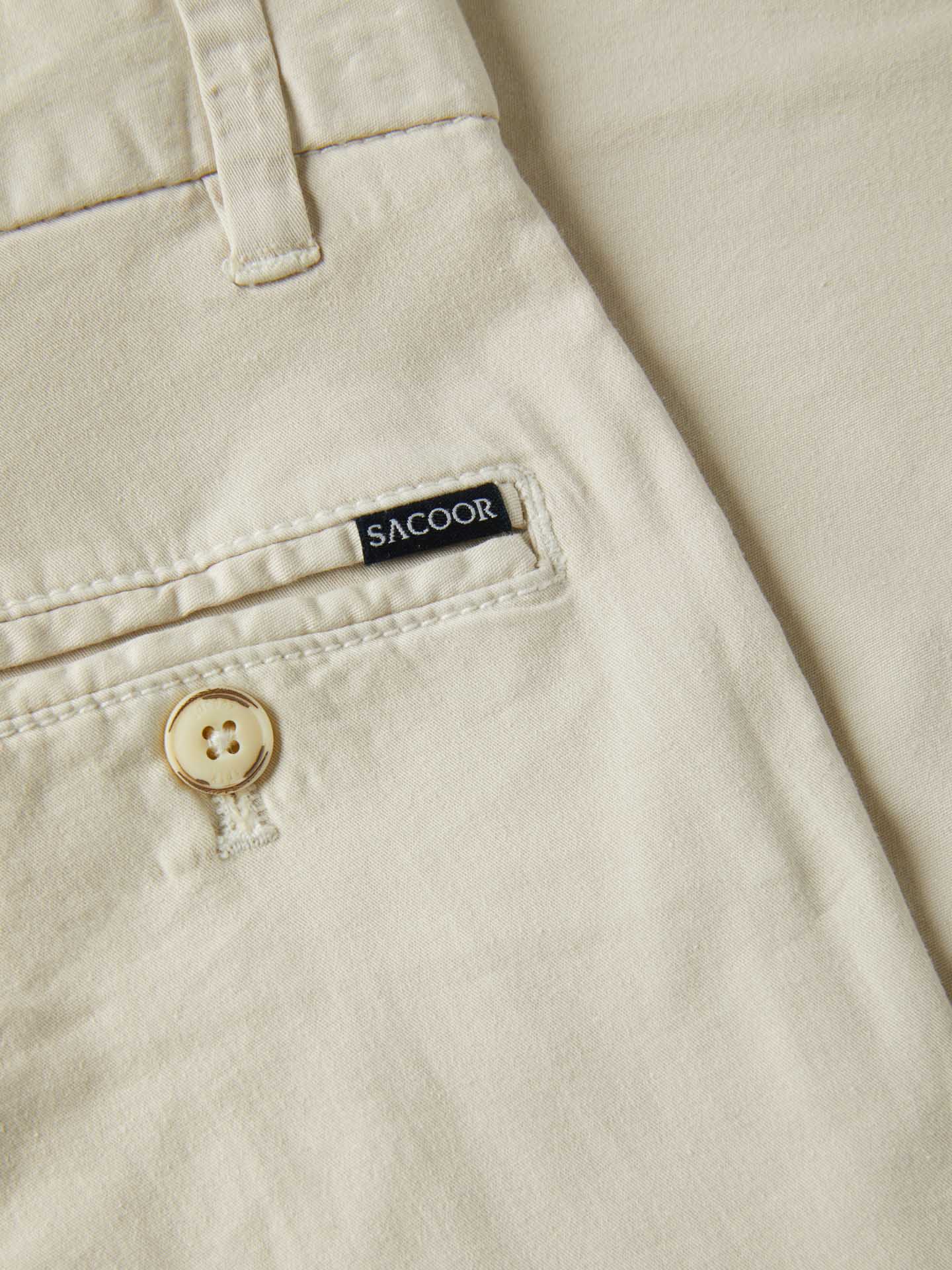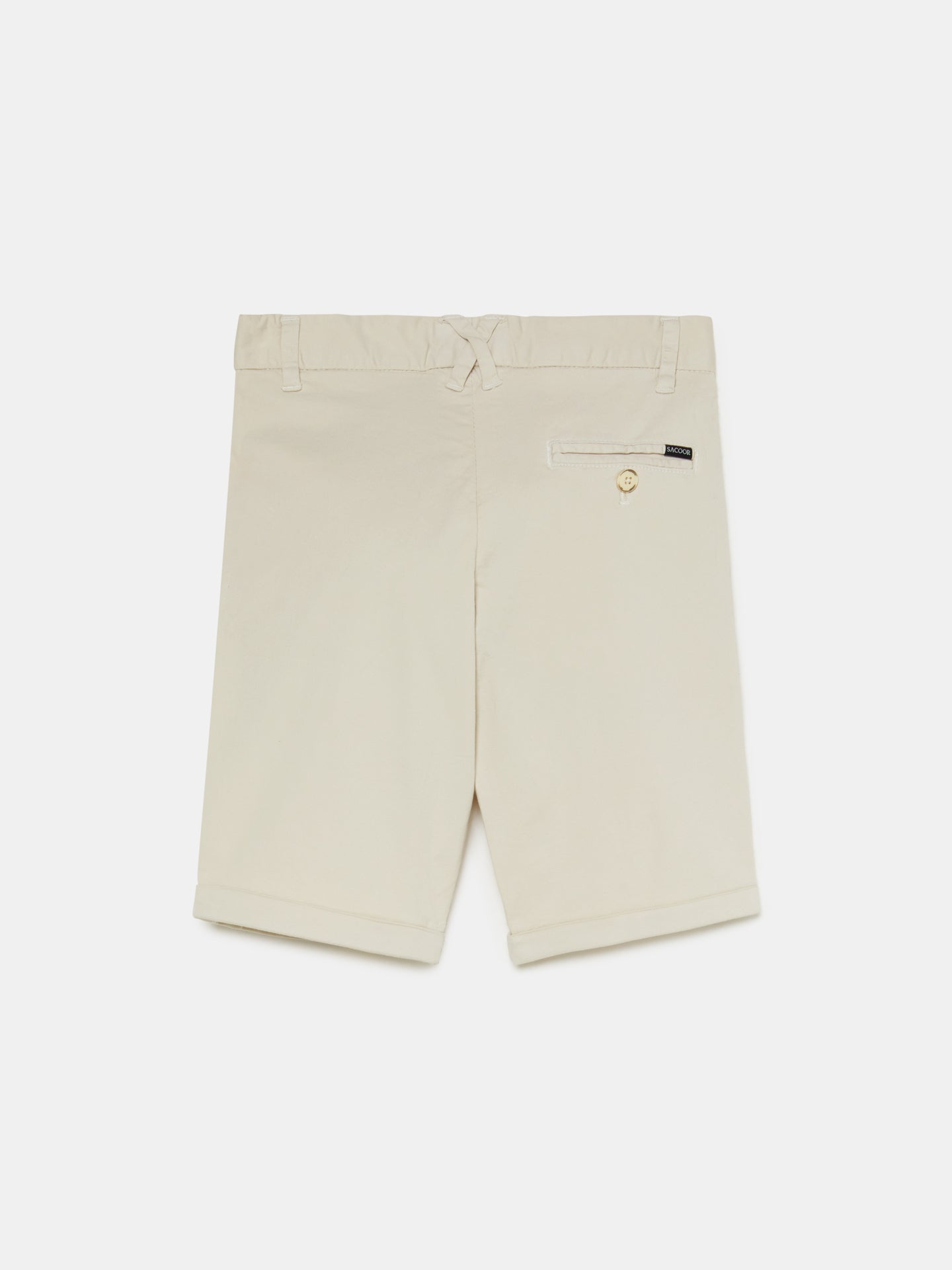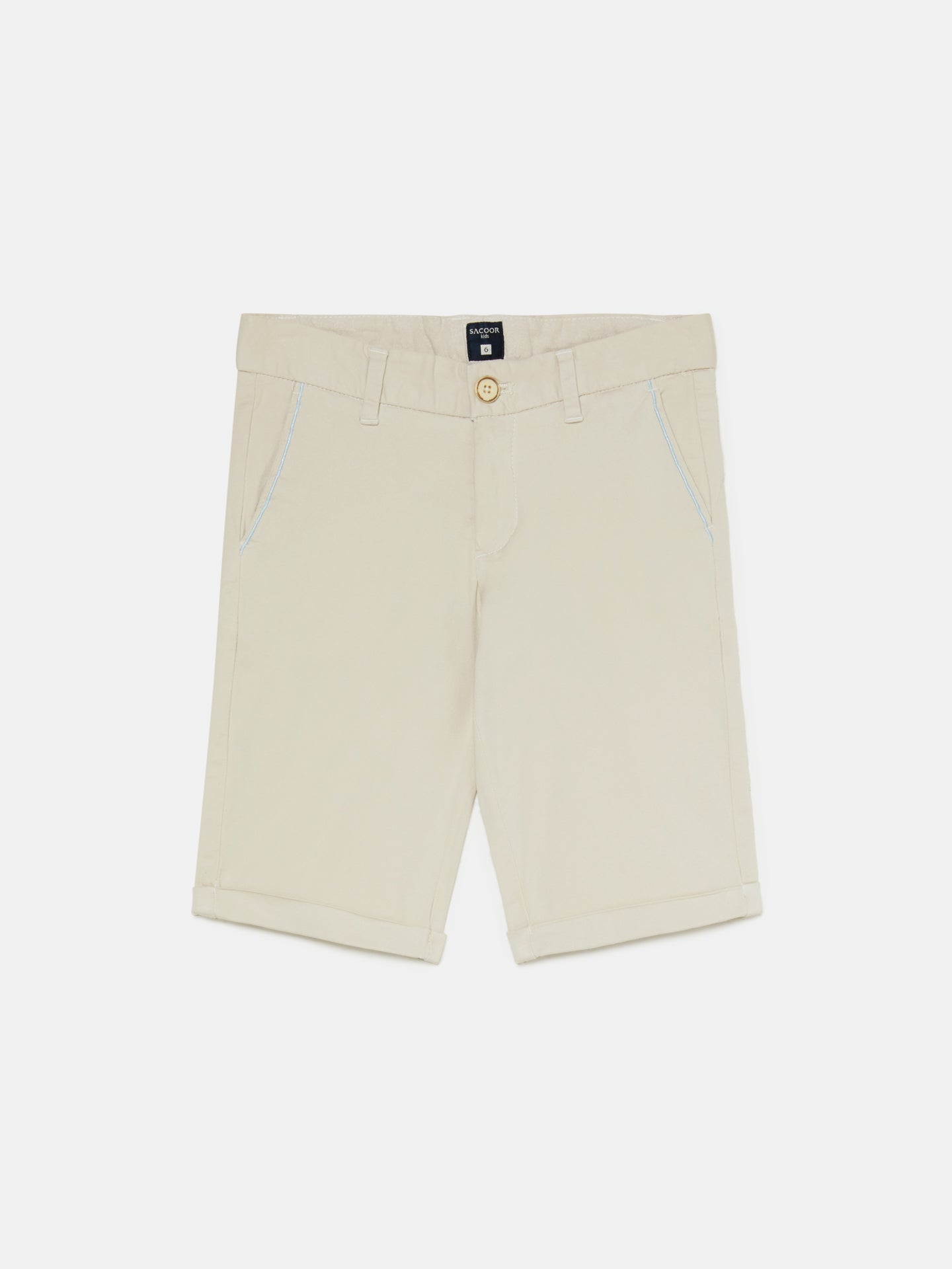 Plain colour garment dye bermuda shorts in cotton elastane fabric for maximum comfort. Closure through zip fly and button at waistband, slash pockets at ffront with 2 contrast embroidery stripes, belt loops, welt pocket with button on the back and Sacoor Flag Label.