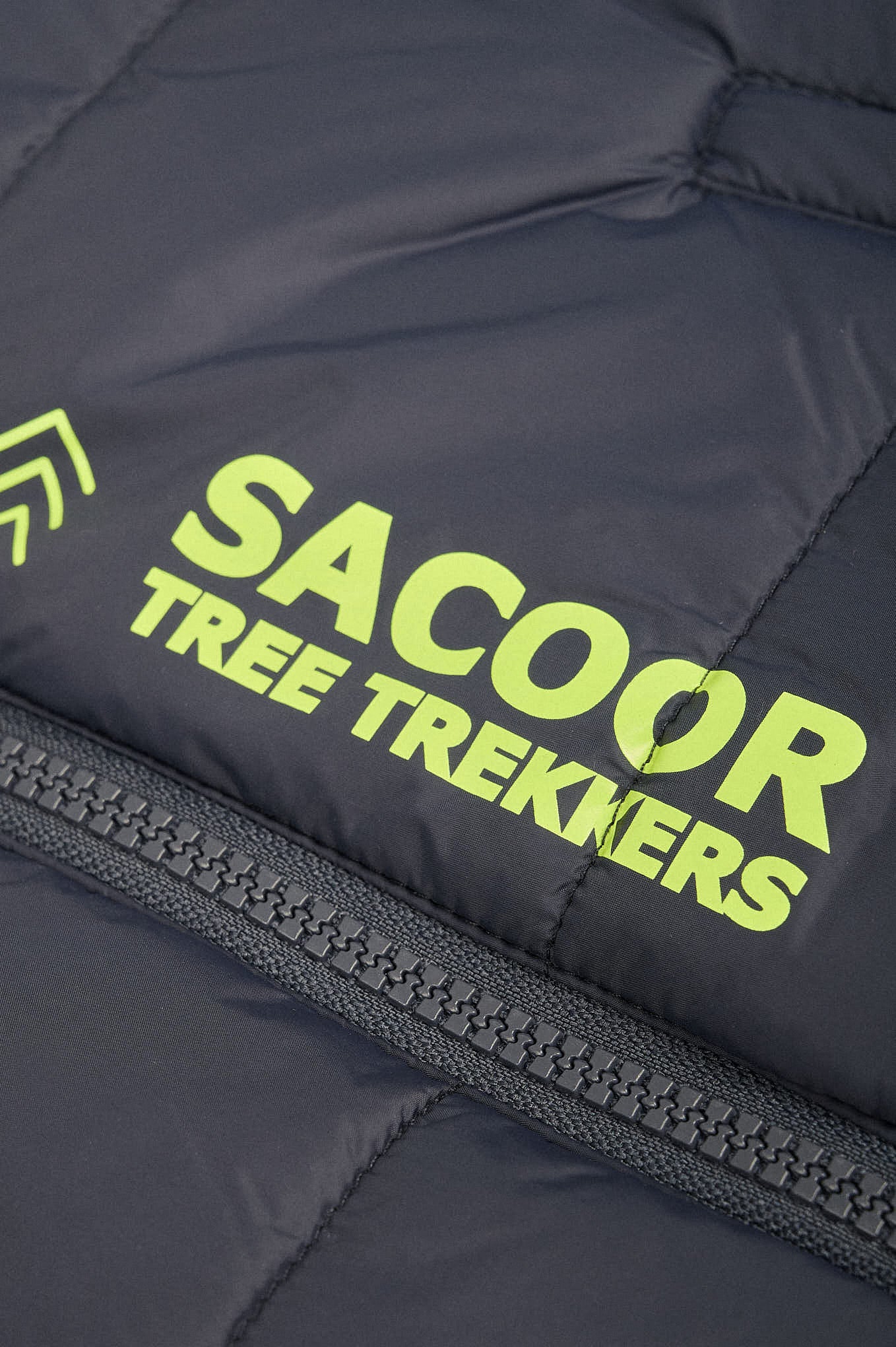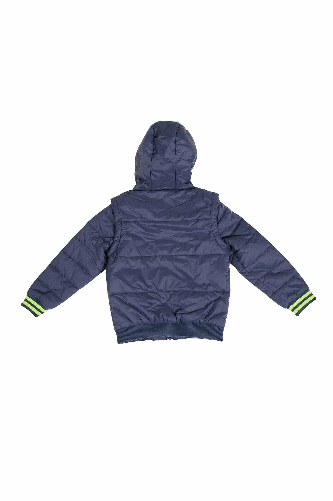 Boy's jacket,softly padded made with recycled nylon, with original neon print on the front. The sleeves are removable and it transformes into a waistcoat. With hood that has camouflage print interior. Ribbed cuffs with contrast neon stripes. 2 welt pockets. Close with zip. Interior with camouflage print and personalized tape.