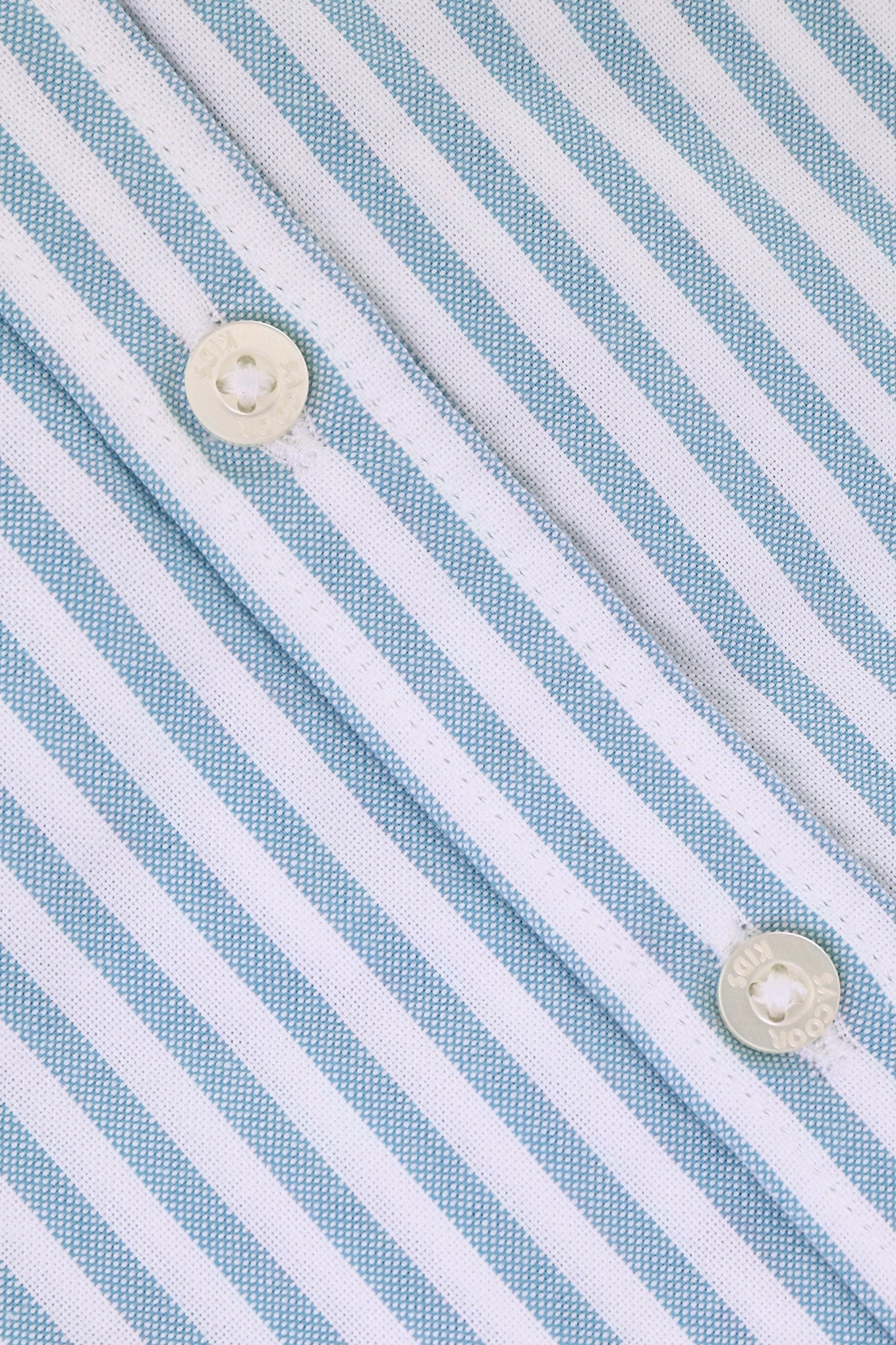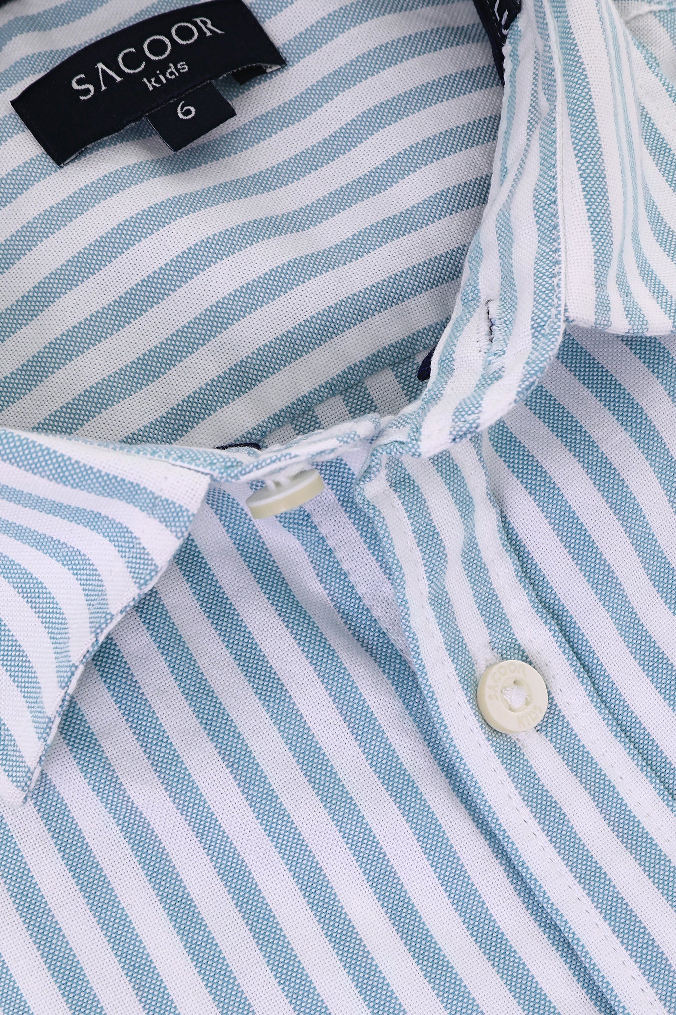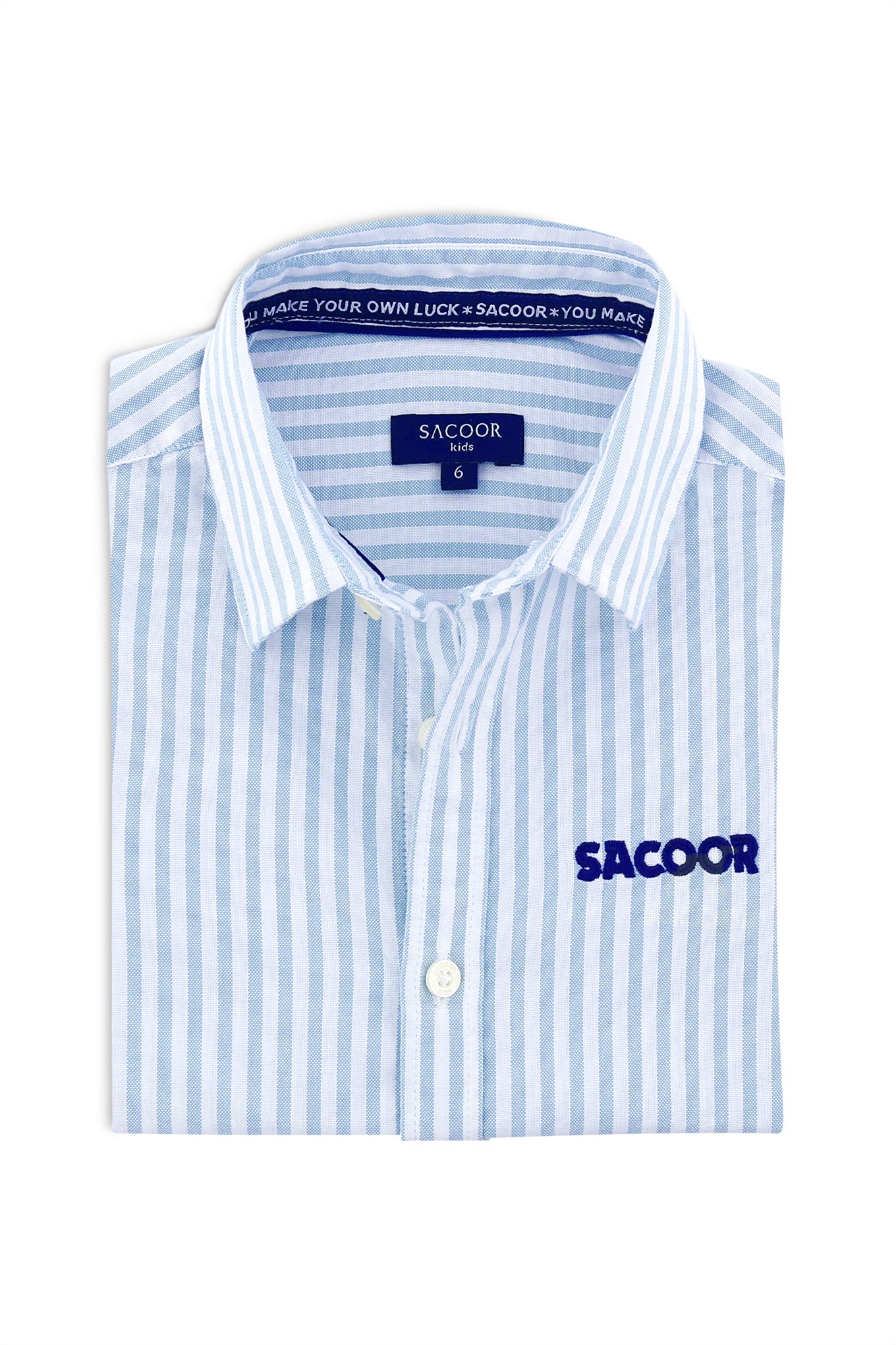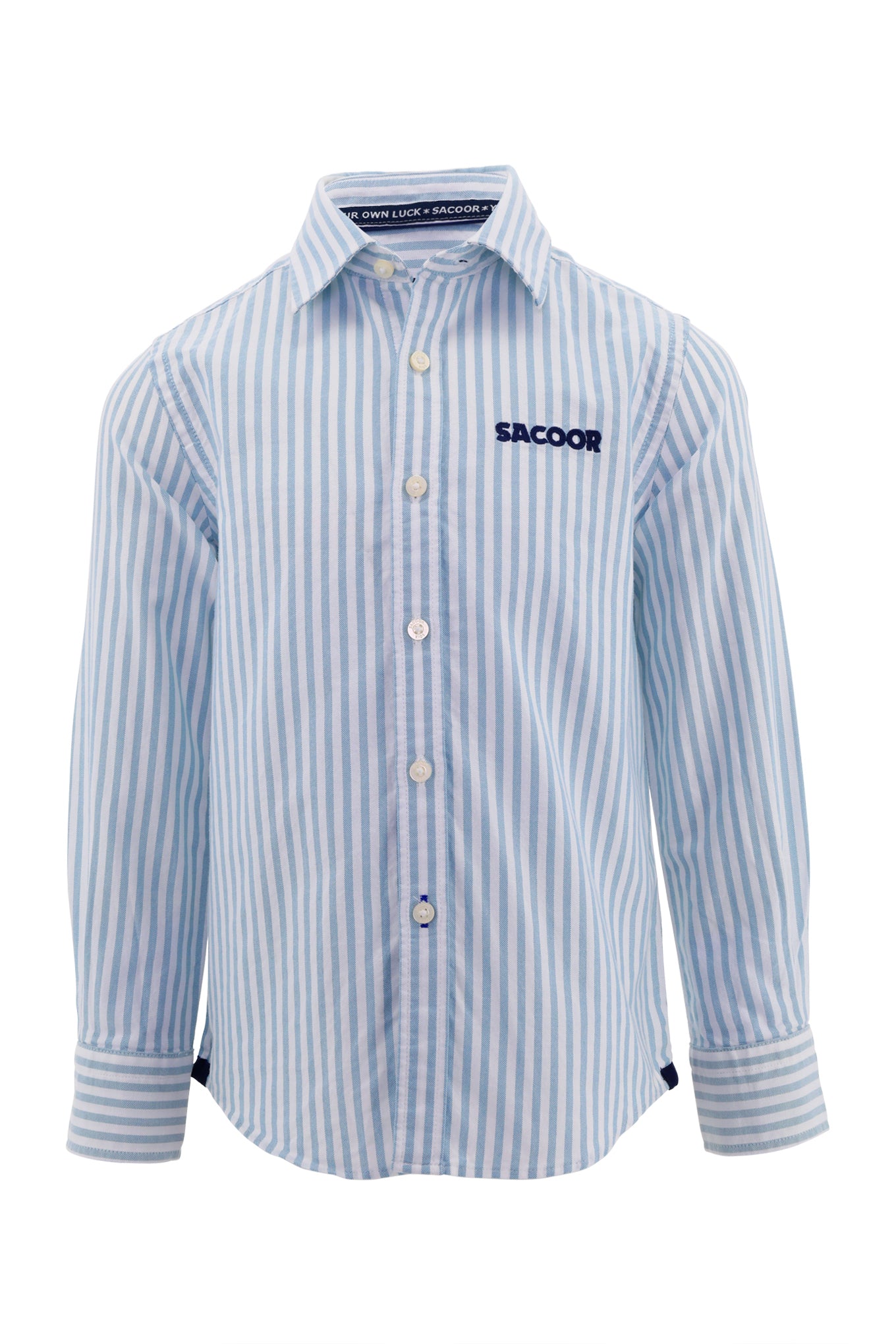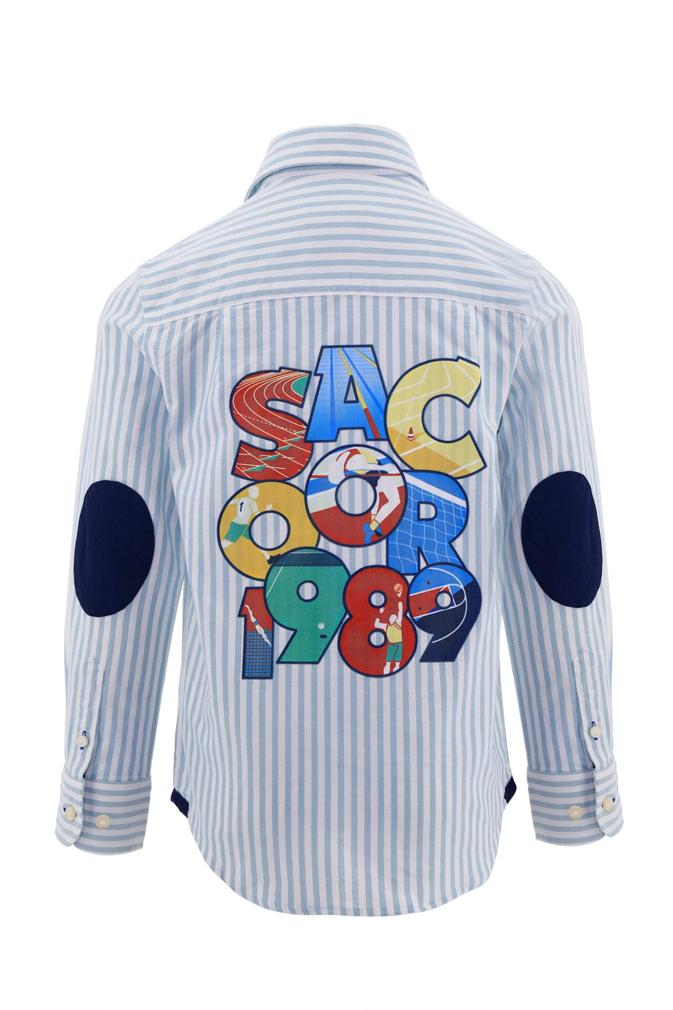 Striped shirt made of 100% cotton fabric. Features a button-up front and long sleeves with single cuffs with two buttons. Side patch in contrast fabric. "SACOOR" embroidery in contrast color. Sports inspired print on the back ad elbow patch in contrast fabric.