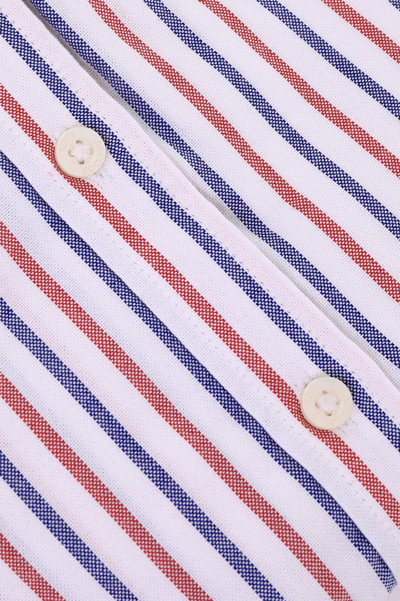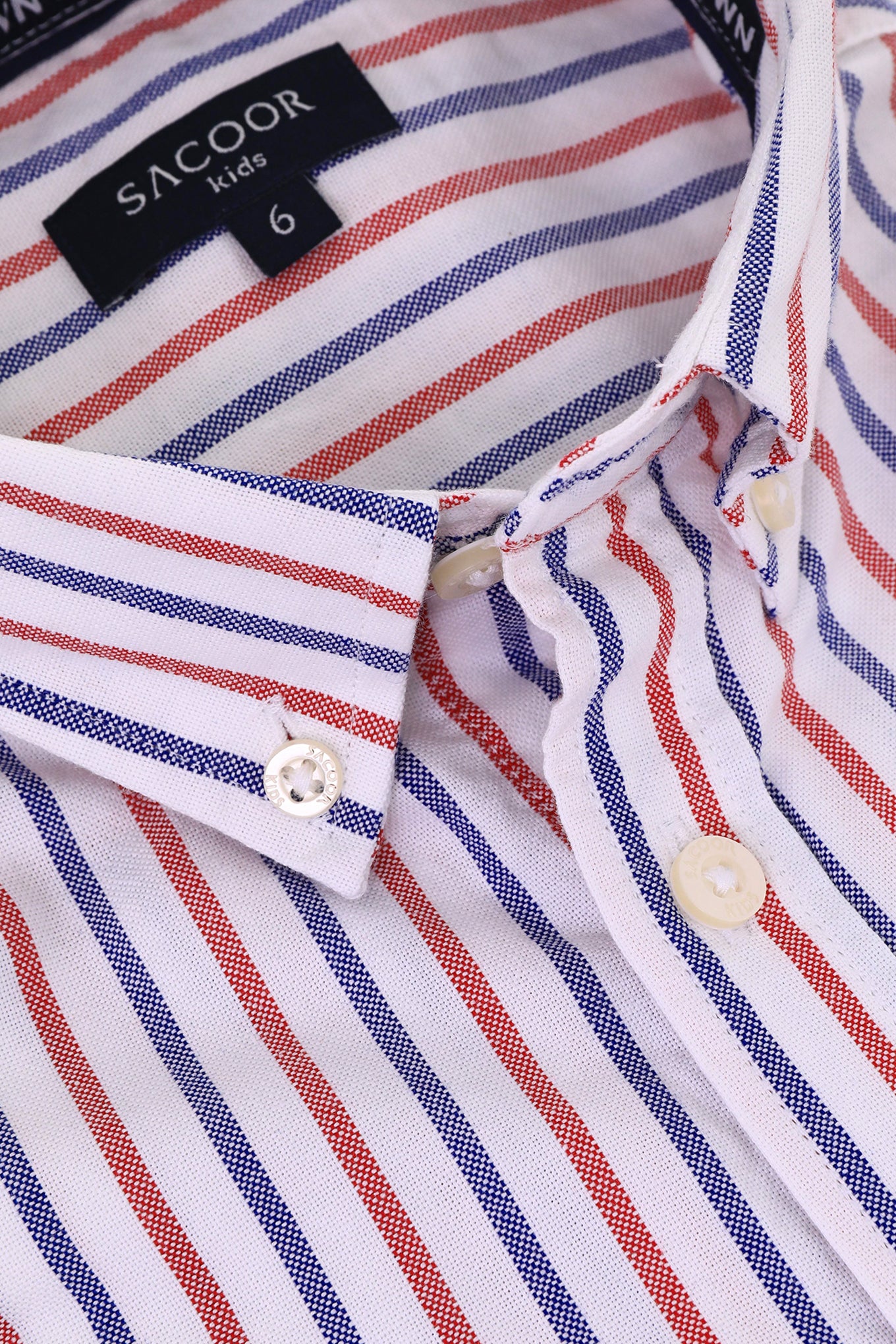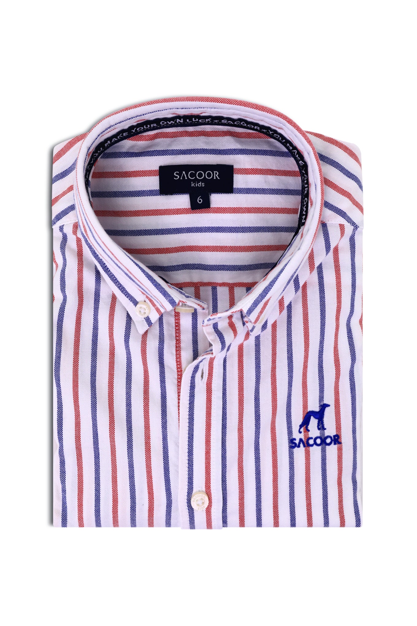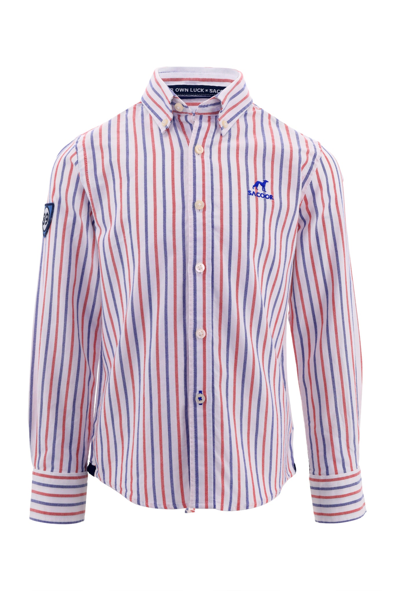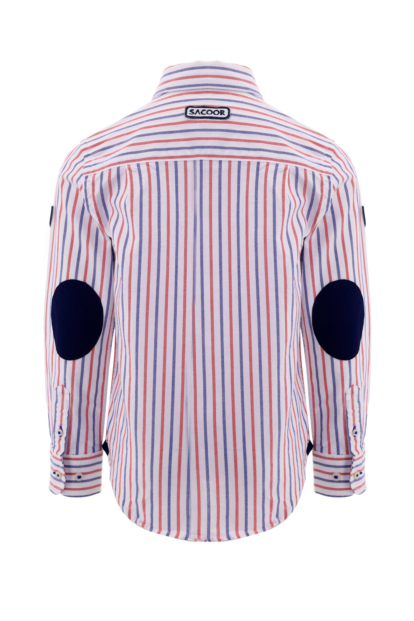 Boy's shirt with striped pattern in 100% cotton fabric. Features a button down collar, button-up front and long sleeves with single cuffs with two buttons. Side patch in contrast fabric. Logo embroidery in contrast color. Shirt with elbow patches. Patch on sleeve and back.