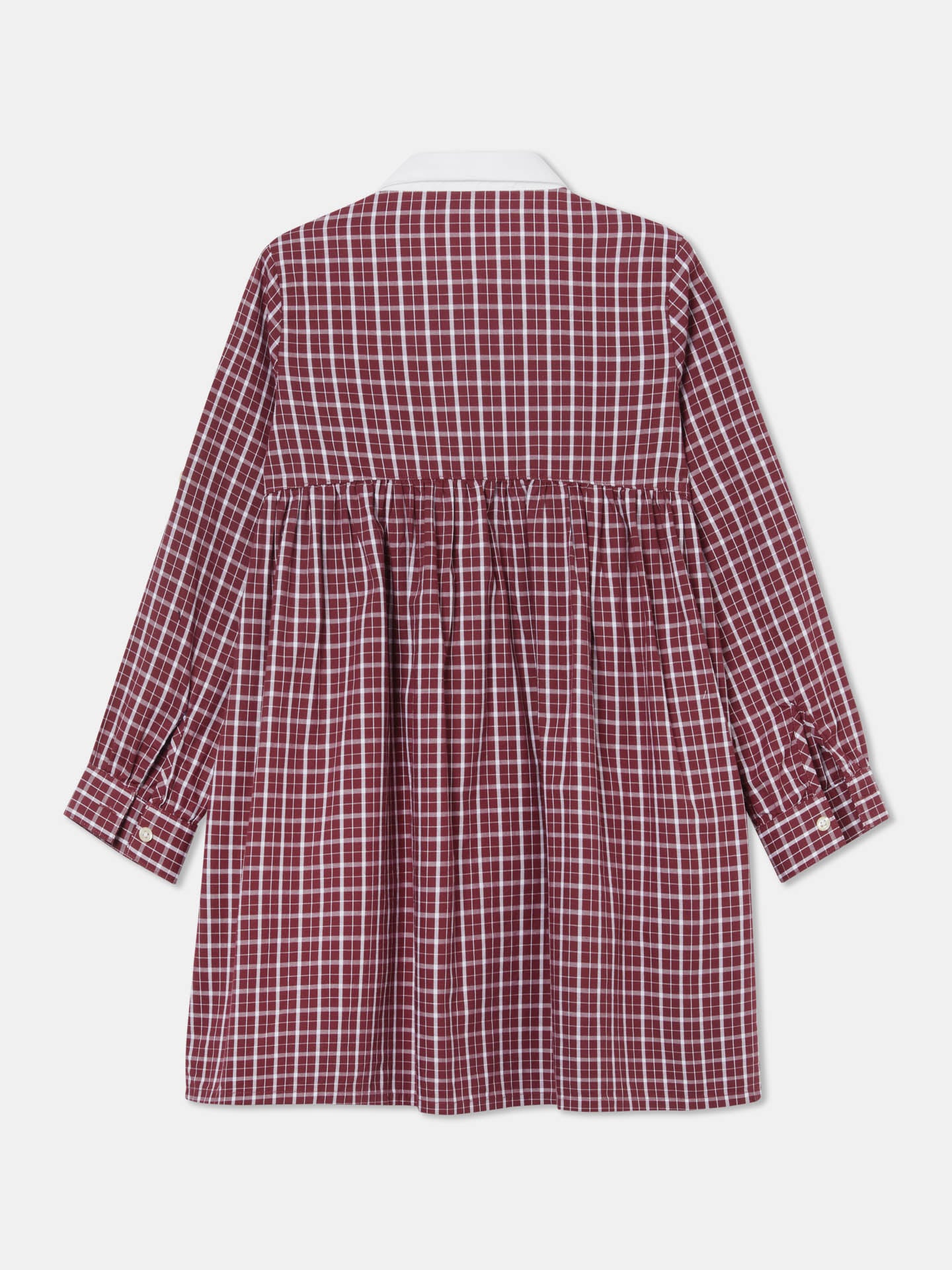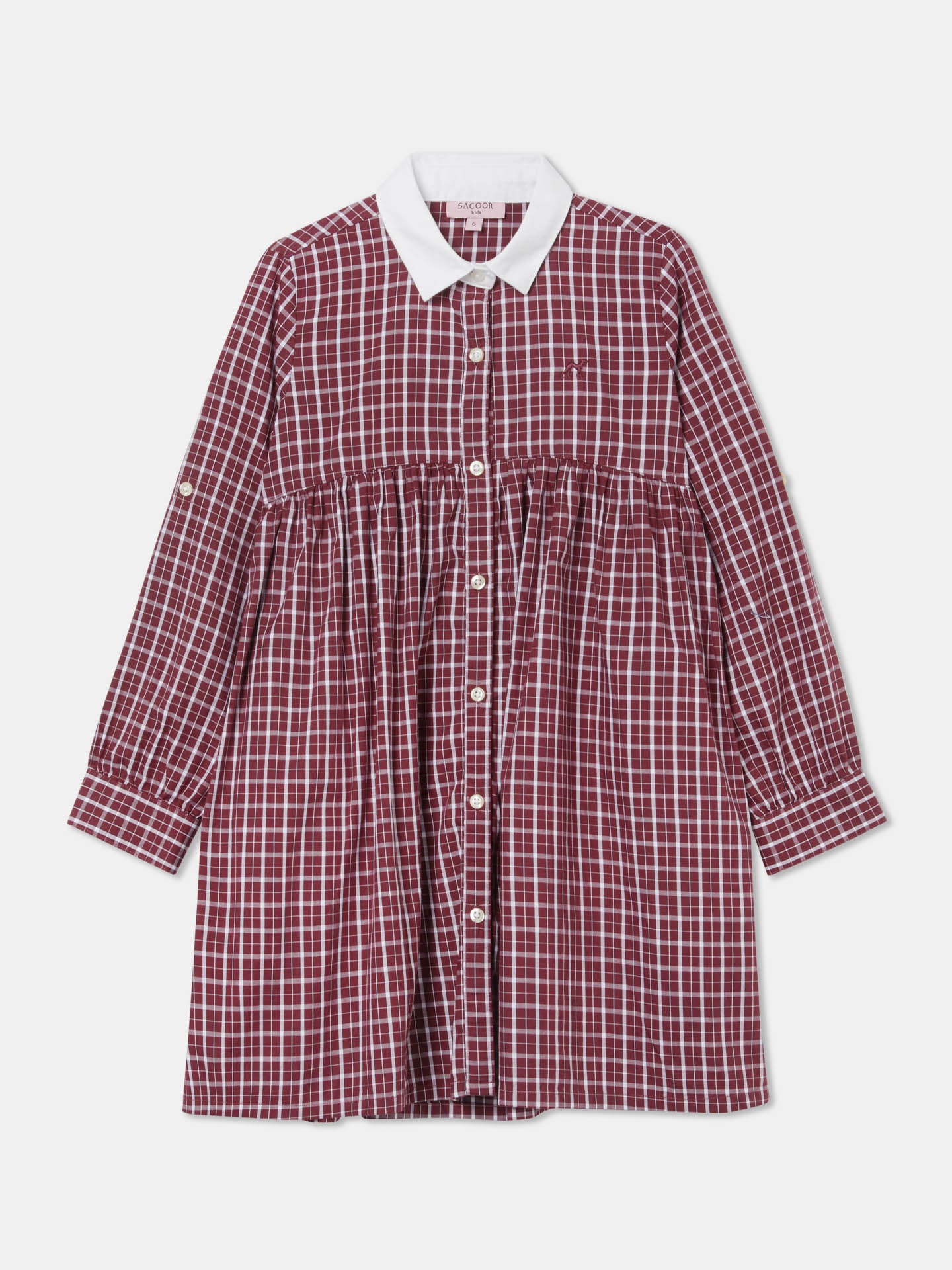 Checked casual shirt dress made of 100% cotton oxford fabric. Features an open collar, button-up front placket and roll-up sleeves with single cuffs. Rich details such as empire waistline and logo embroidery.