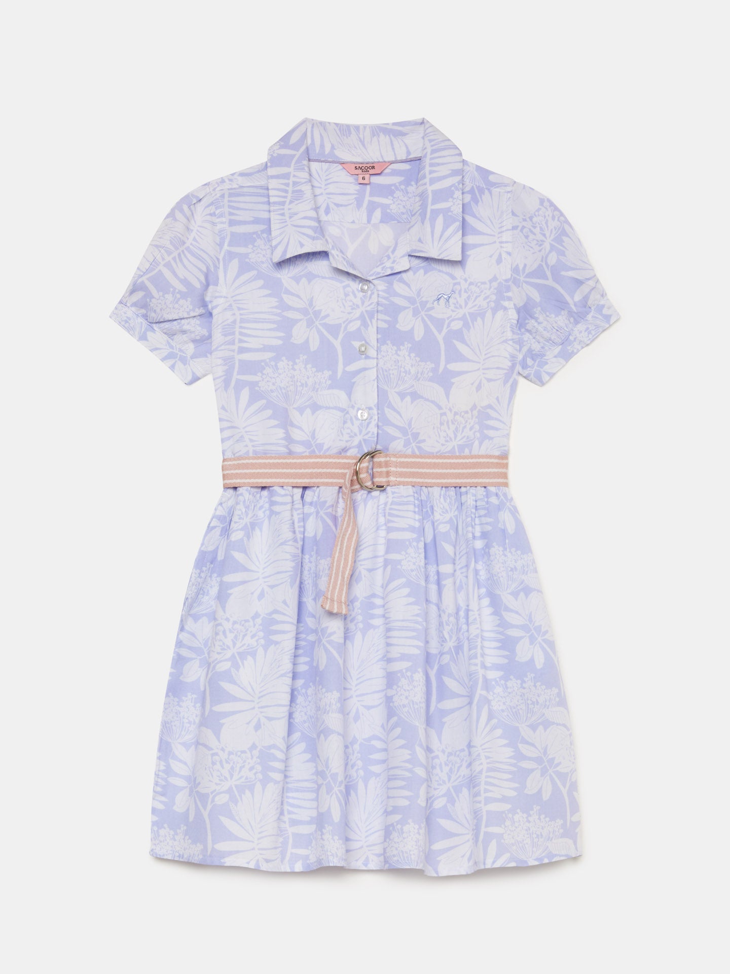 Flowers Print casual shirt dress made of 100% viscose fabric. Featuring a cuban collar, button-up placket, short ballon sleeves and gathered skirt with pockets on the side seams. Rich details such as belt and logo embroidery.