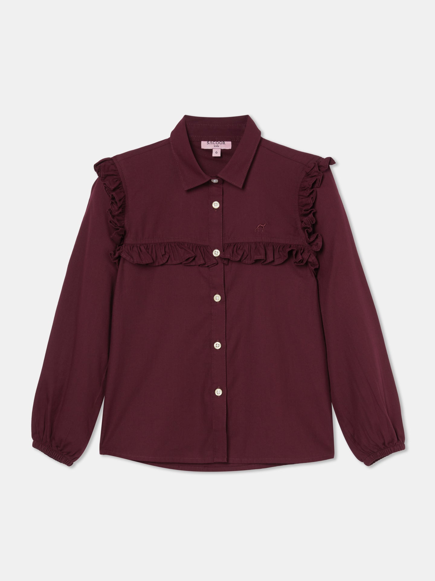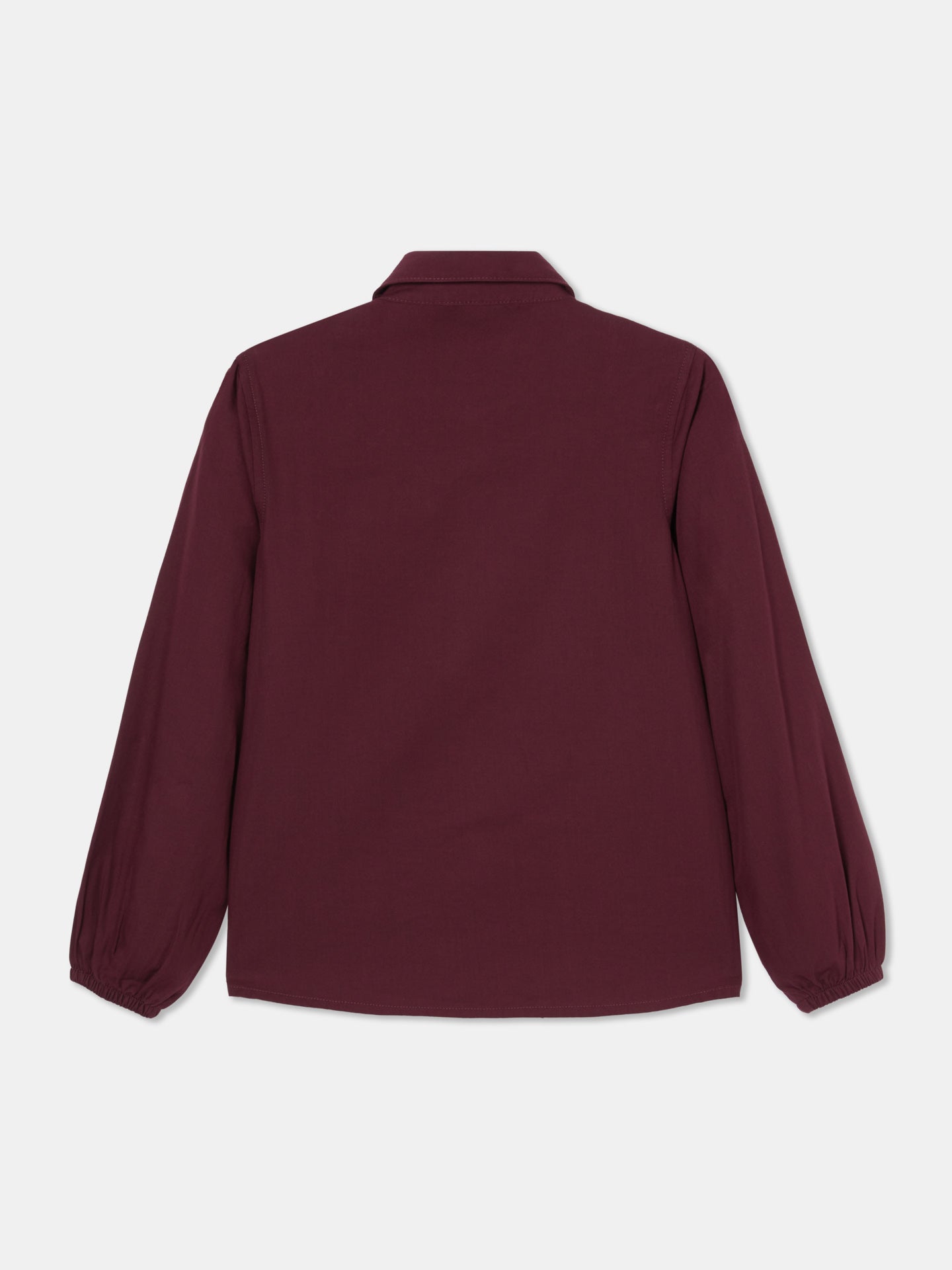 Plain colour casual shirt made of 100% cotton twill fabric. Features an open collar, button-up front placket, long gathered sleeves with single cuffs and frill at front, back and shoulders. Rich details such as logo embroidery.