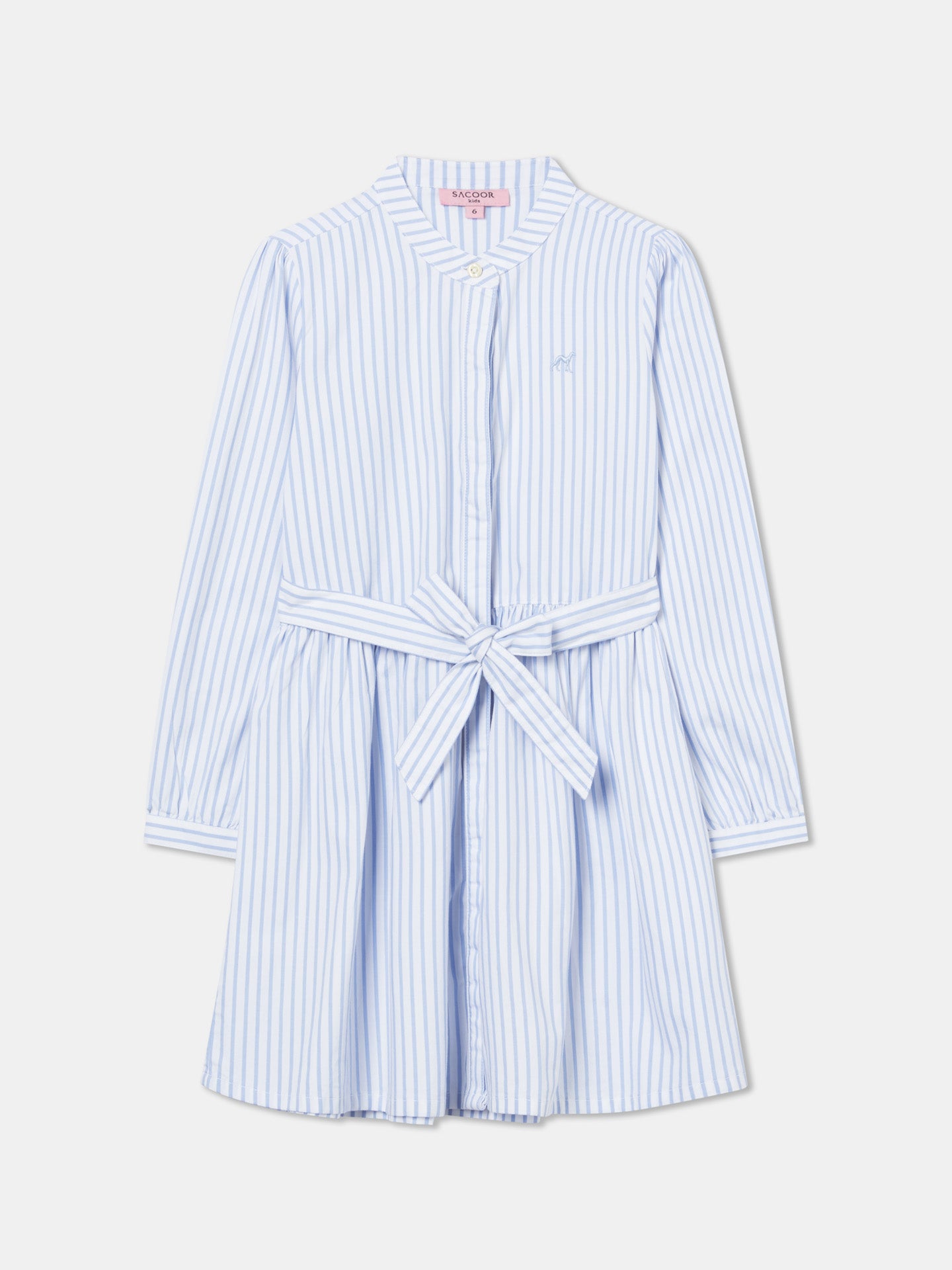 Striped casual shirt dress made of 100% cotton oxford fabric. Features a mao collar, button-up front double placket and long gathered sleeves with single cuffs. Rich details such as gathered waistline with self fabric bow tie and logo embroidery.