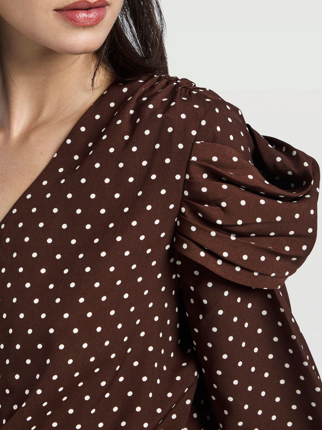 Fluid blouse made with polka dot printed fabric. Features V-neckline. Front opening trough inner placket with self-fabric covered buttons, voluminous long sleeves with a gathered strap in the armhole and self-fabric covered button cuffs.