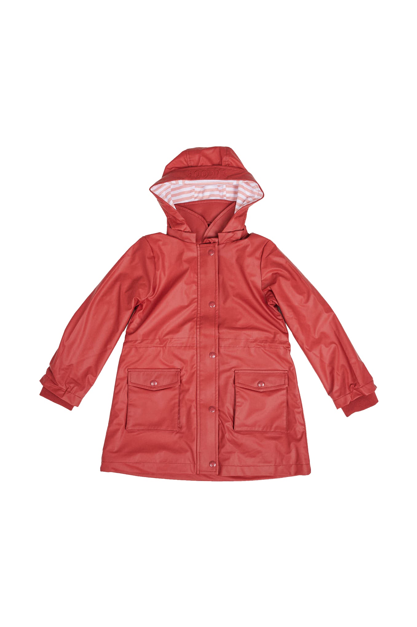 Coated soft handfeel parka with hood and adjustable waistband. Features 2 patch pockets with flaps and contrasting logo at chest.
