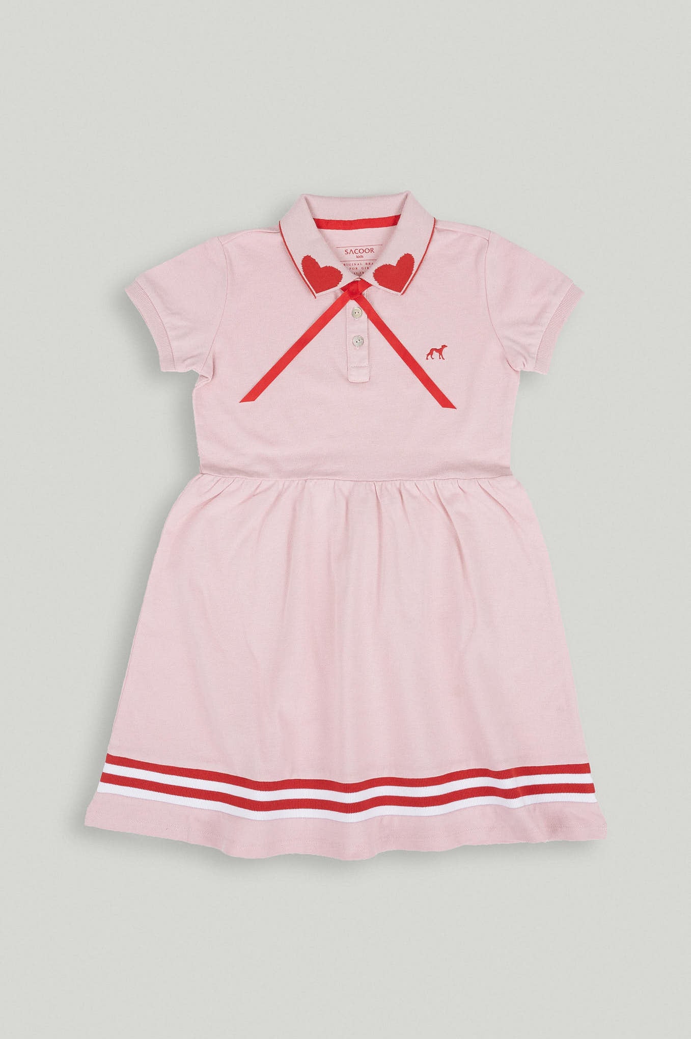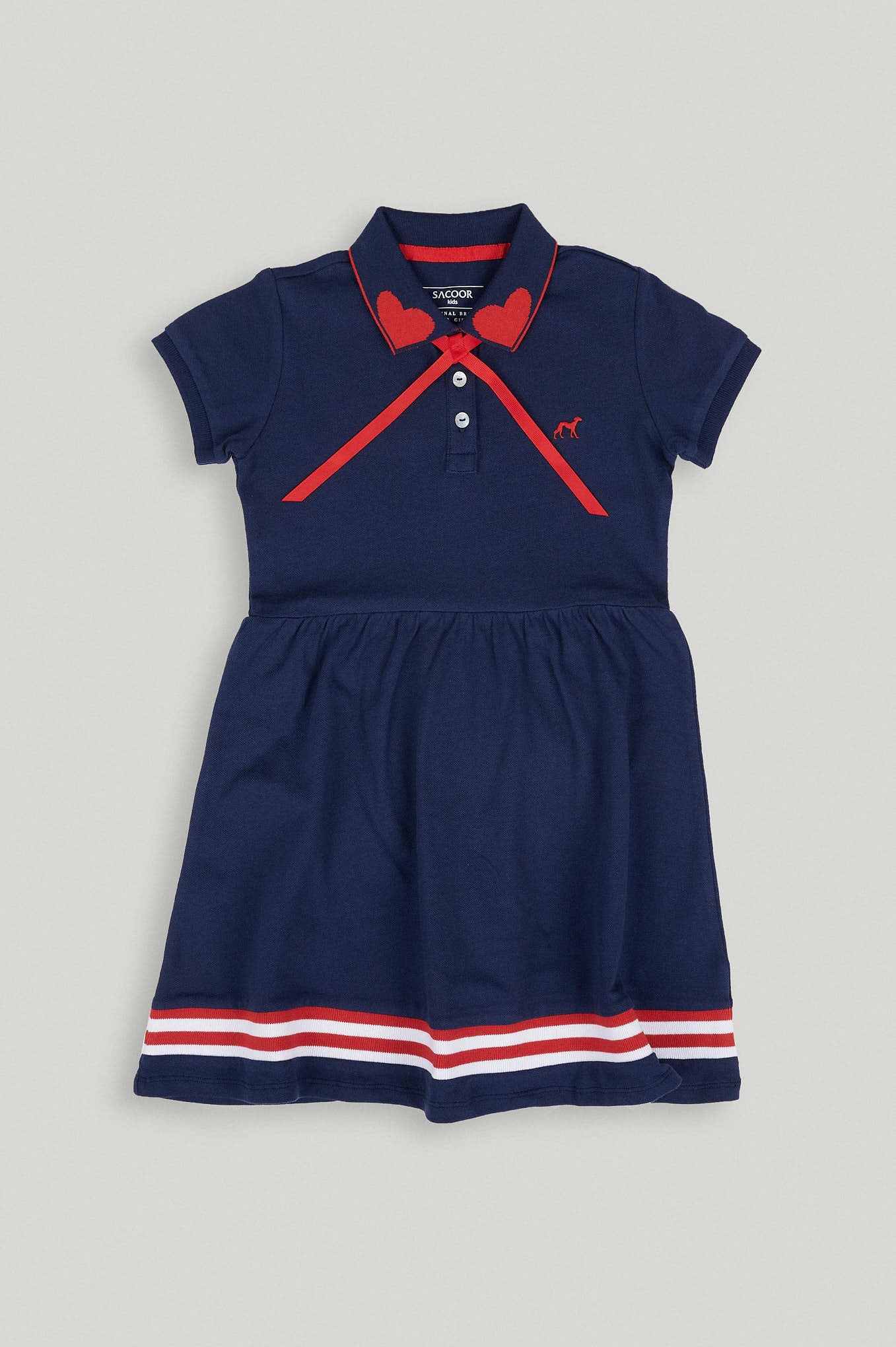 Fit and flare piquet dress with contrast fun heart at collar. Bottom with contrasting striped tape and bow detail under collar. It has logo embroidery at chest.