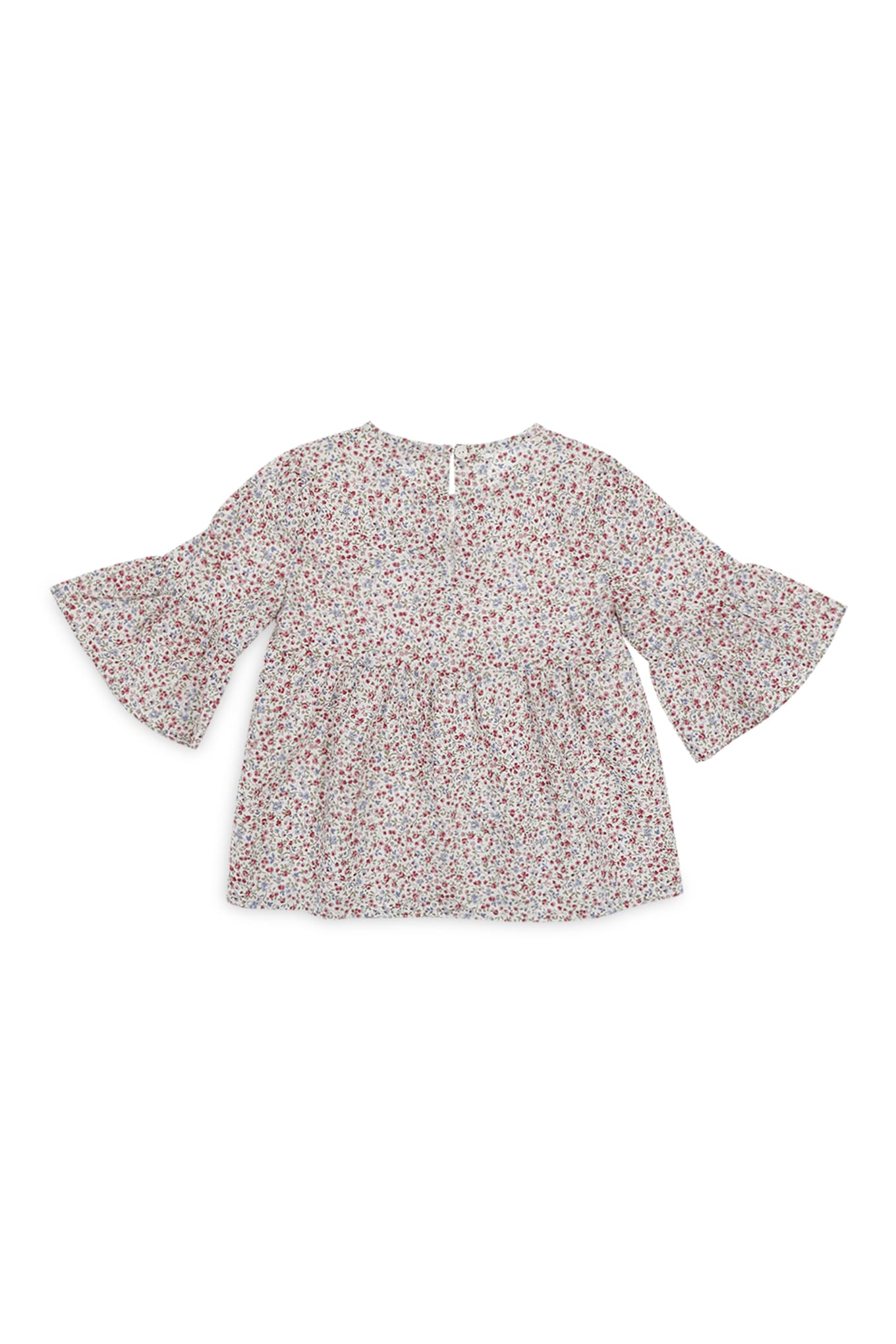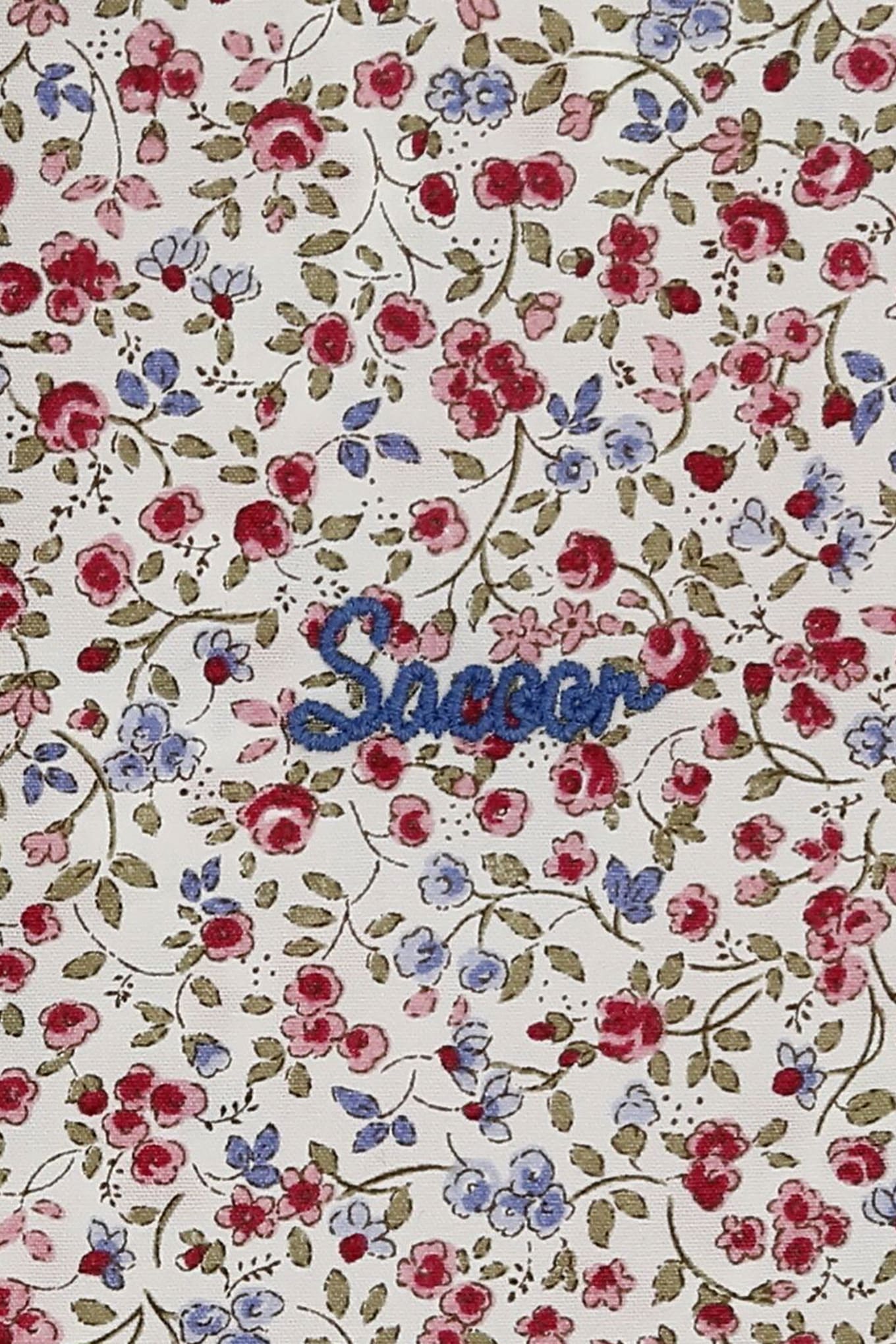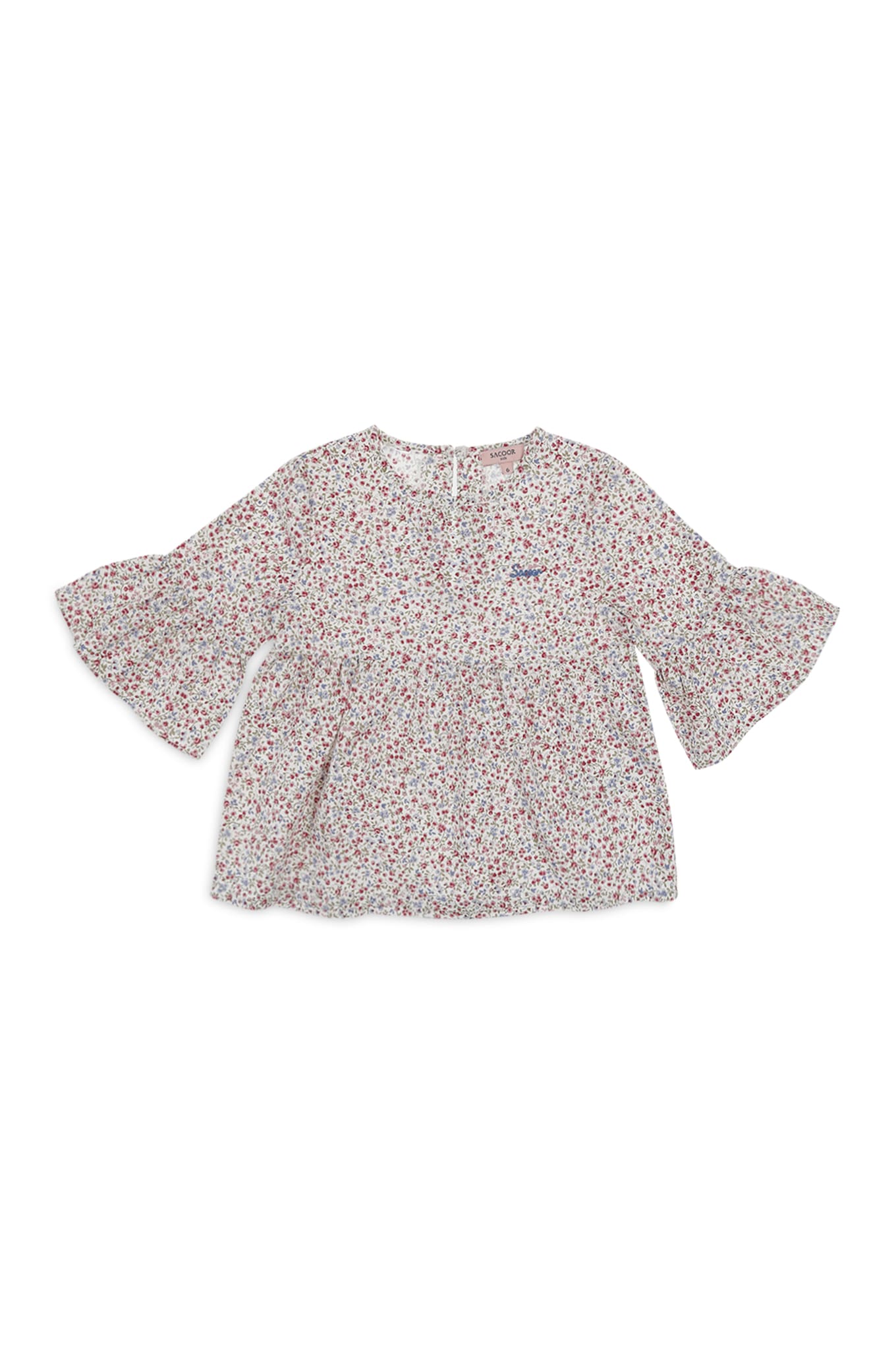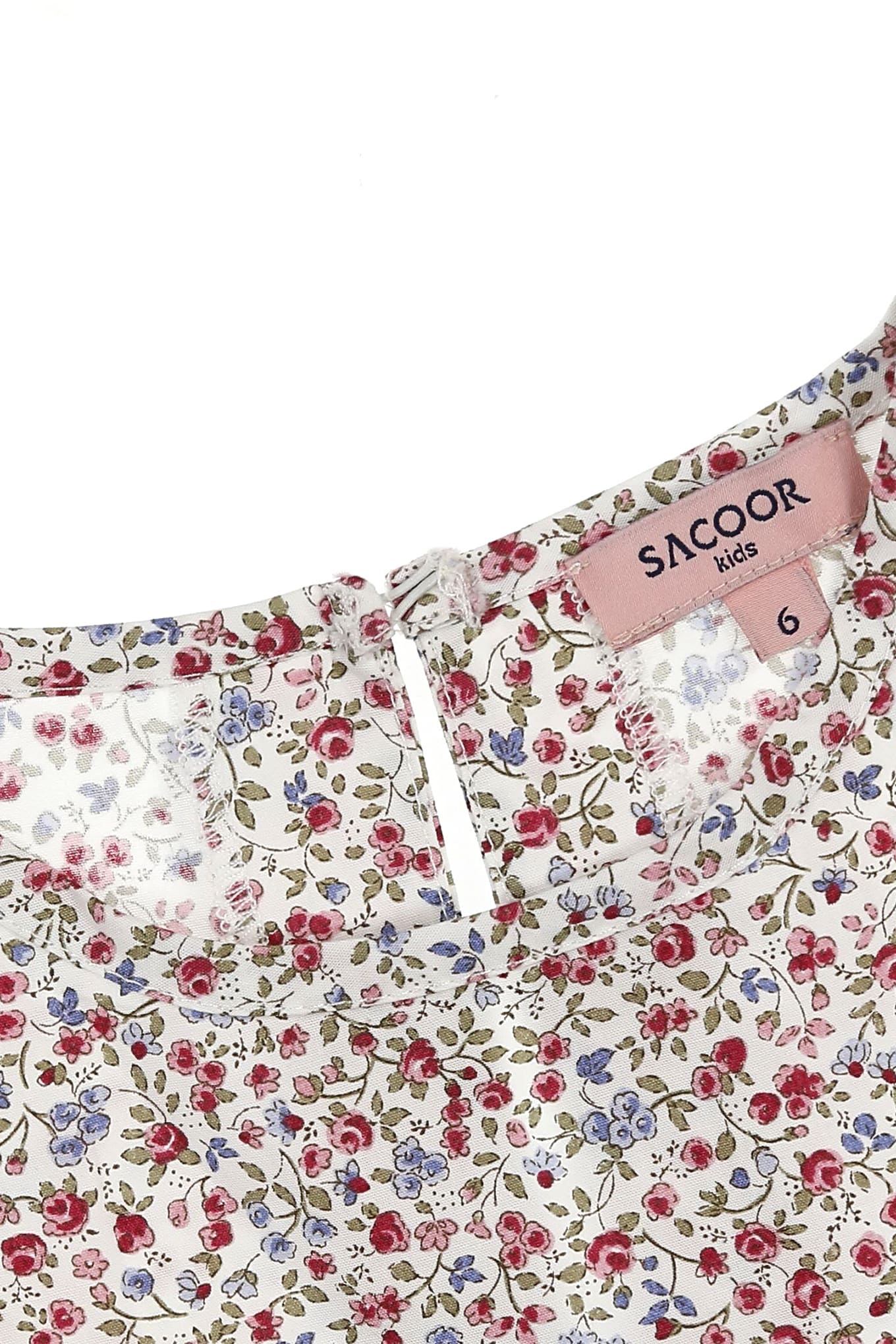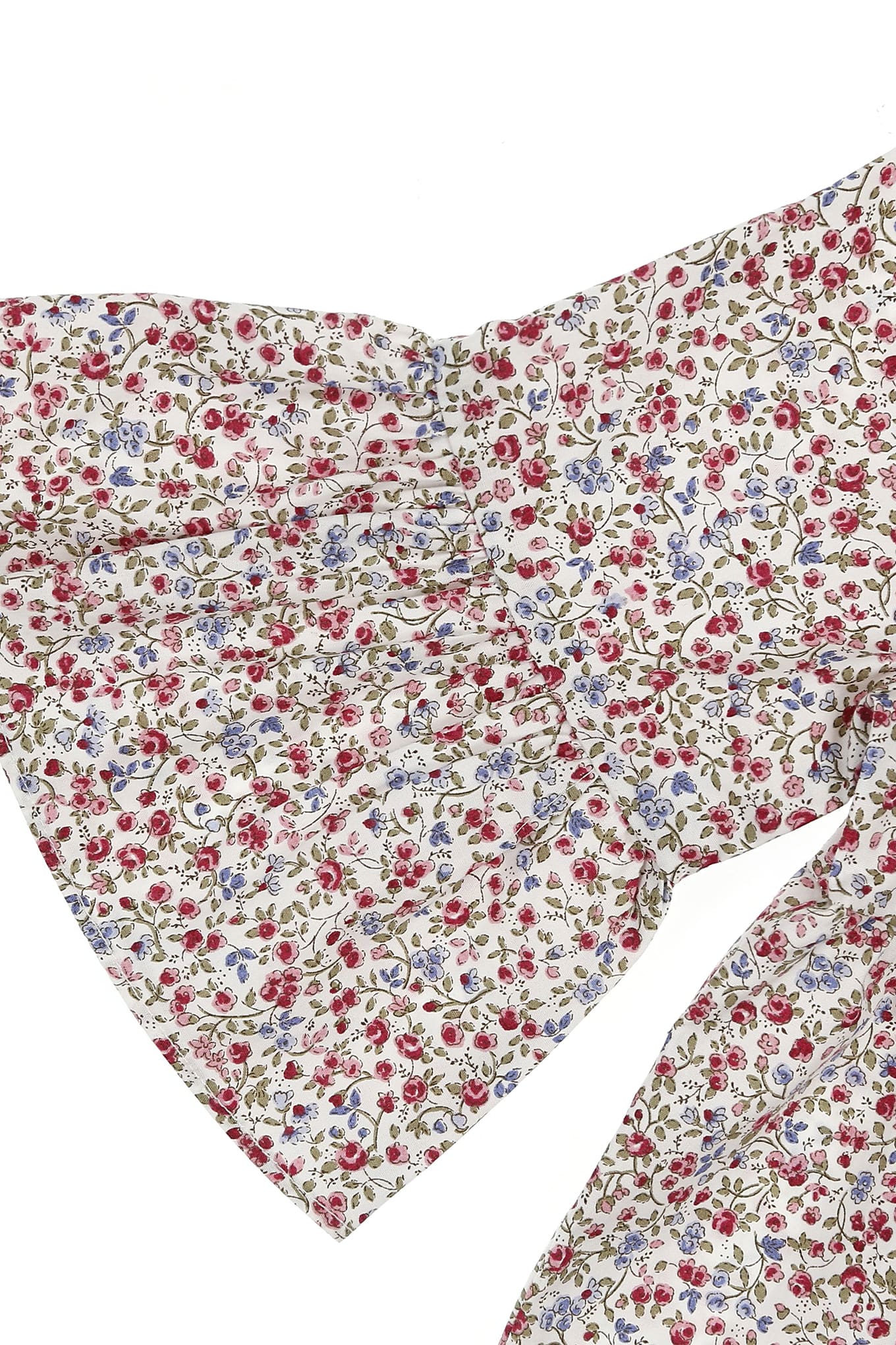 Fantasy floral print top with pintucks detail at chest and sleeves. Features frilled sleeves, round neck and brand's metal plate at bottom. Single-needle thin normal hem.