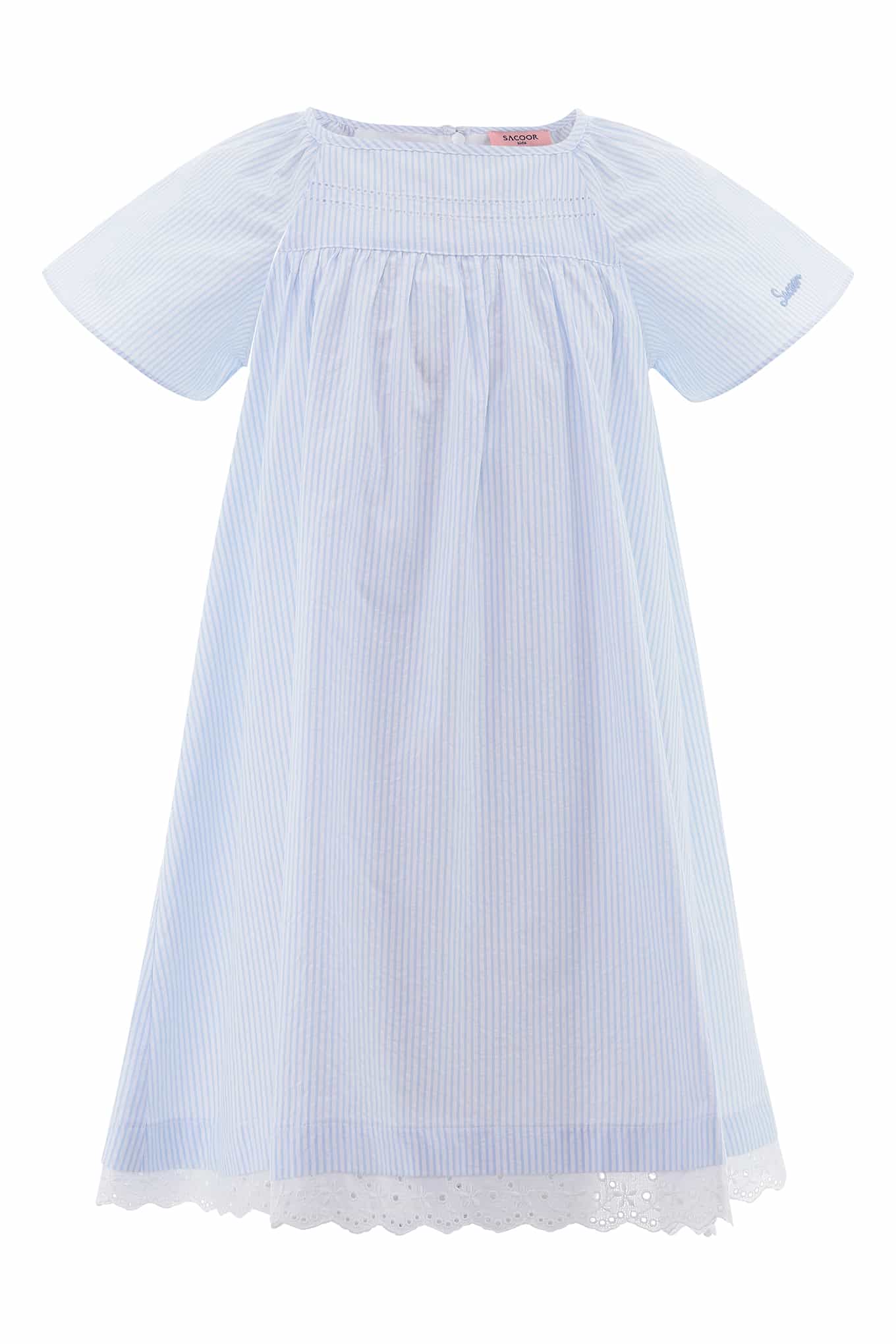 For a relaxed summer. This relaxed-style Sacoor dress, with subtle stripes and a charming lace finish, will delight any girl. Simple and original, in 100% cotton, it feels soft to the touch and gives unmatched comfort. An excellent option for a charming look next summer!