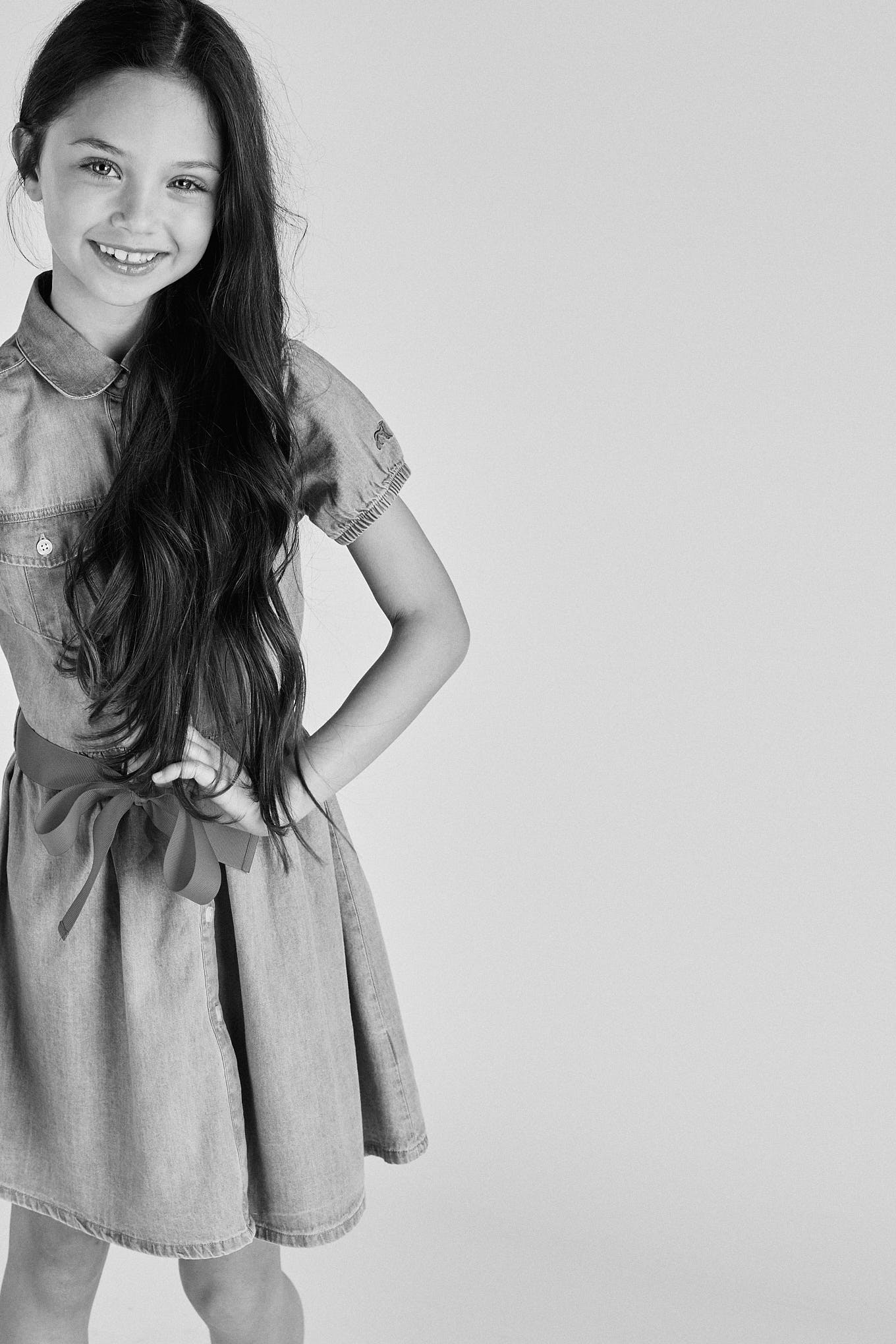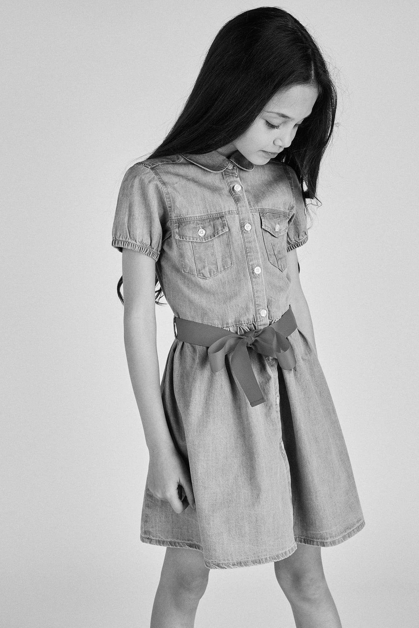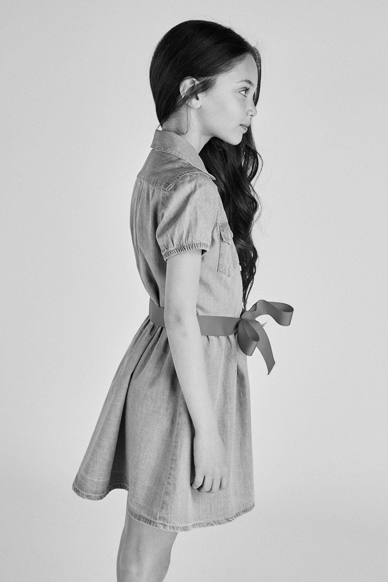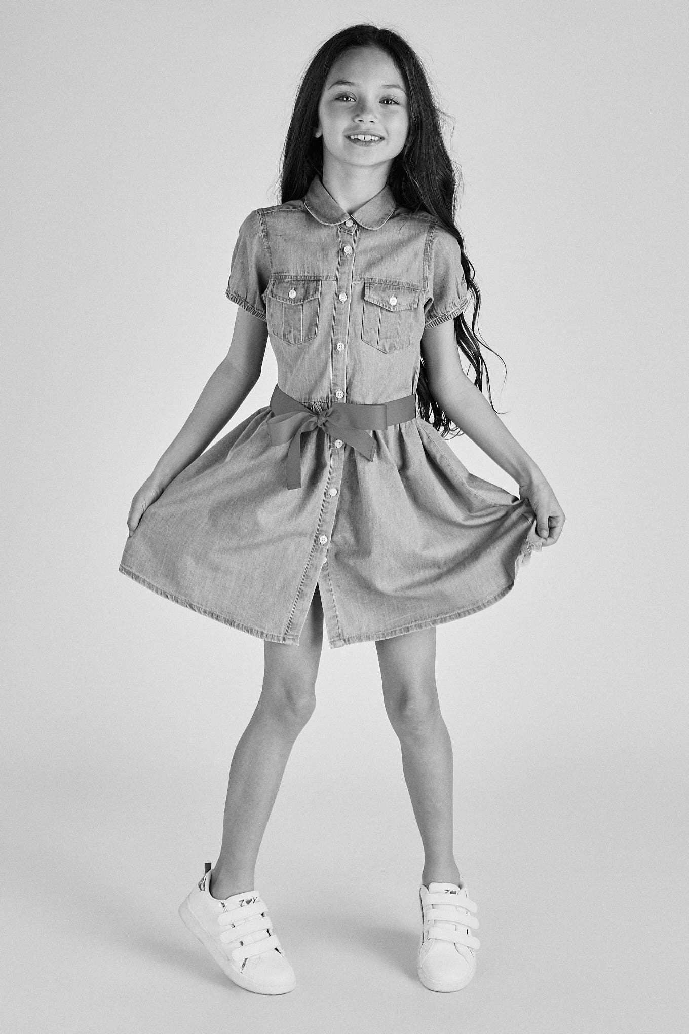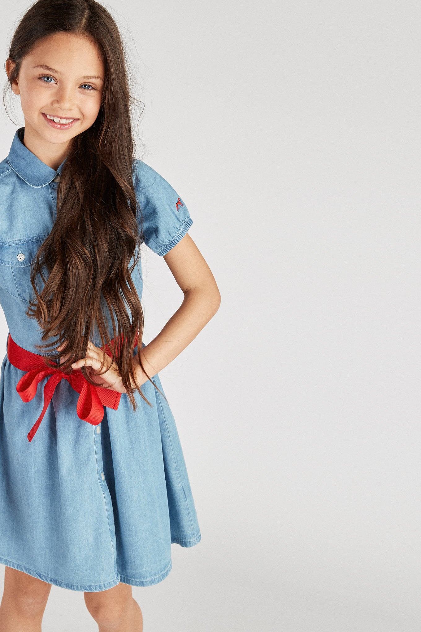 Girl's dress, denim shirt model, 100% cotton. Round collar and short sleeves with elastic. Sacoor logo embroidered on one sleeve. Two front pockets, just like the jeans. Contrasting waist ribbon for tying.