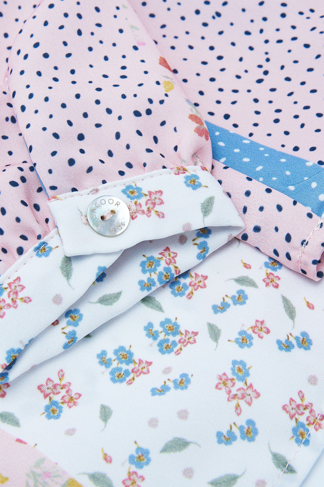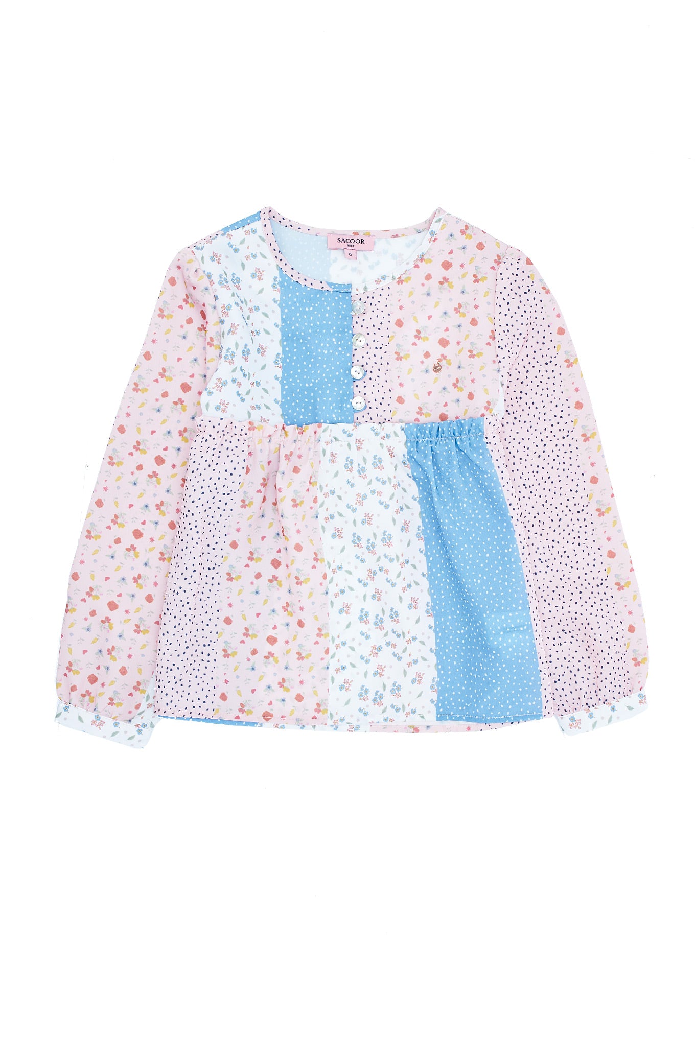 Girl's lightweight and comfortable blouse. Its fabric is fluid, with a pattern that mix dots with floral motifs, in patchwork effect. With loose cut, below the chest starts a spinning effect, from a delicate ruffled. Long sleeves, frill on the shoulders. Rounded neckline . Press buttons on the front. Brand customization plate on chest .