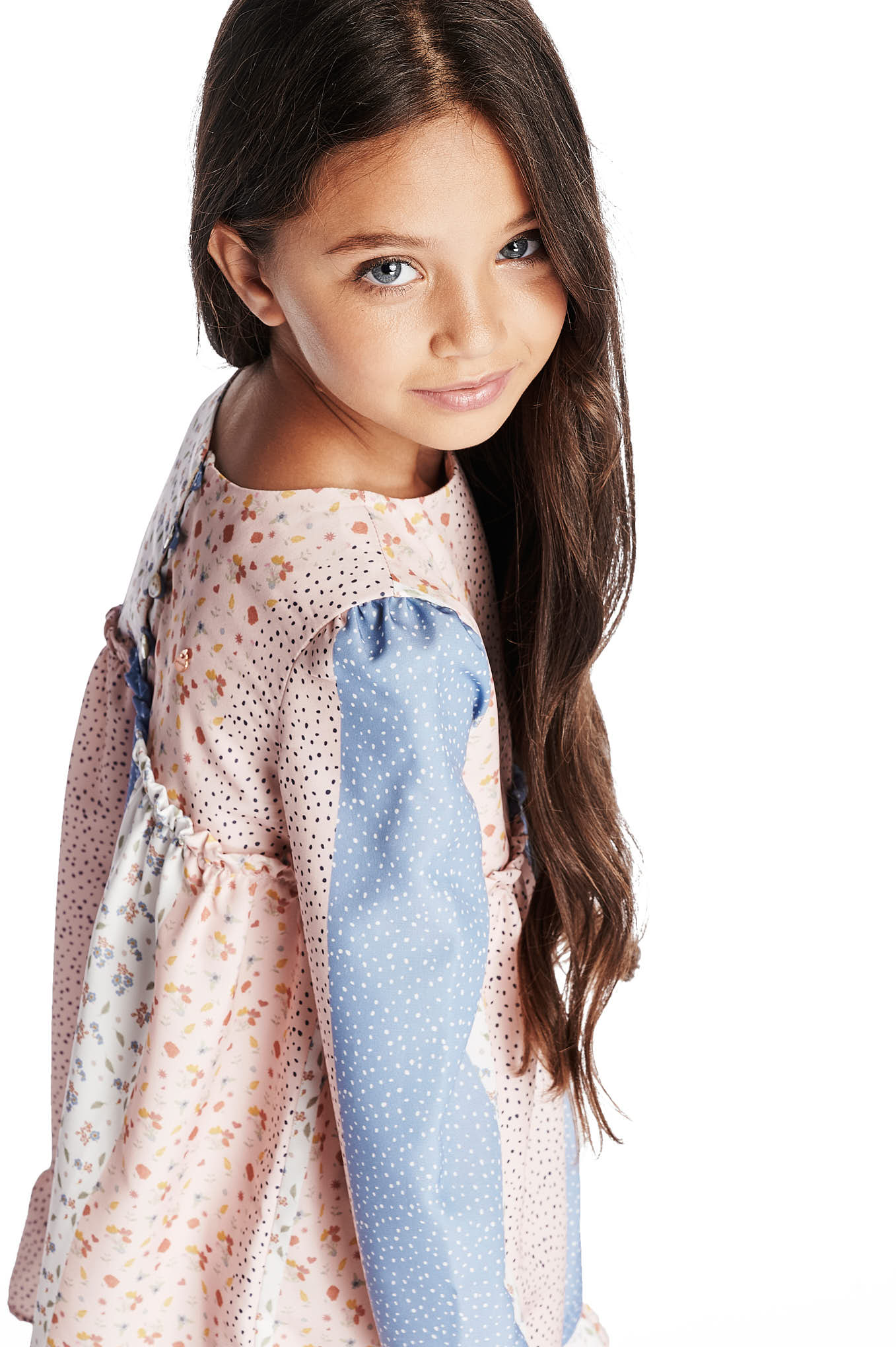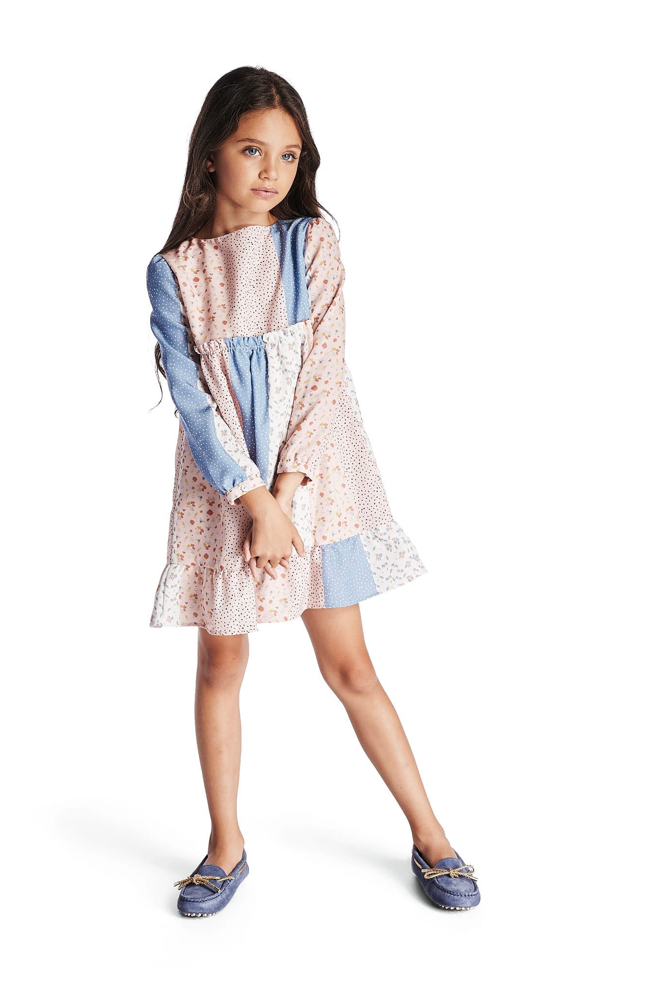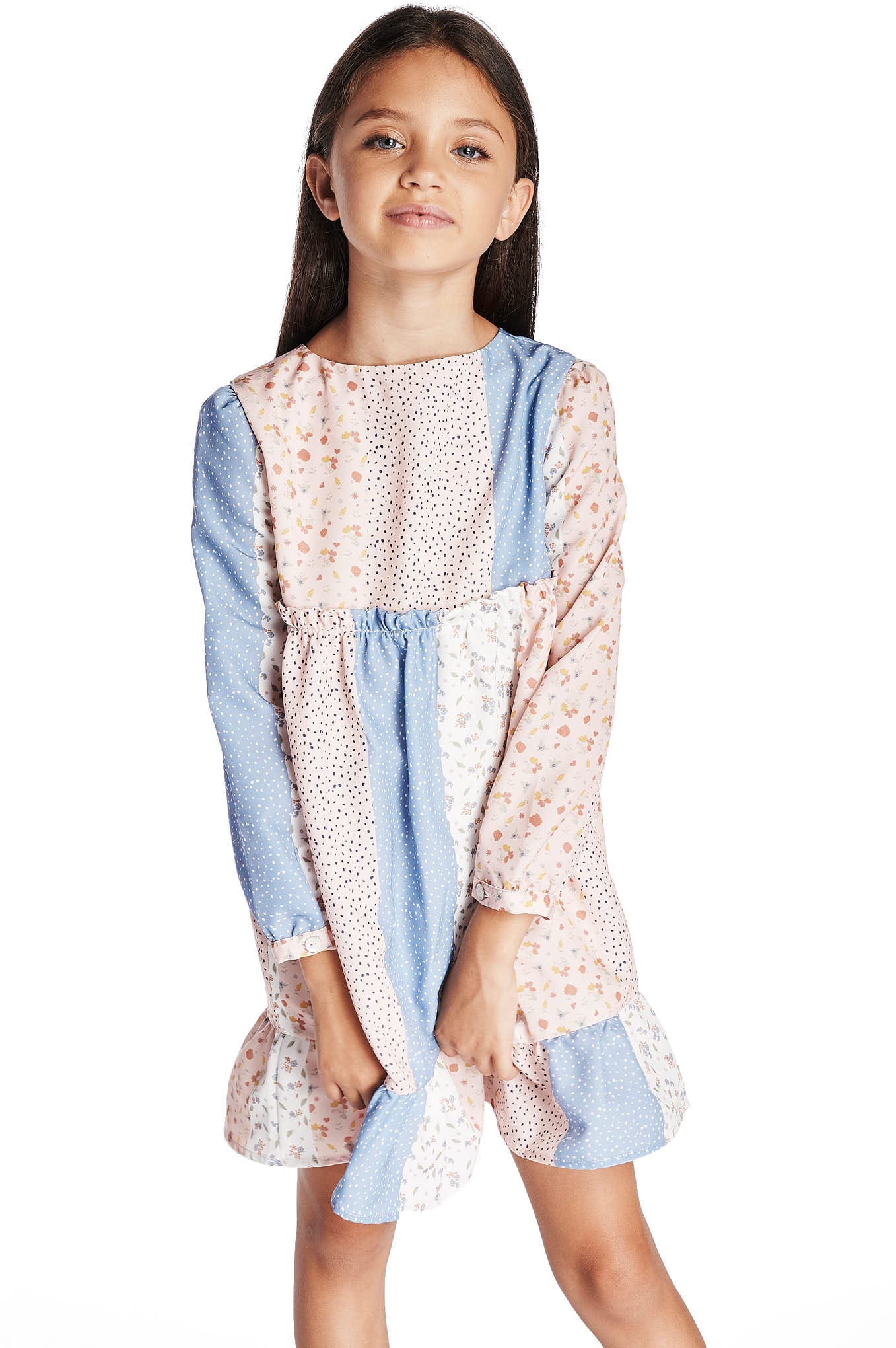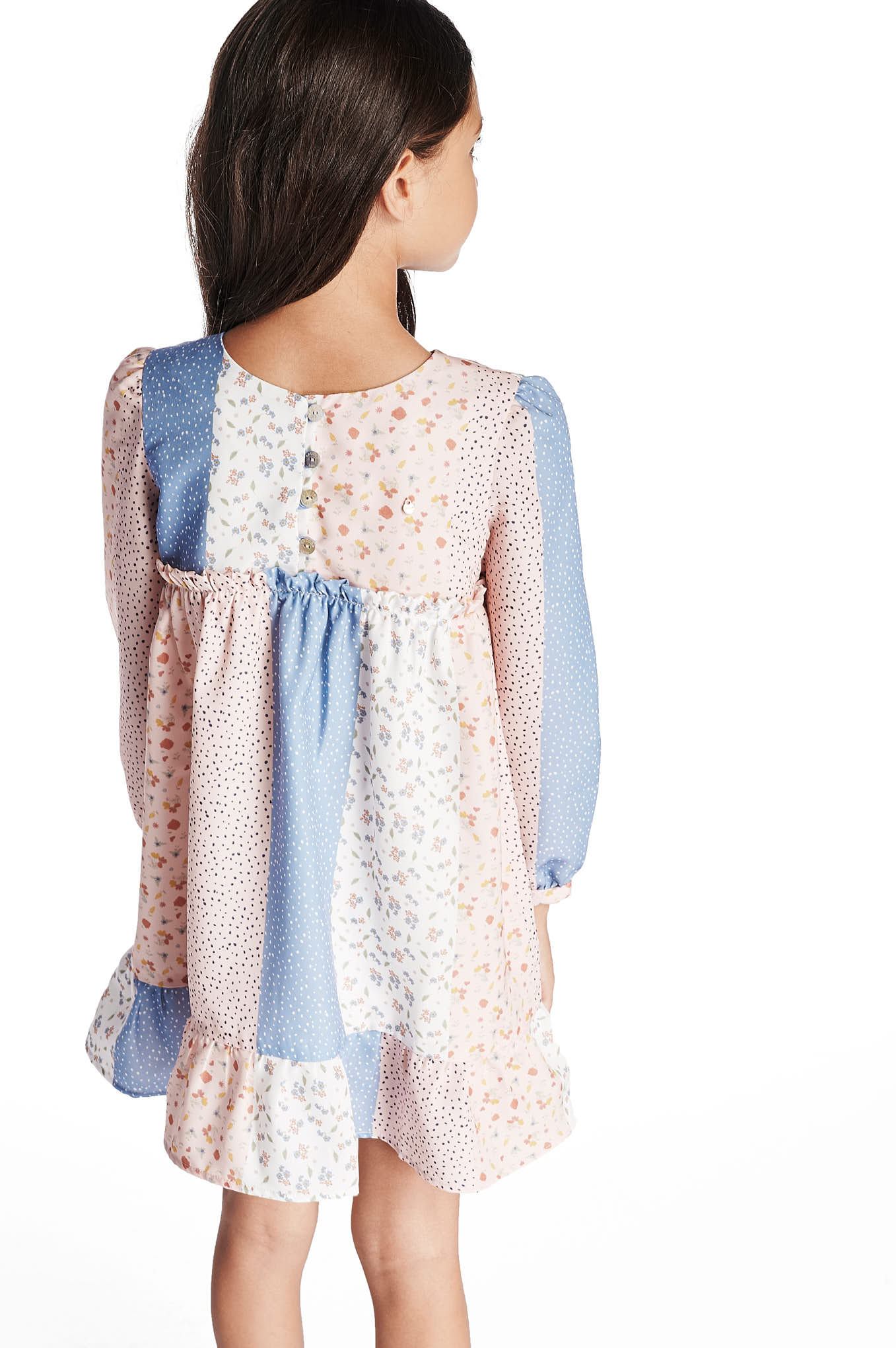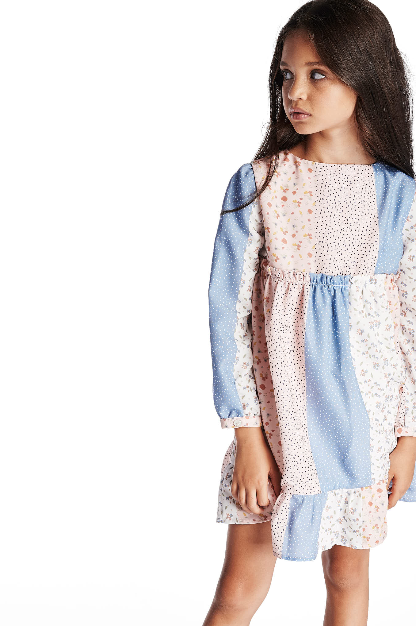 A girl dress, cut loose, by the knee. Its fabric is light and fluid, with pattern that mix dots with floral motifs, in patchwork effect. Pleated skirt, for a more rounded effect, with ruffles above the waist and at the base. Long sleeves, frill on the shoulders. Rounded neckline . Press buttons on the front. Brand customization plate on chest . Full lining dress.