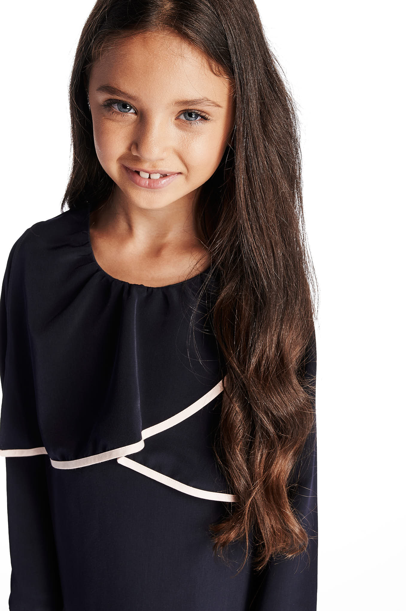 A Girl's dress, cut evasé, by the knee. Its fabric is loose, plain, bright contrast in the collar and cuffs of long sleeves. Rounded neckline, from which drops a large cross collar, slightly pleated. Closes with zip hidden on back. Brand customization plate Sacoor on base. Full lining dress. Collection Autumn / Winter 2019 is available in the online store Sacoor Brothers.