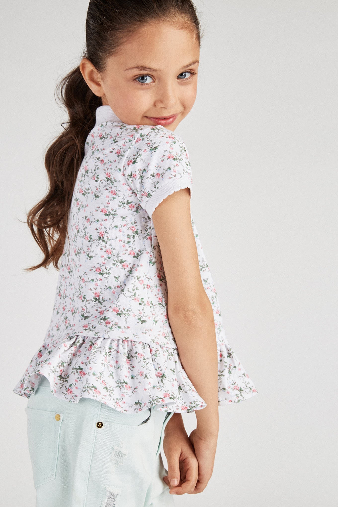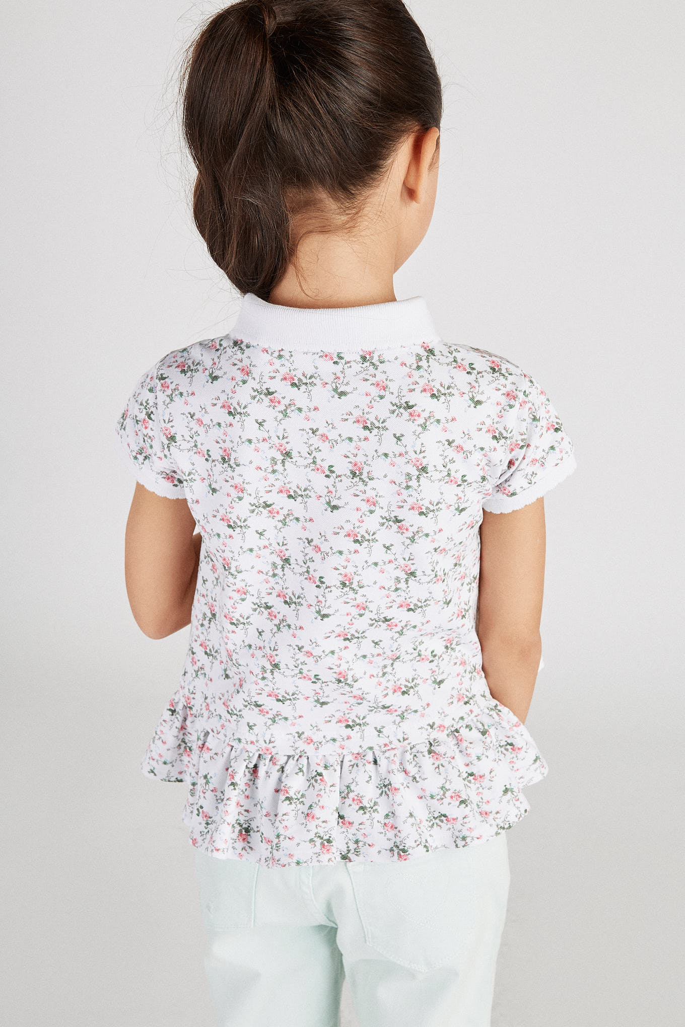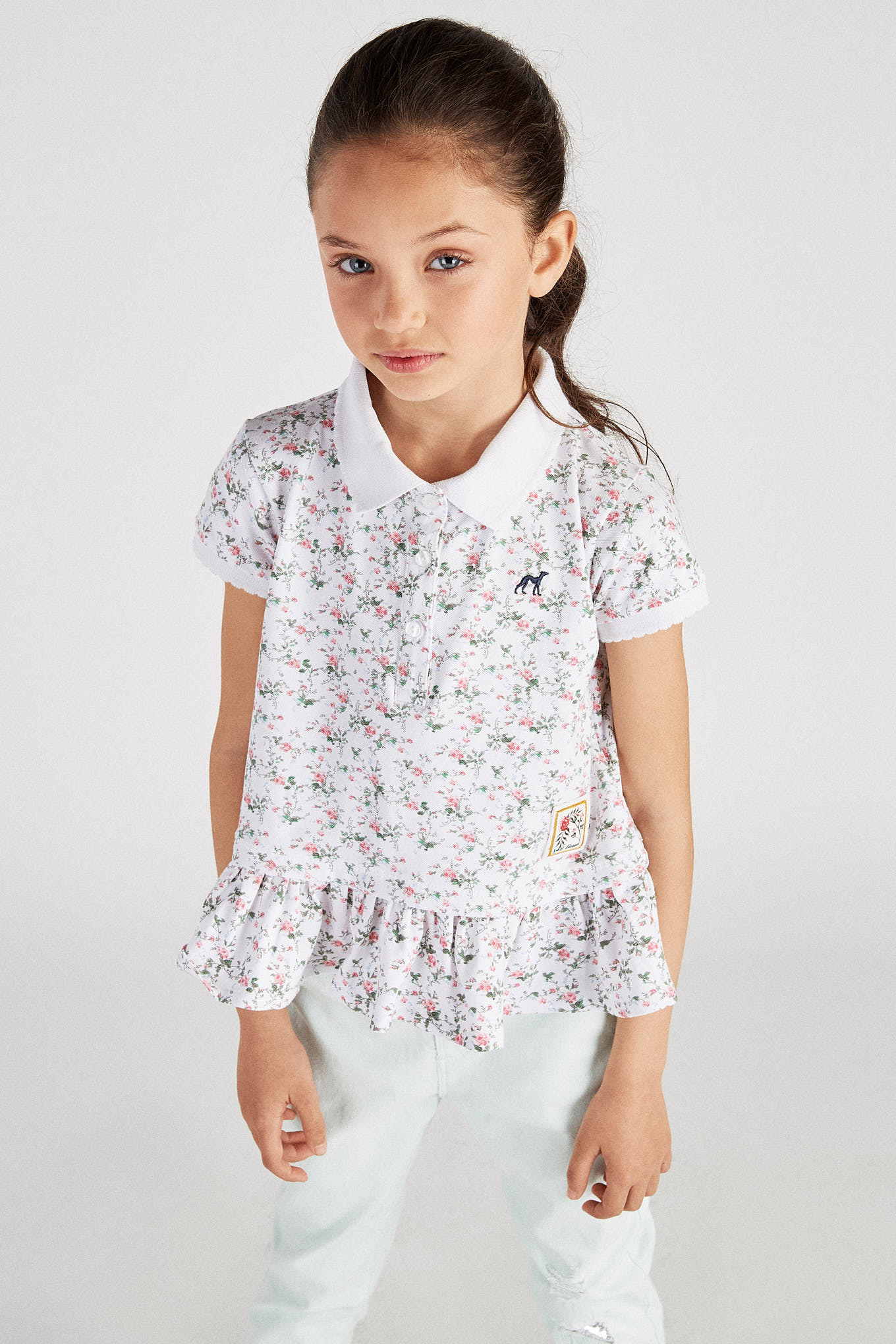Girl's piqué polo shirt with floral pattern. Embroidered Sacoor logo on chest. Regular cutaway collar and 3-button neckline. Very feminine, entirely frilled hem. Ribbed trims on collar and short sleeves. Made with cotton and elastane, this is a comfortable and very flexible item.
