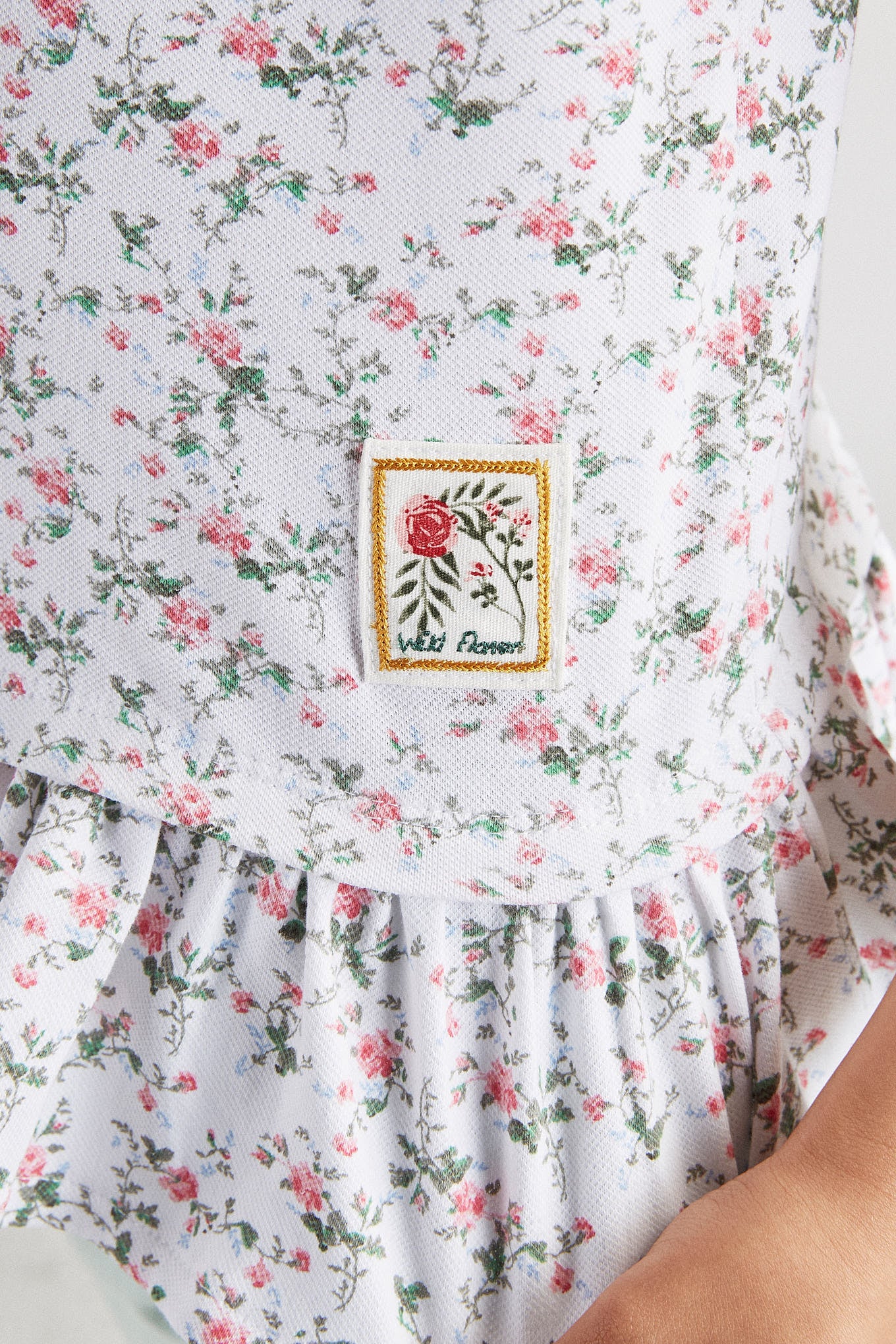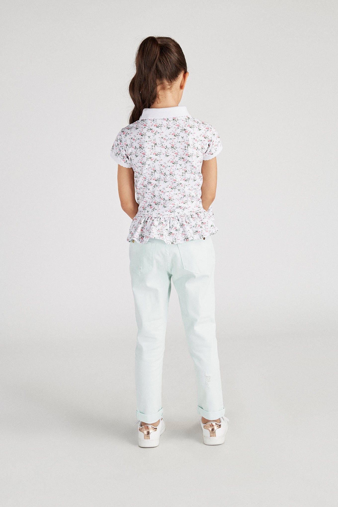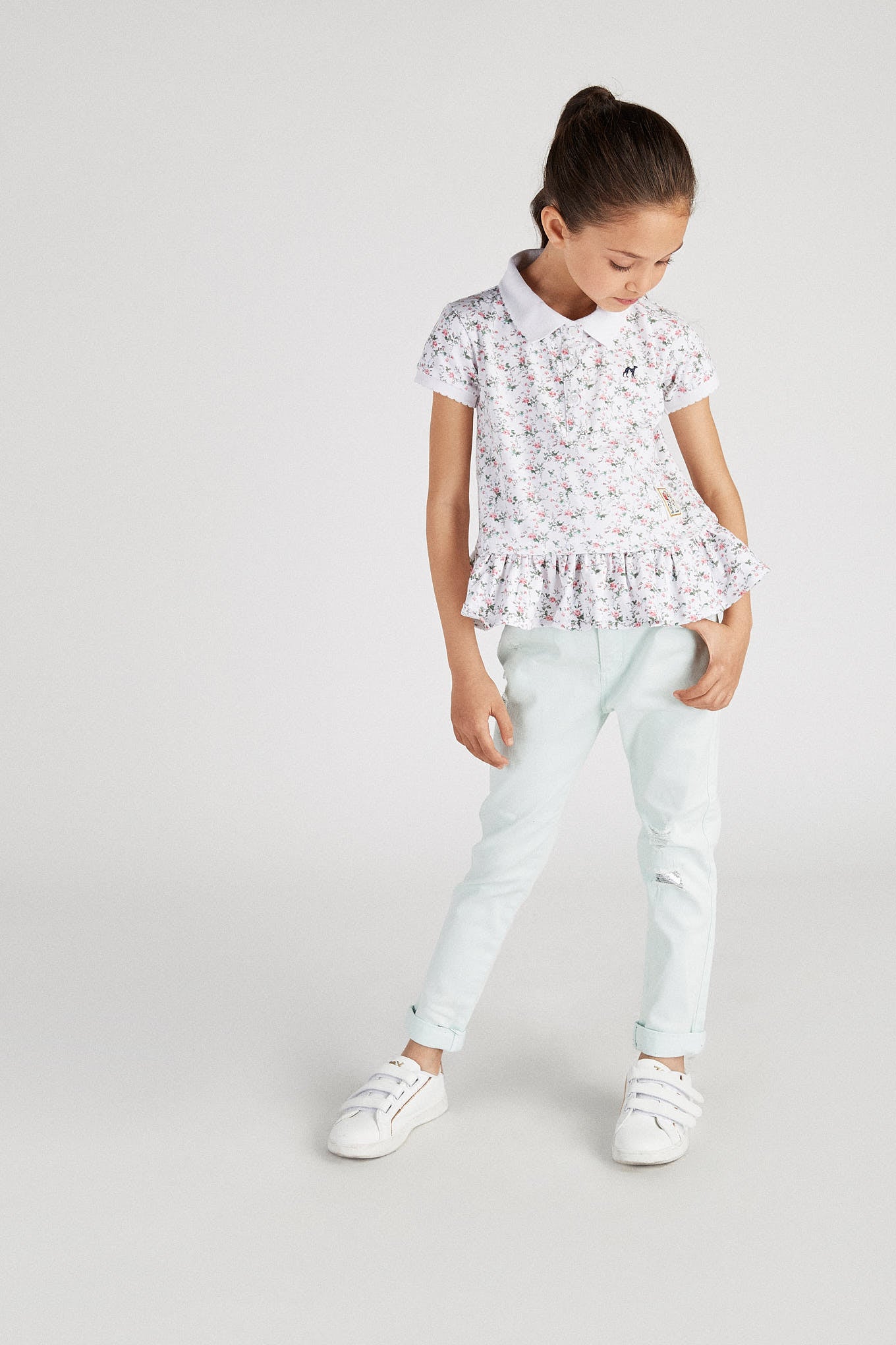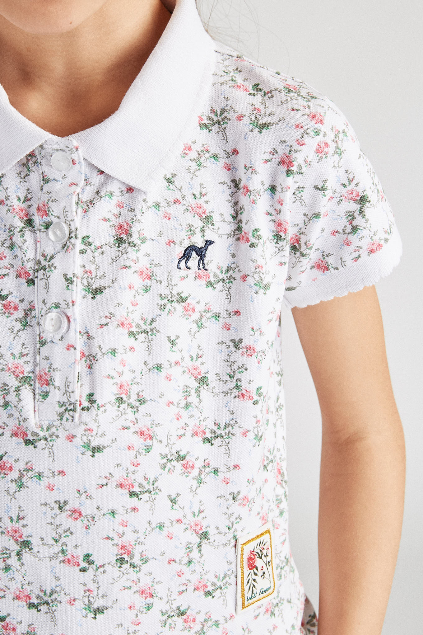 Girl's piqué polo shirt with floral pattern. Embroidered Sacoor logo on chest. Regular cutaway collar and 3-button neckline. Very feminine, entirely frilled hem. Ribbed trims on collar and short sleeves. Made with cotton and elastane, this is a comfortable and very flexible item.