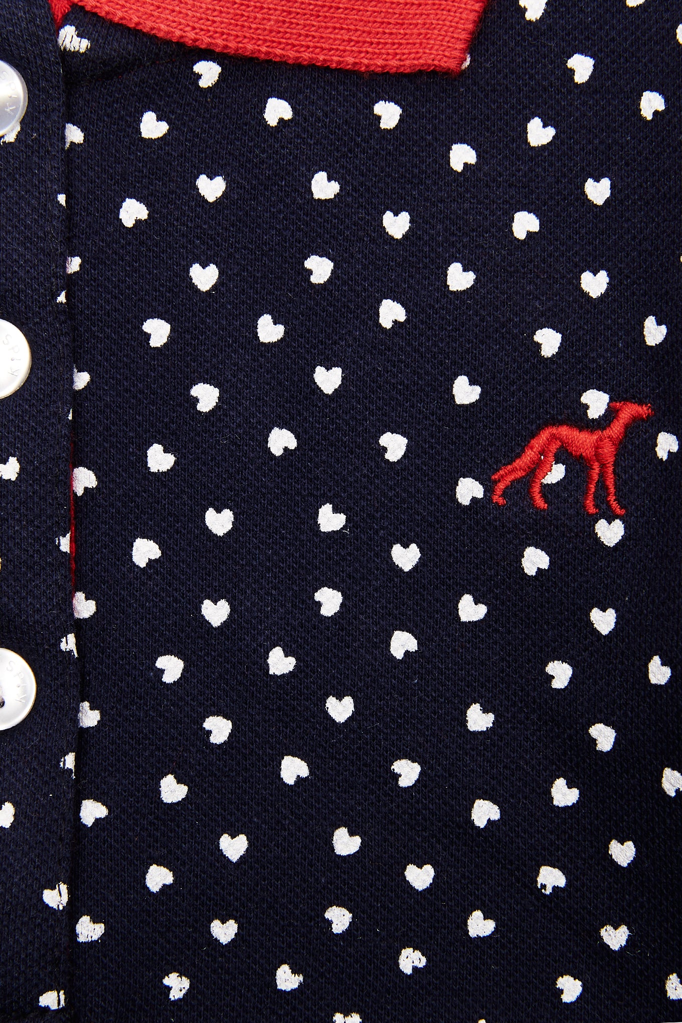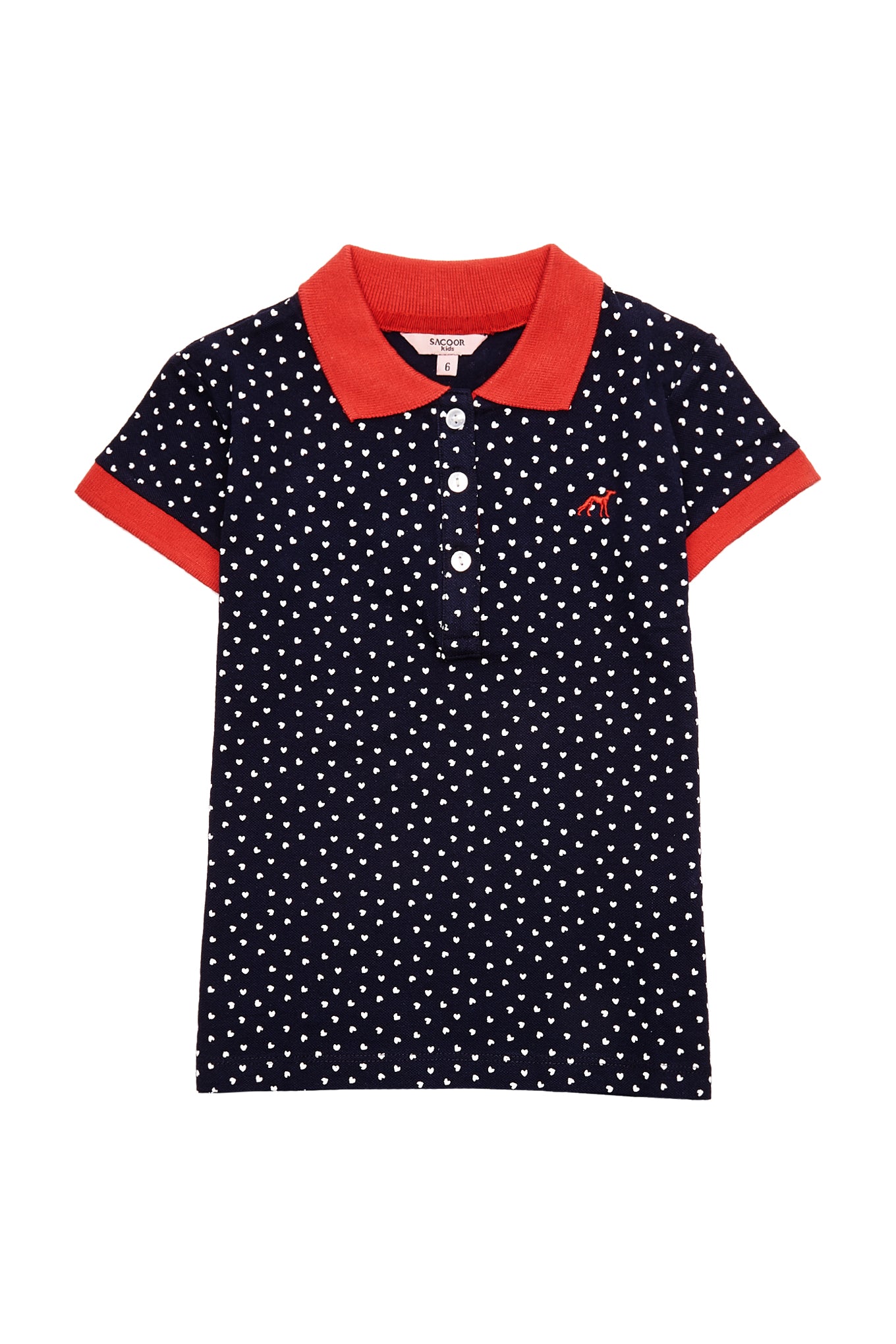 Girl's short-sleeved piqué polo shirt with a very feminine pattern, full of small hearts. Sacoor logo embroidered on the chest. Regular neckline with 3 buttons. Contrasting ribbed collar and sleeves. Made with cotton and elastane, this is a comfortable and very flexible item.