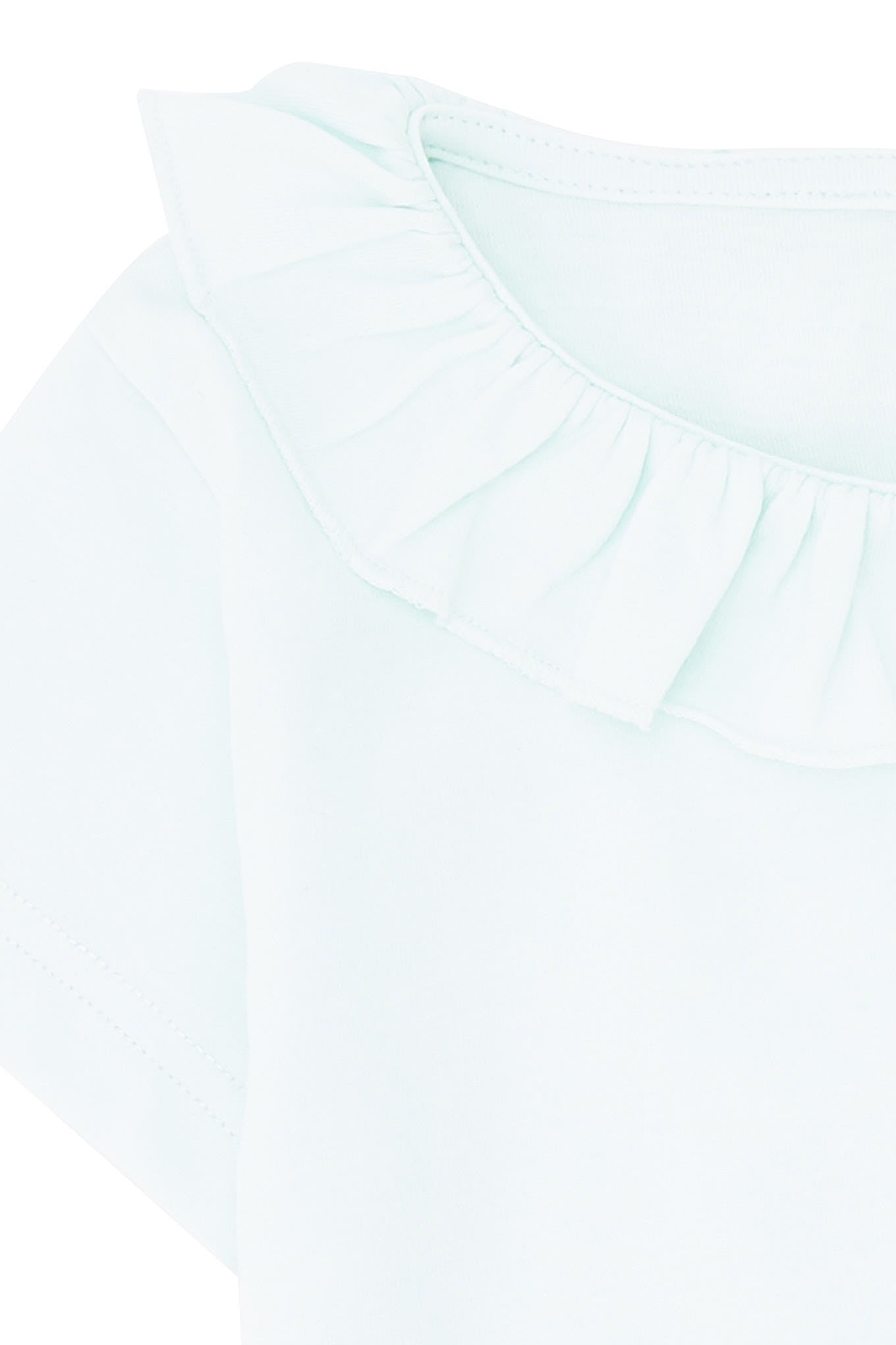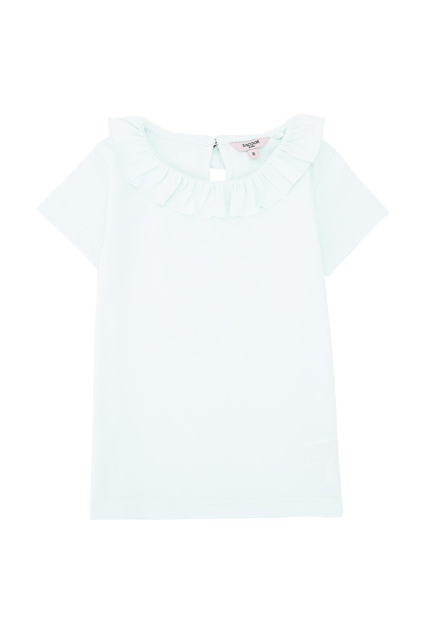 Plain girl's T-shirt made of 100% cotton, very light and cool. Eye-catching round neckline with wide frill around the edge. Button fastening at back. For wearing with Sacoor girl's skirts, trousers or Bermuda shorts.