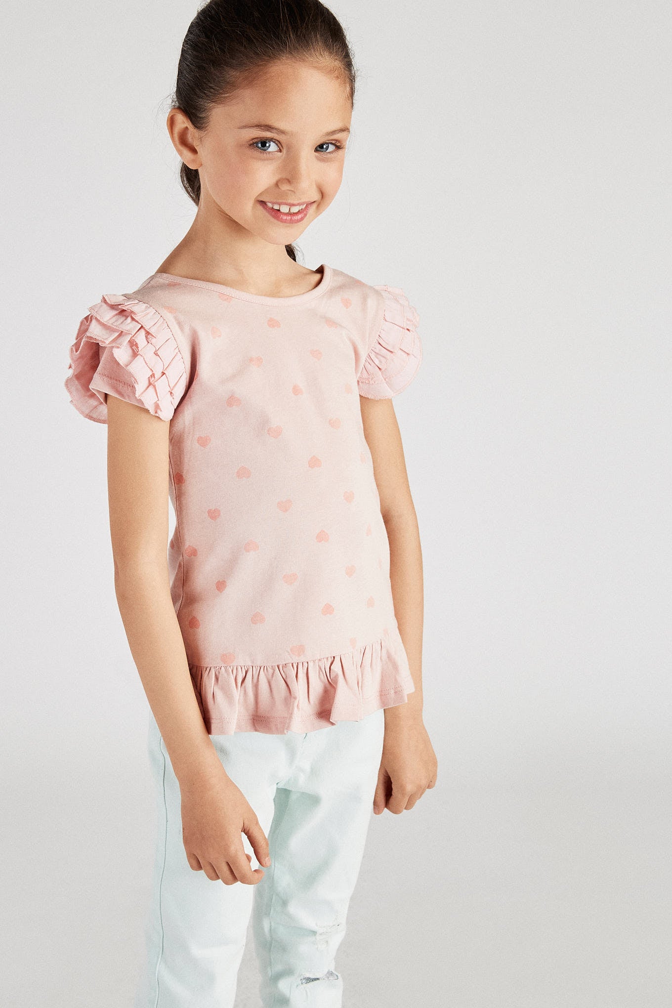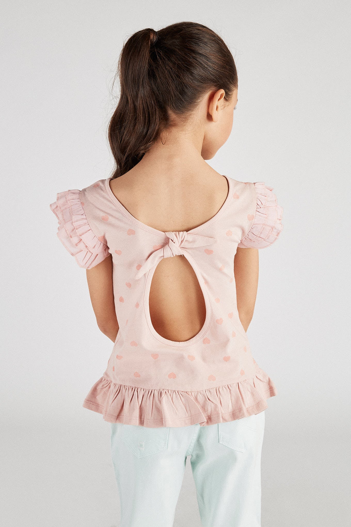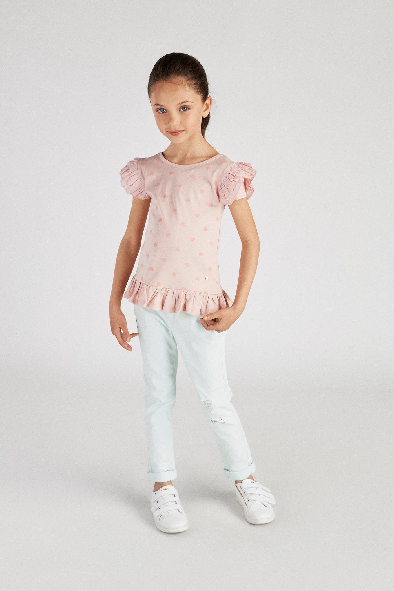 Very cool and light girl's T-shirt made of 100% cotton. Girls will love the hearts pattern! Round neckline with frilled sleeves and hem. Back vent with ribbon for tying a knot. For wearing with Sacoor girl's skirts, trousers or Bermuda shorts.