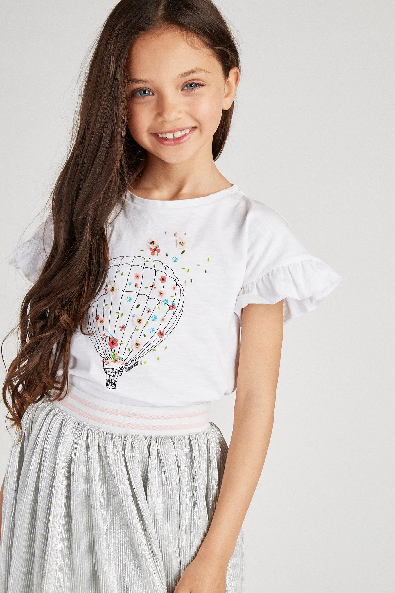 Very cool and light girl's T-shirt made of 100% cotton. Brand customisation, floral print and appliqués on the front. Round neckline and frilled sleeve. Regular model. For wearing with Sacoor girl's skirts, trousers or Bermuda shorts. Spring/Summer 2019 collection available at Sacoor Brothers online store.