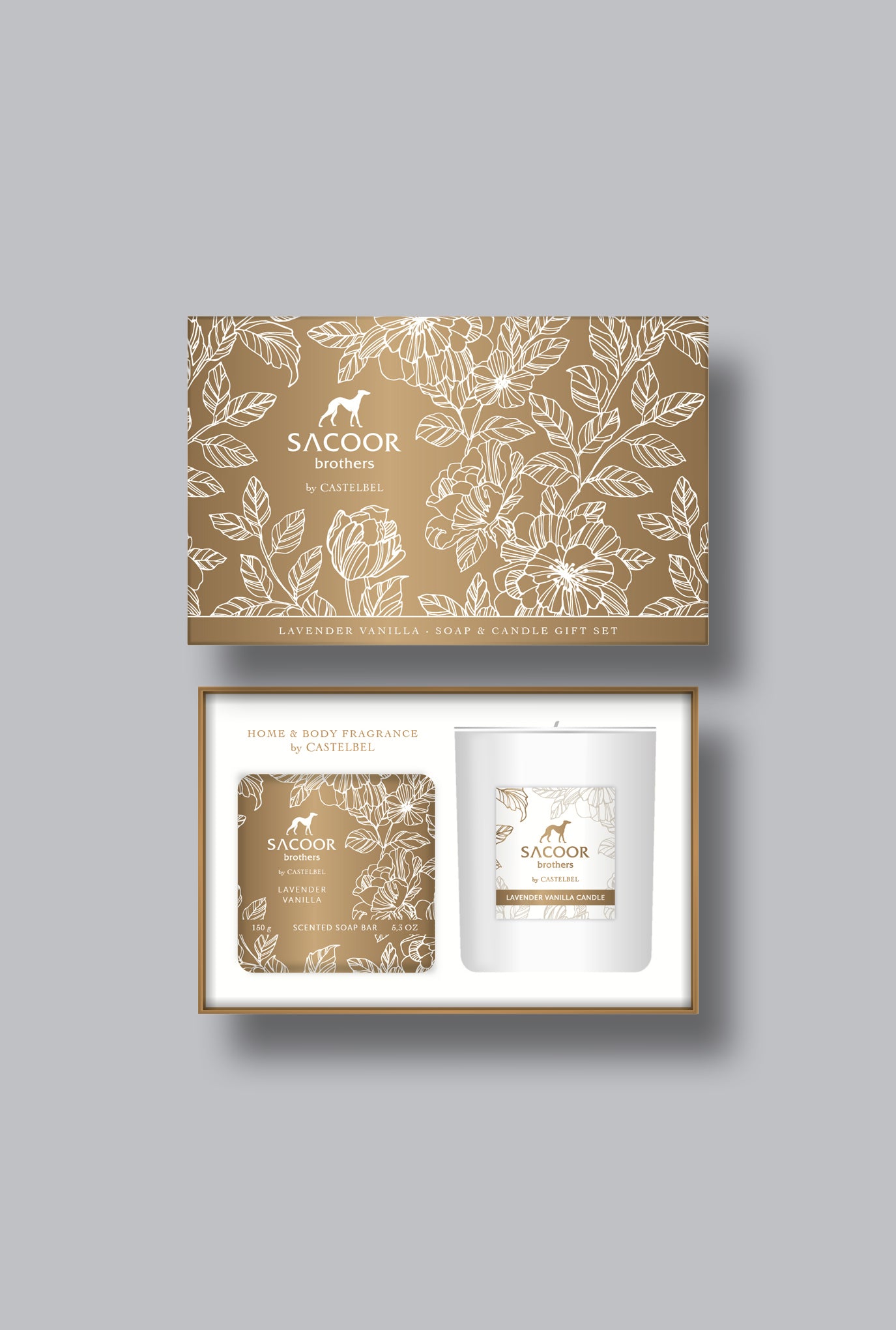 Luxurious set specially created for Sacoor Brothers, in collaboration with Castelbel, a Portuguese brand that dedicates all its care and love to these products..This set combines an exquisite fusion of Lavender and Vanilla scented soap bar and a perfumed 1-wick candle,.that comes in a glass vessel in order to ensure a long burn and maintain a maximum scent release..It presents a luxurious packaging perfect for a special treat or gift...Proudly produced in Portugal.