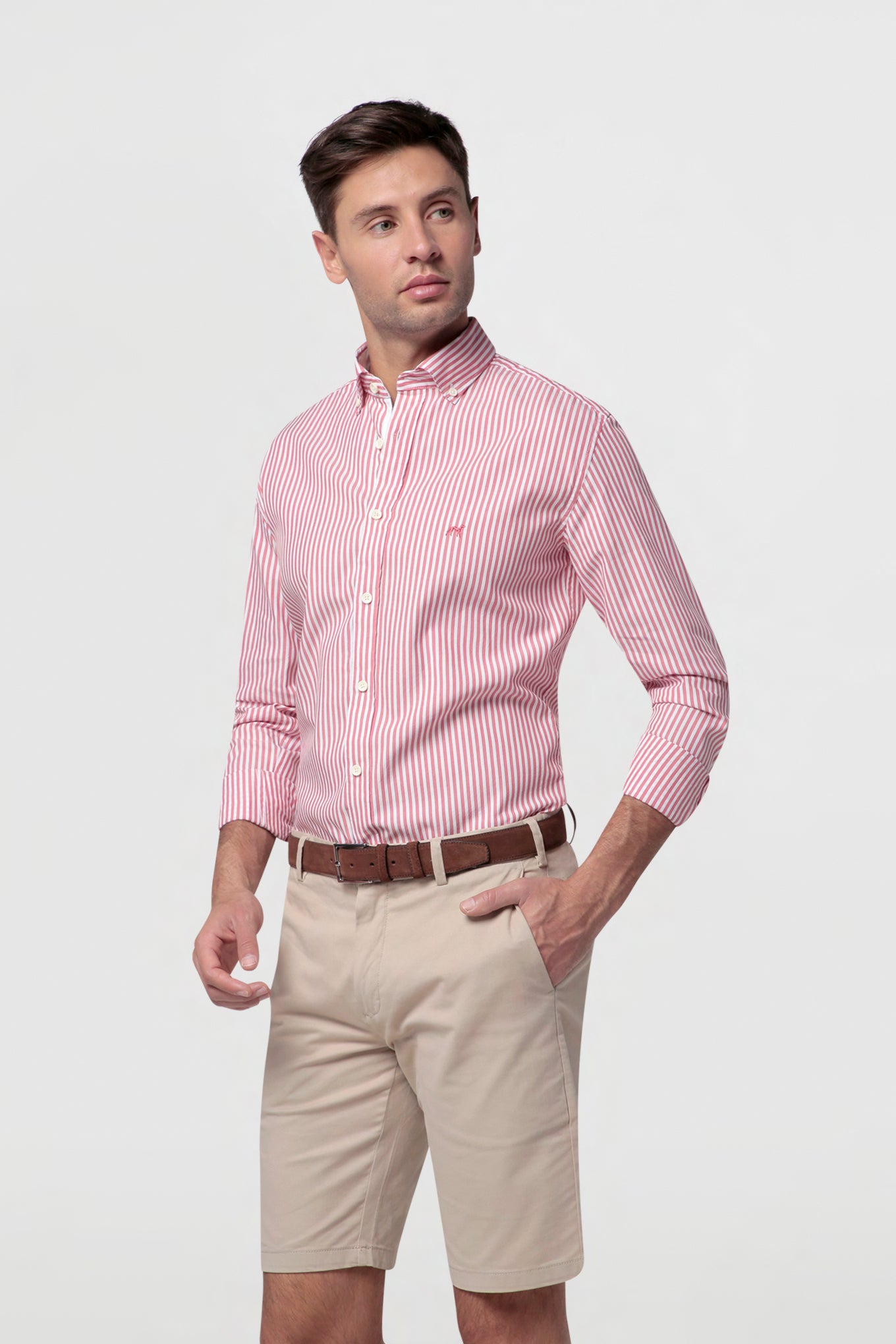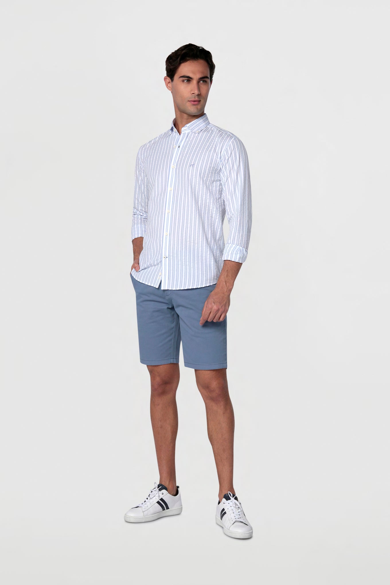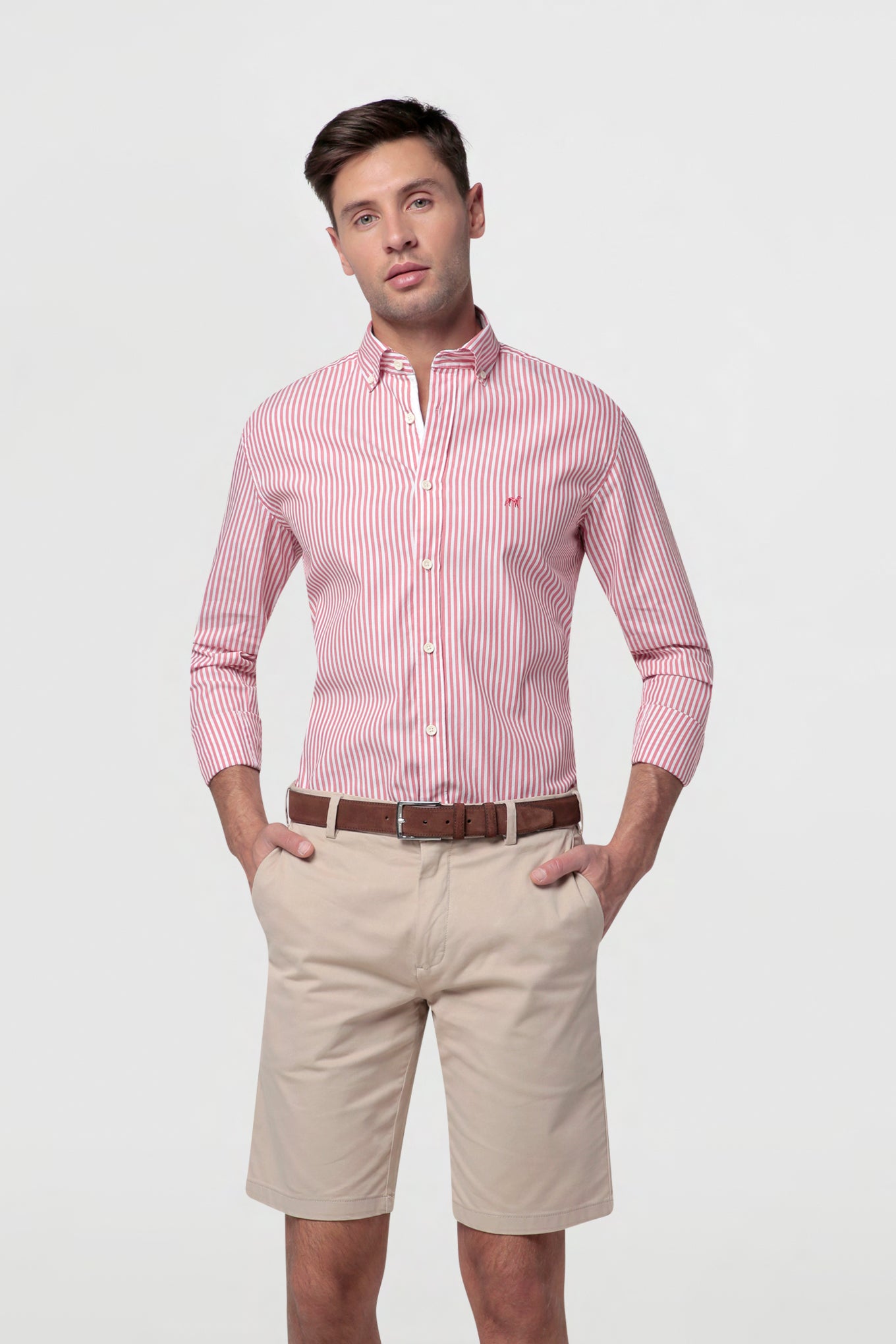 Men's plain Bermuda shorts, in a sportier style, slim-fit. Waistband with belt loops. With zipper, buttons and drawstring. Side and back pockets. In cotton & elastane, very cool and comfortable.