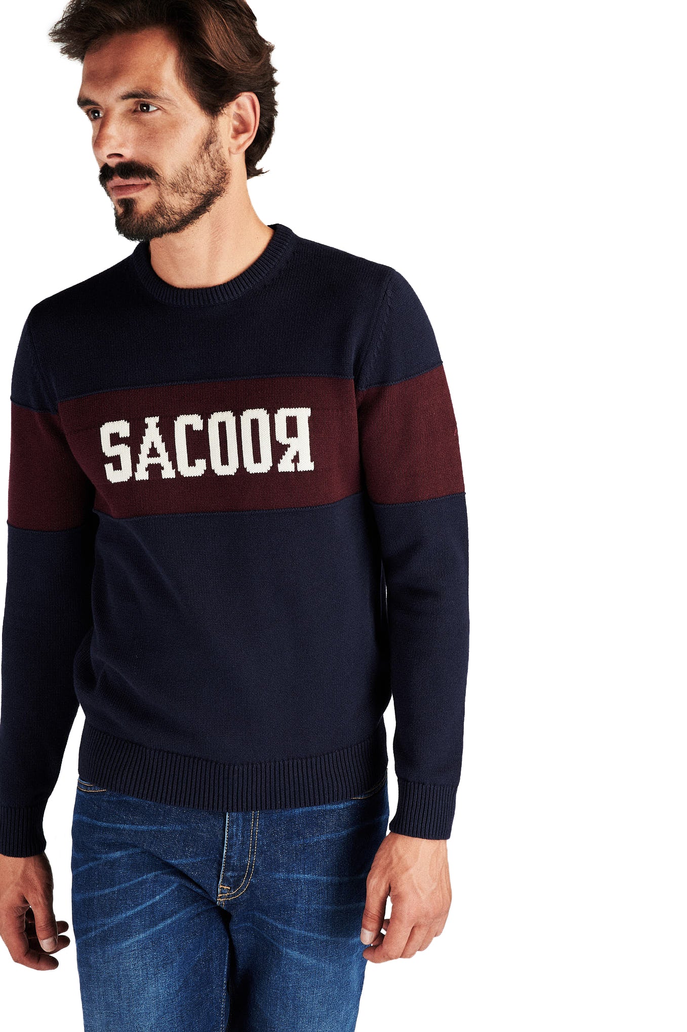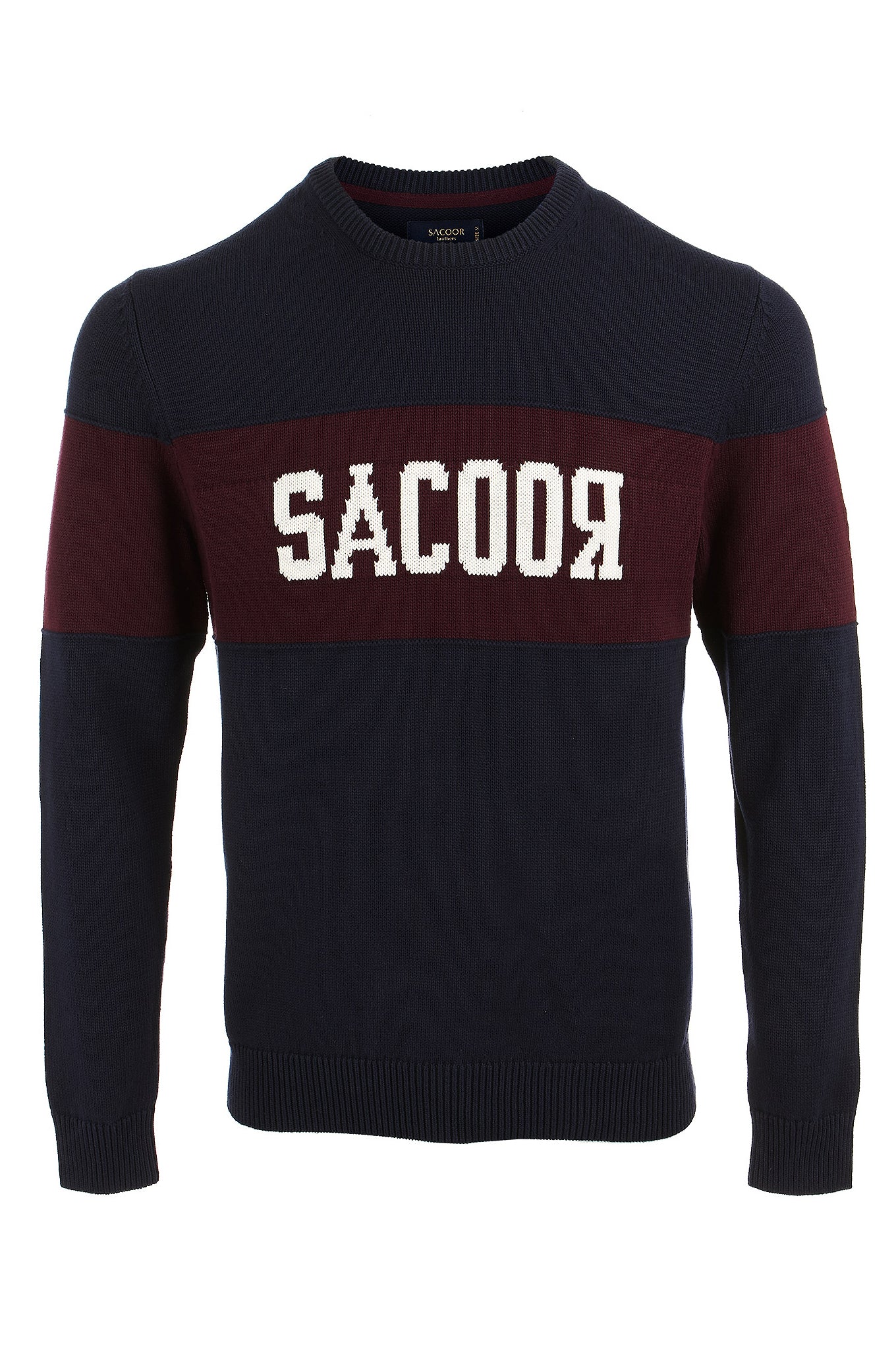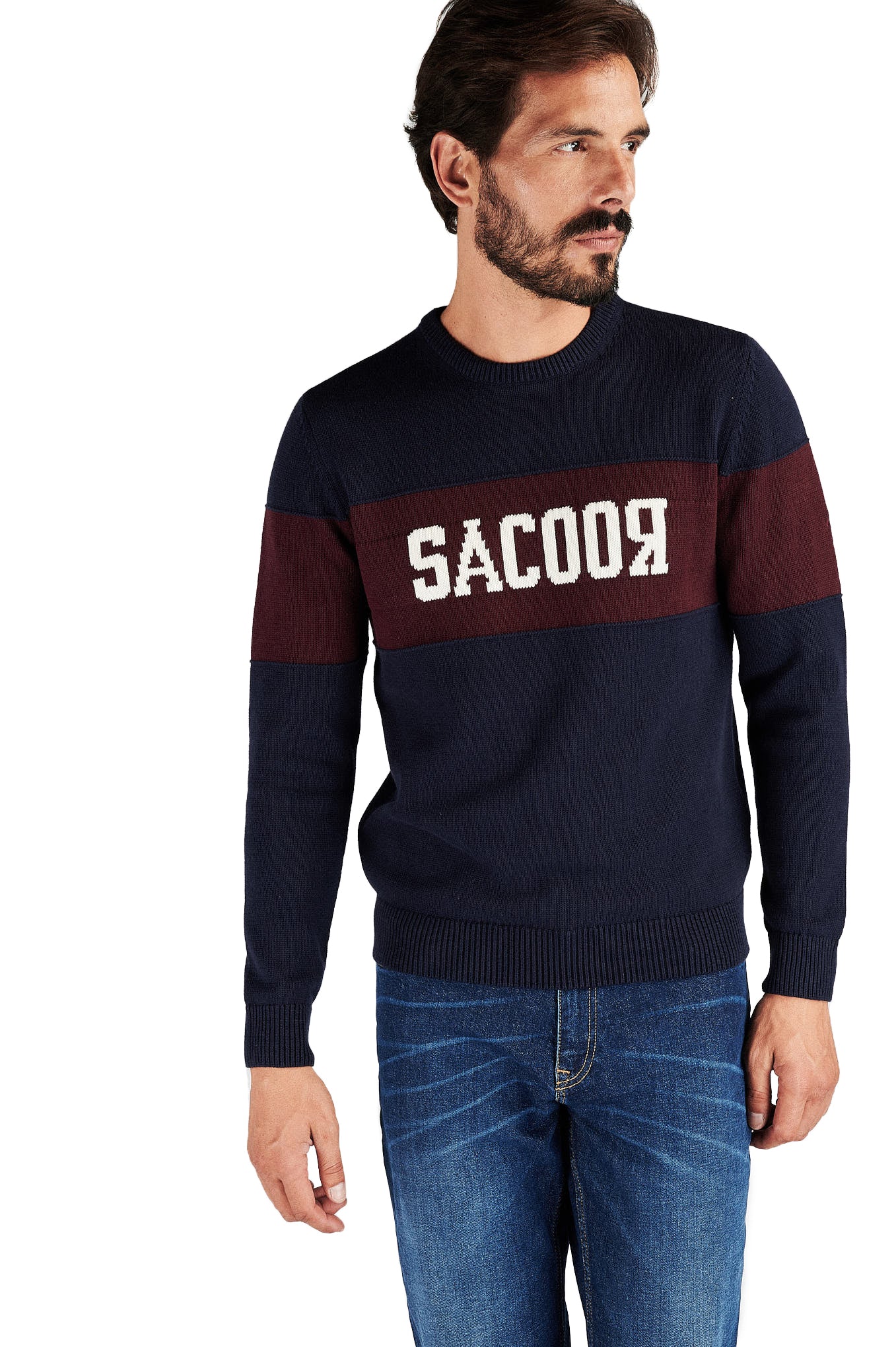 Knitted sweater for men, in a comfortable model perfect for the colder days. Regular, more comprehensive silhouette cut. central area of the sweater in contrasting tone, with personalization highlighting the brand. Round neckline. Ribbed finish on the bottom, cufs and neckline. Intermediate mesh set 7-9, warm and cozy.Sacoor logo embroidered on one of the sleeves.