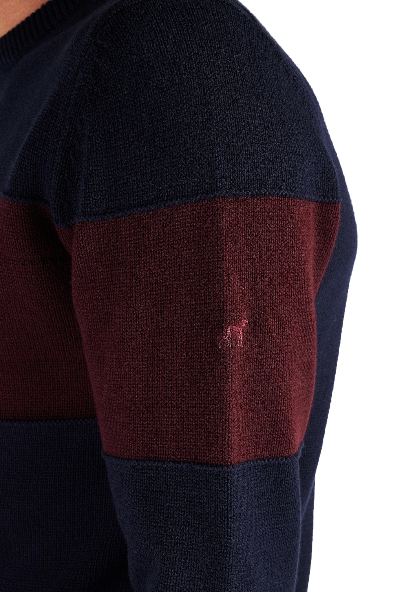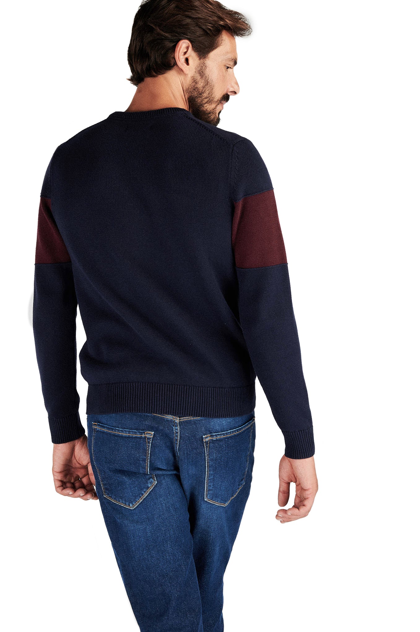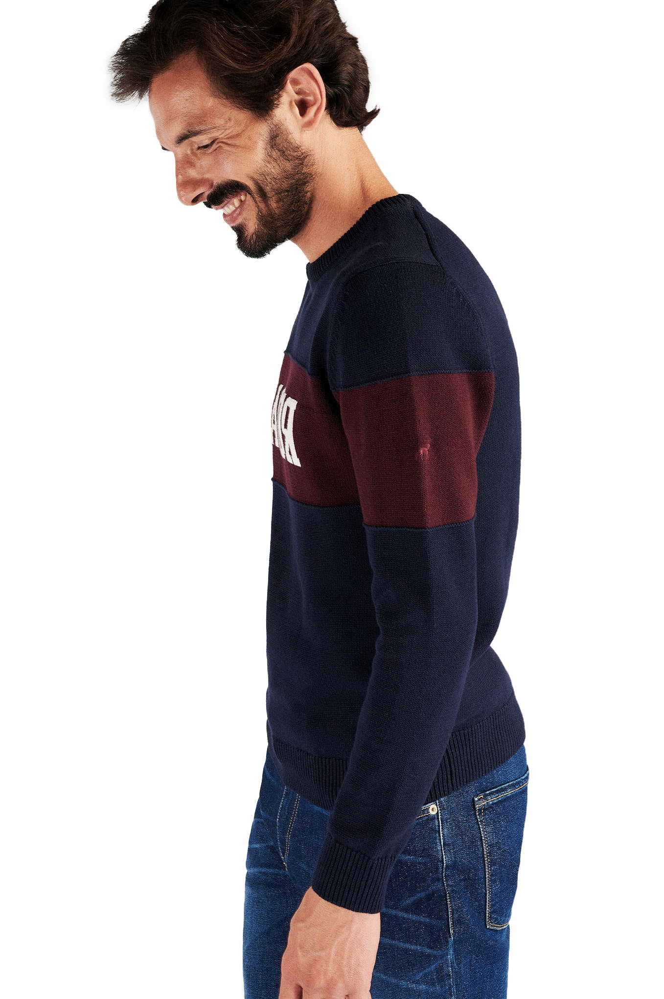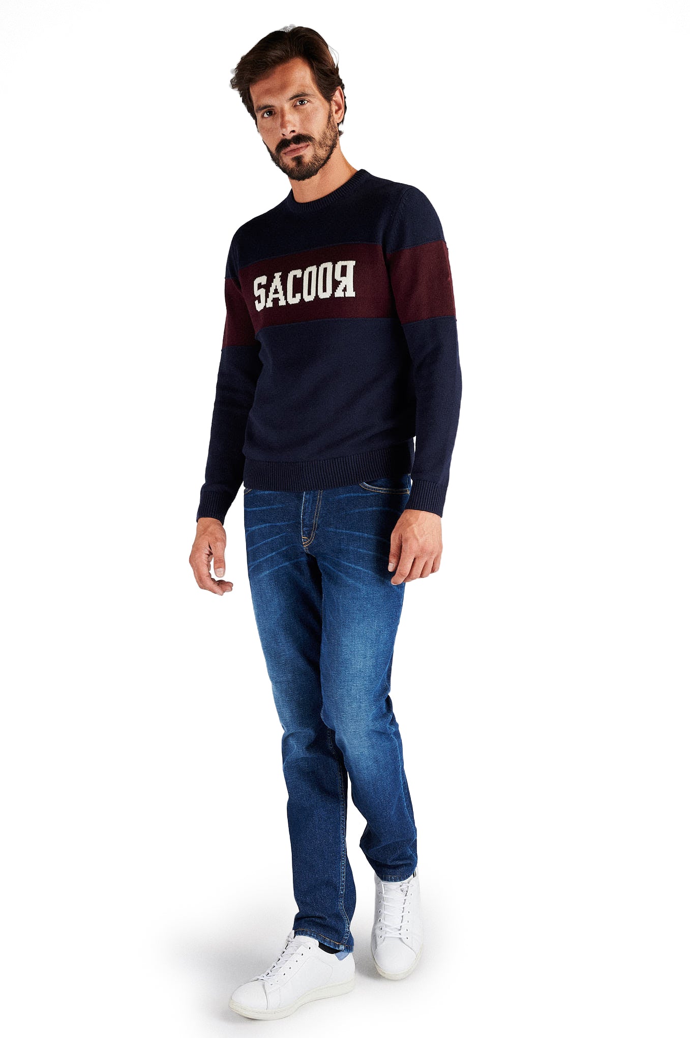 Knitted sweater for men, in a comfortable model perfect for the colder days. Regular, more comprehensive silhouette cut. central area of the sweater in contrasting tone, with personalization highlighting the brand. Round neckline. Ribbed finish on the bottom, cufs and neckline. Intermediate mesh set 7-9, warm and cozy.Sacoor logo embroidered on one of the sleeves.