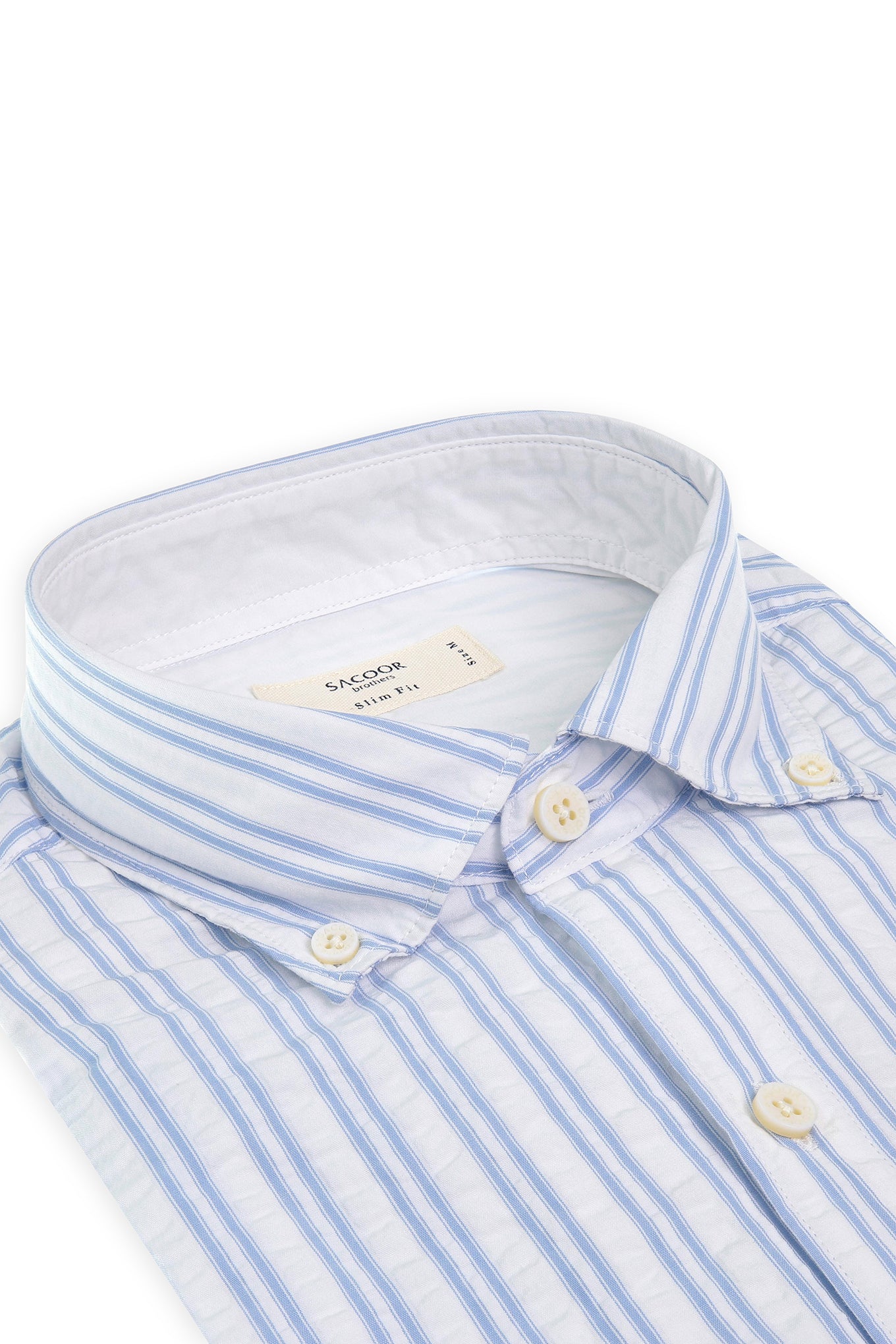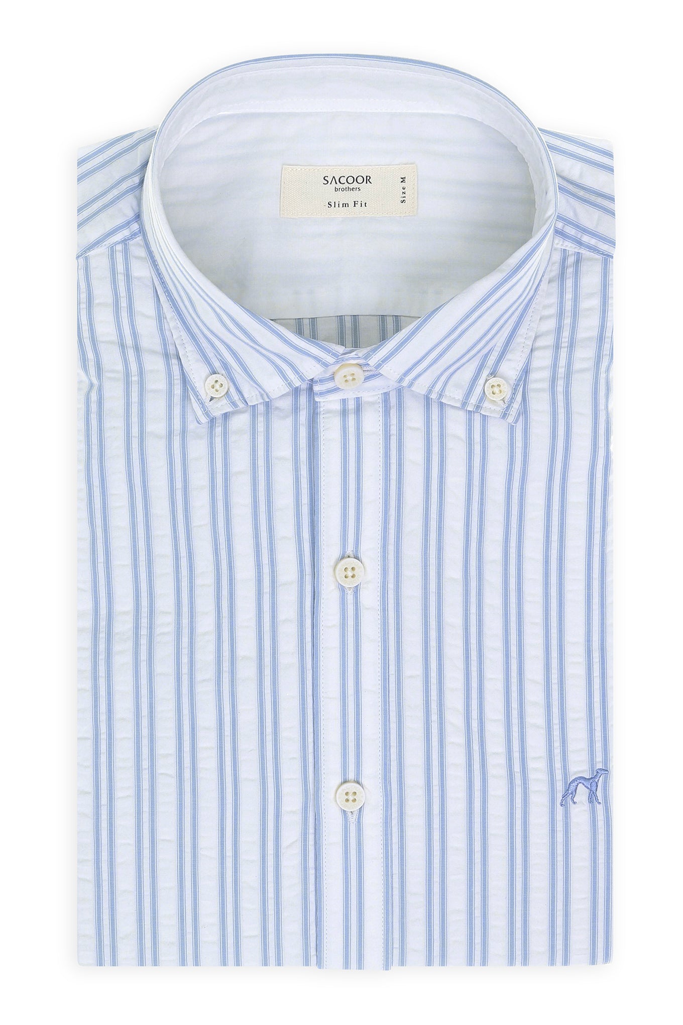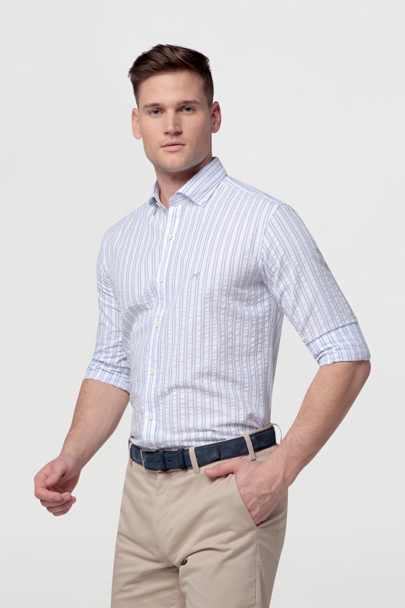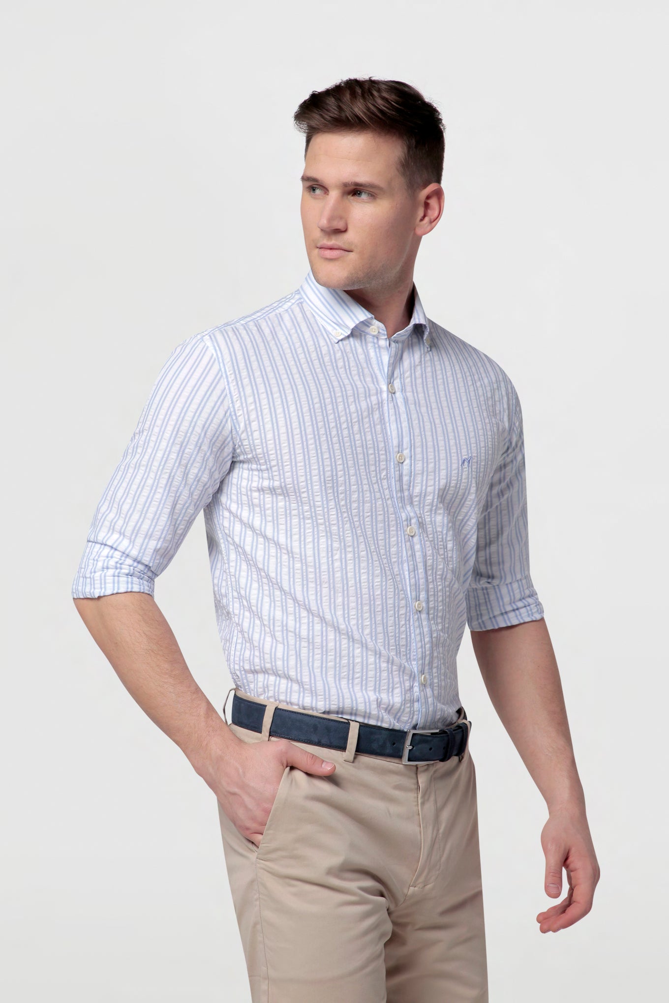 A modern cut for an impeccable casual look. The seersucker fabric is light and slightly crinkled, making this shirt a unique and ideal piece for the new season. Made from 100% cotton and with a striped pattern, this is an excellent option to wear on a relaxed day by the sea or for lunch with friends.