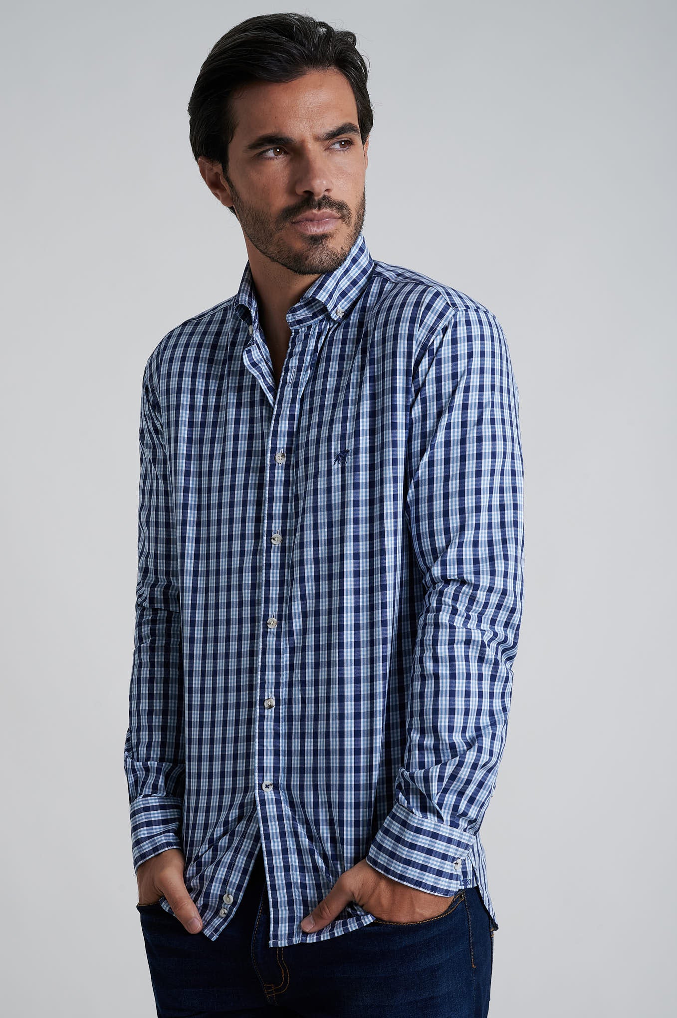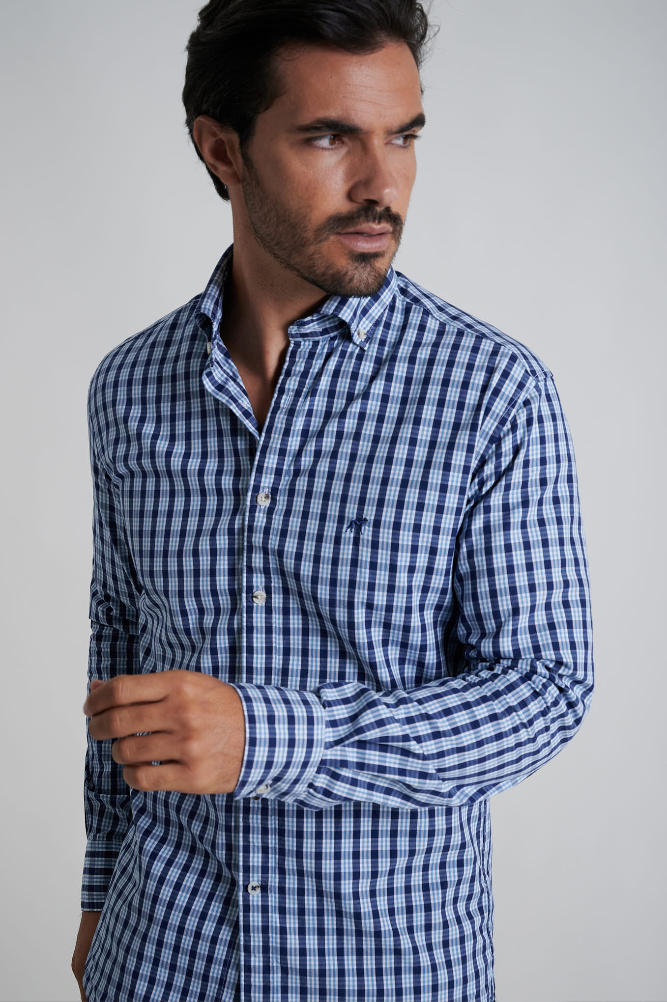 Men's checkered shirt in 100% cotton. Open collar with buttons, including on the back. Logo Embroidered Sacoor on the chest. More comfortable English stitching and for a quality finish. triangle Relaxed model for use on various occasions with a sporty feel. Available at Sacoor Brothers online store. The back length in size 40 is 78 cm and the sleeve length is 66 cm. See our Size Guide.