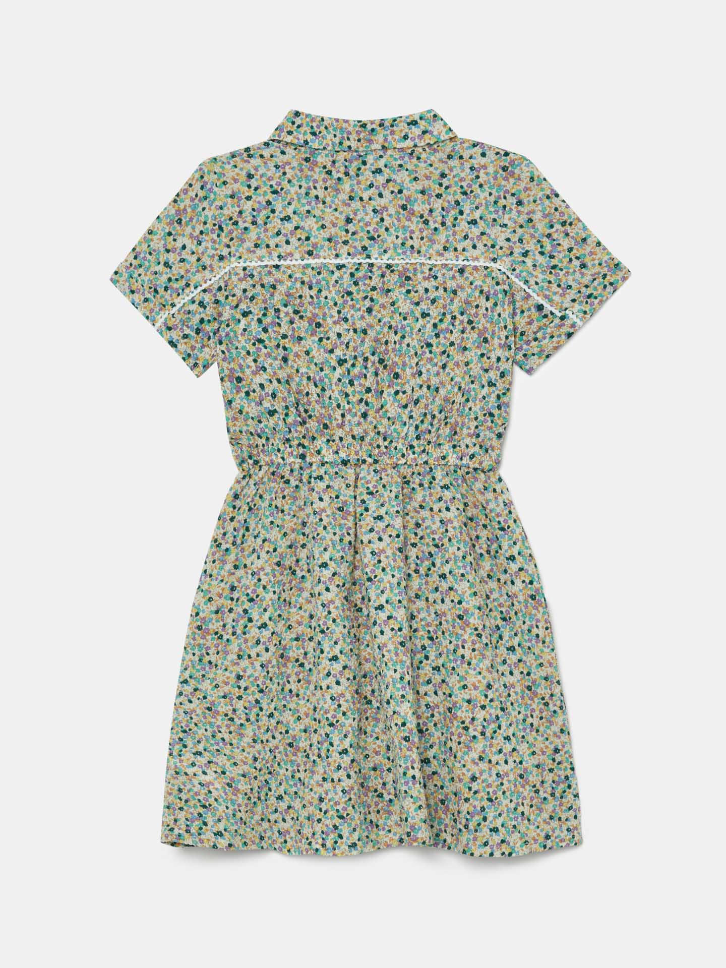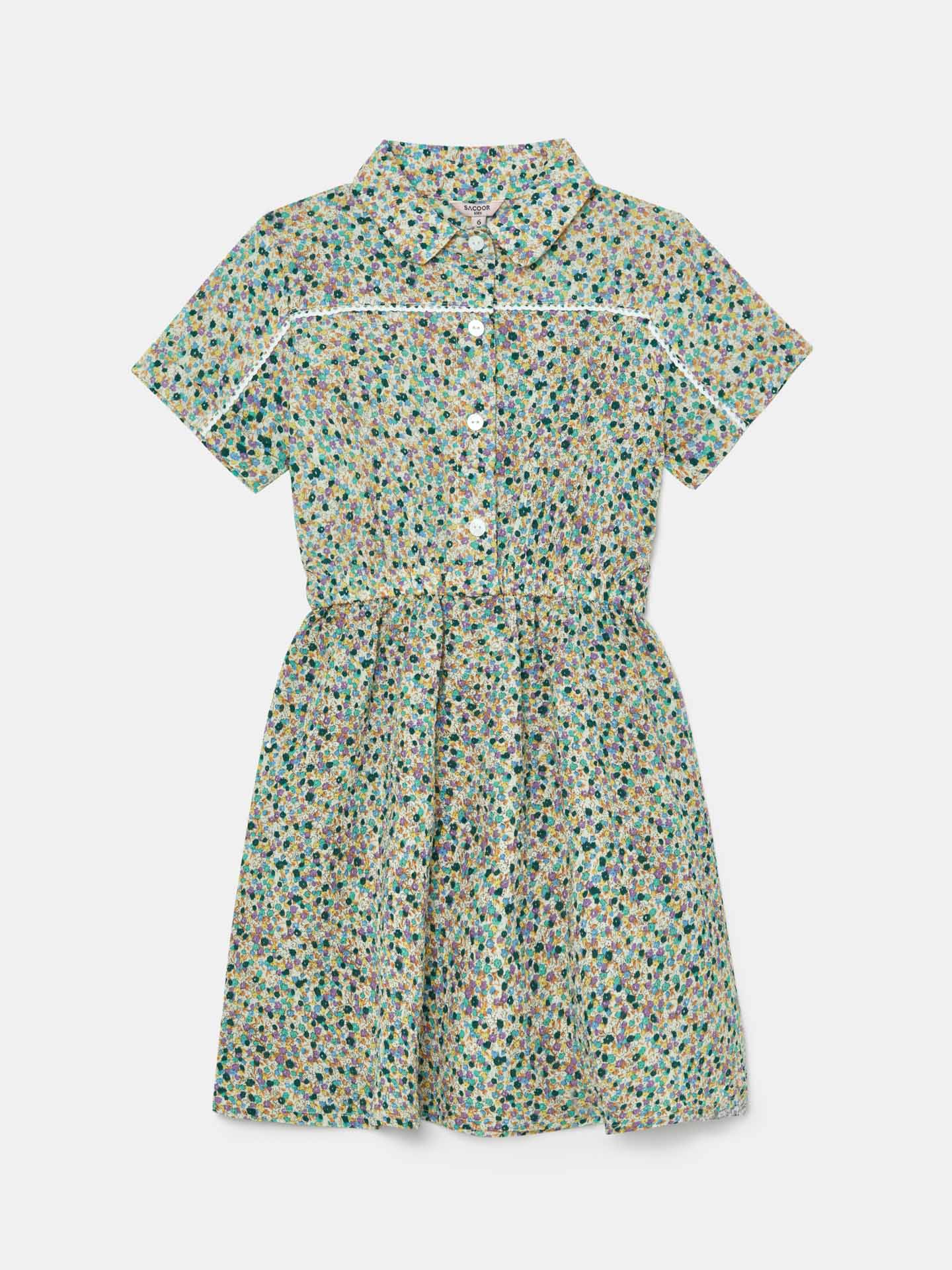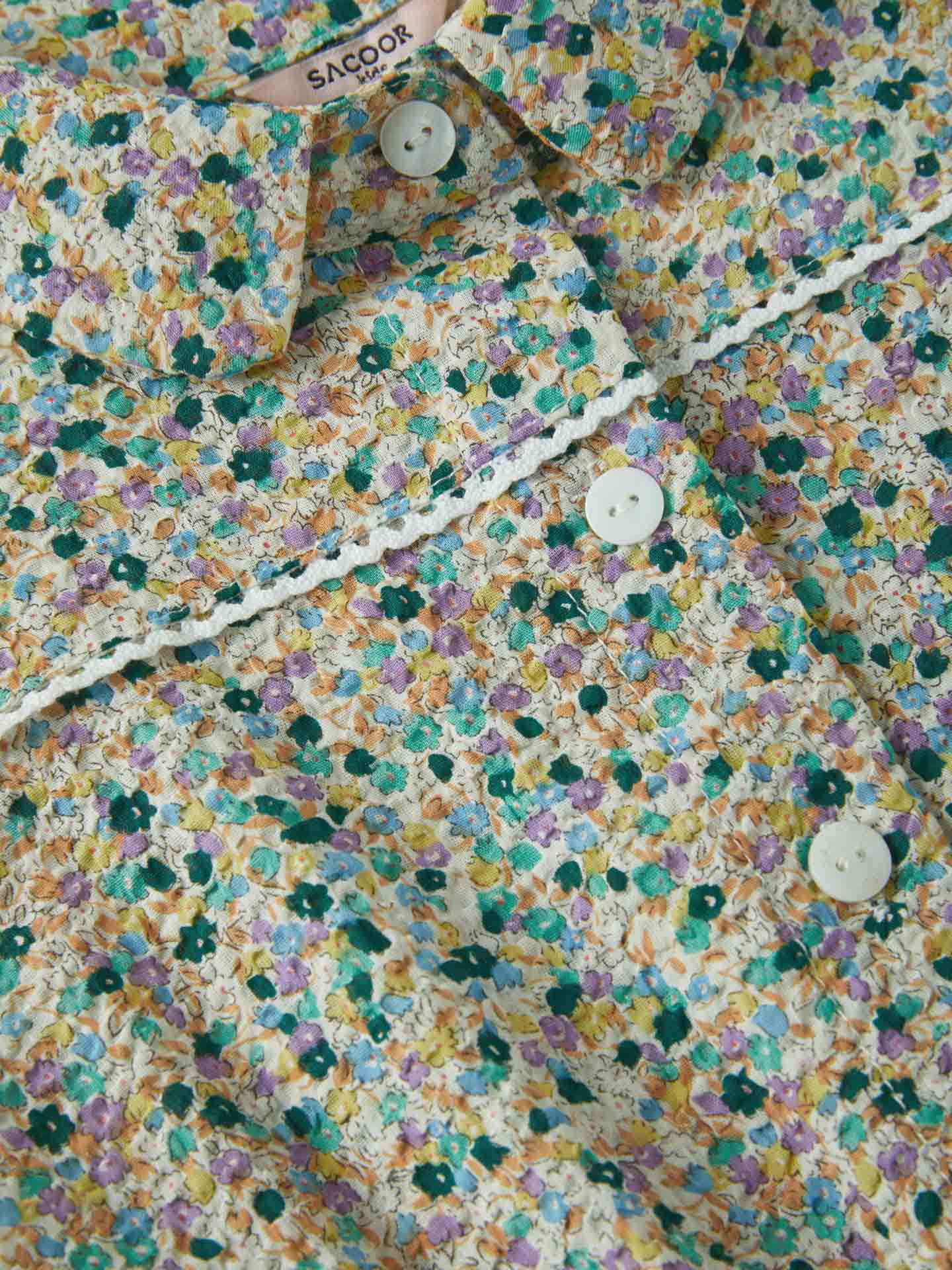 Printed regular fit dress made of light weight 100% cotton seersucker fabric for maximum comfort and easy care. Featuring peter pan collar, short sleeves with ferrule and four-button placket. Rich details such as decorative tape and Sacoor personalized rose gold plate.