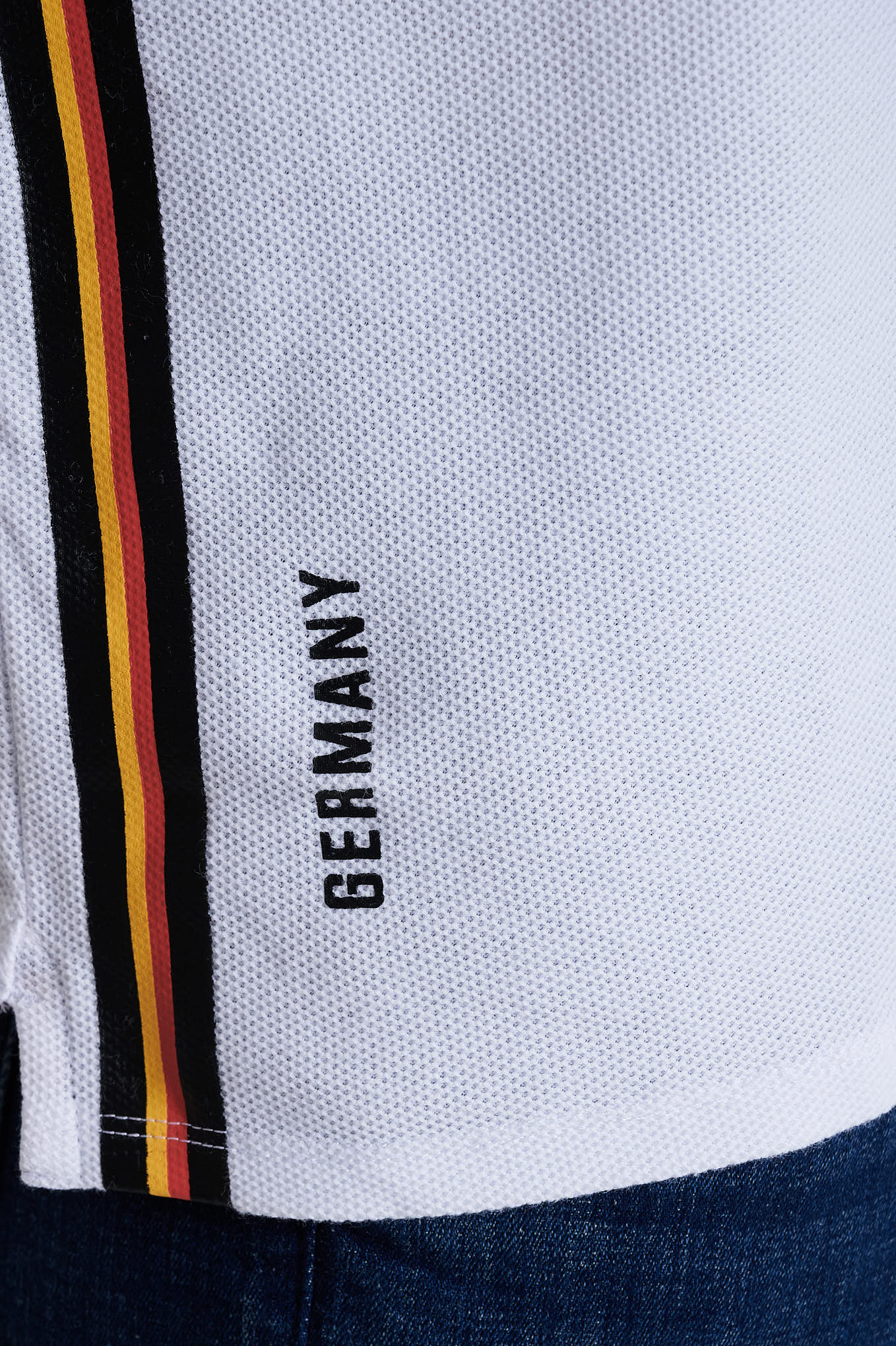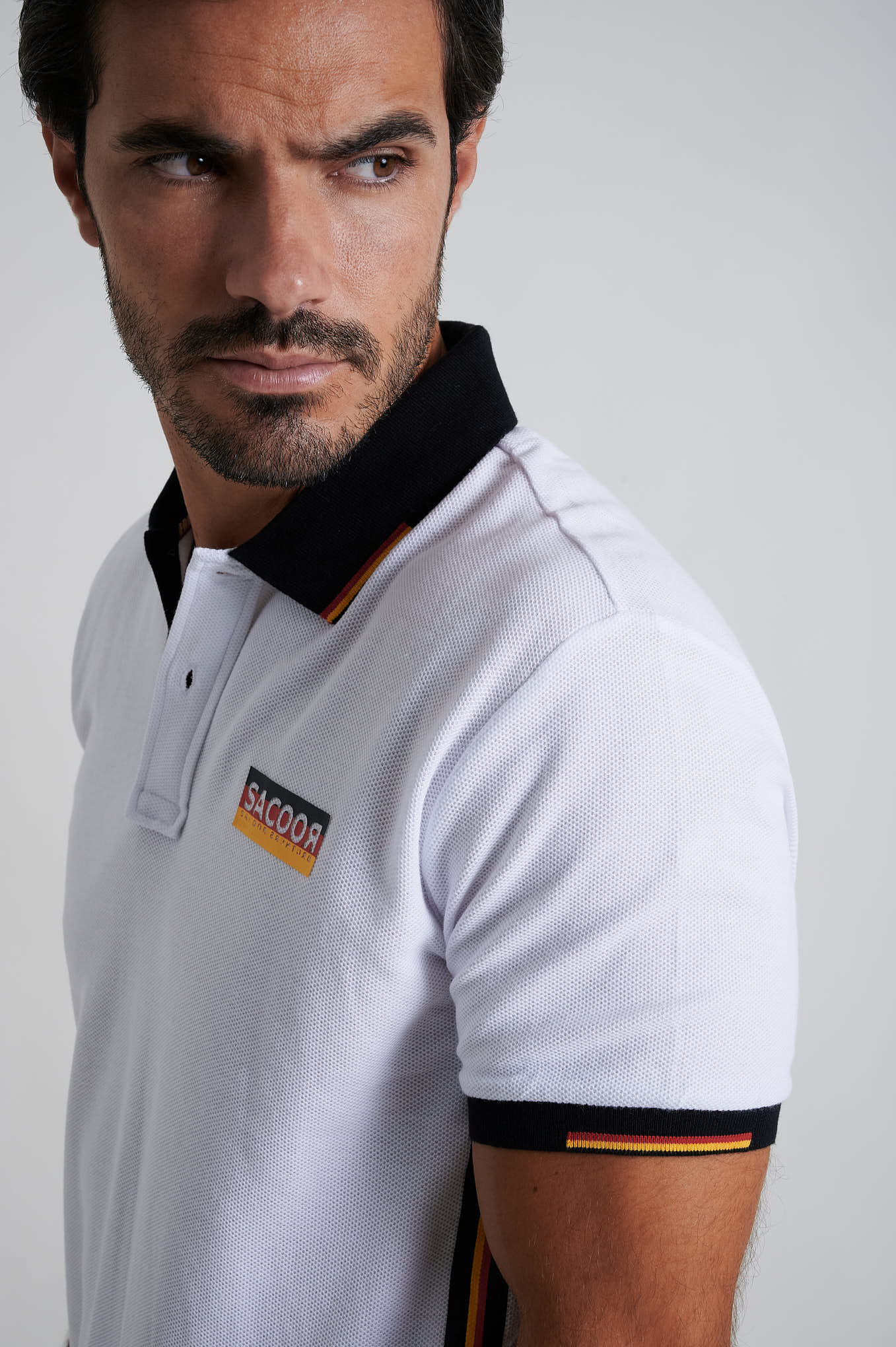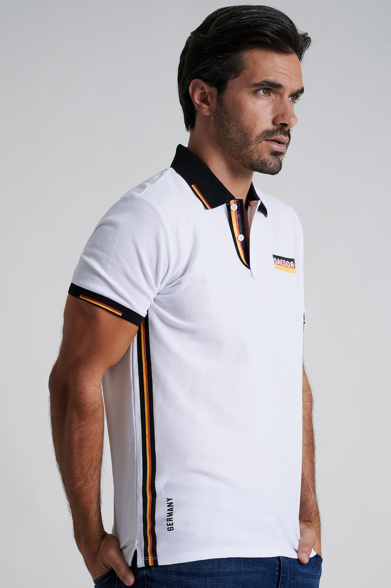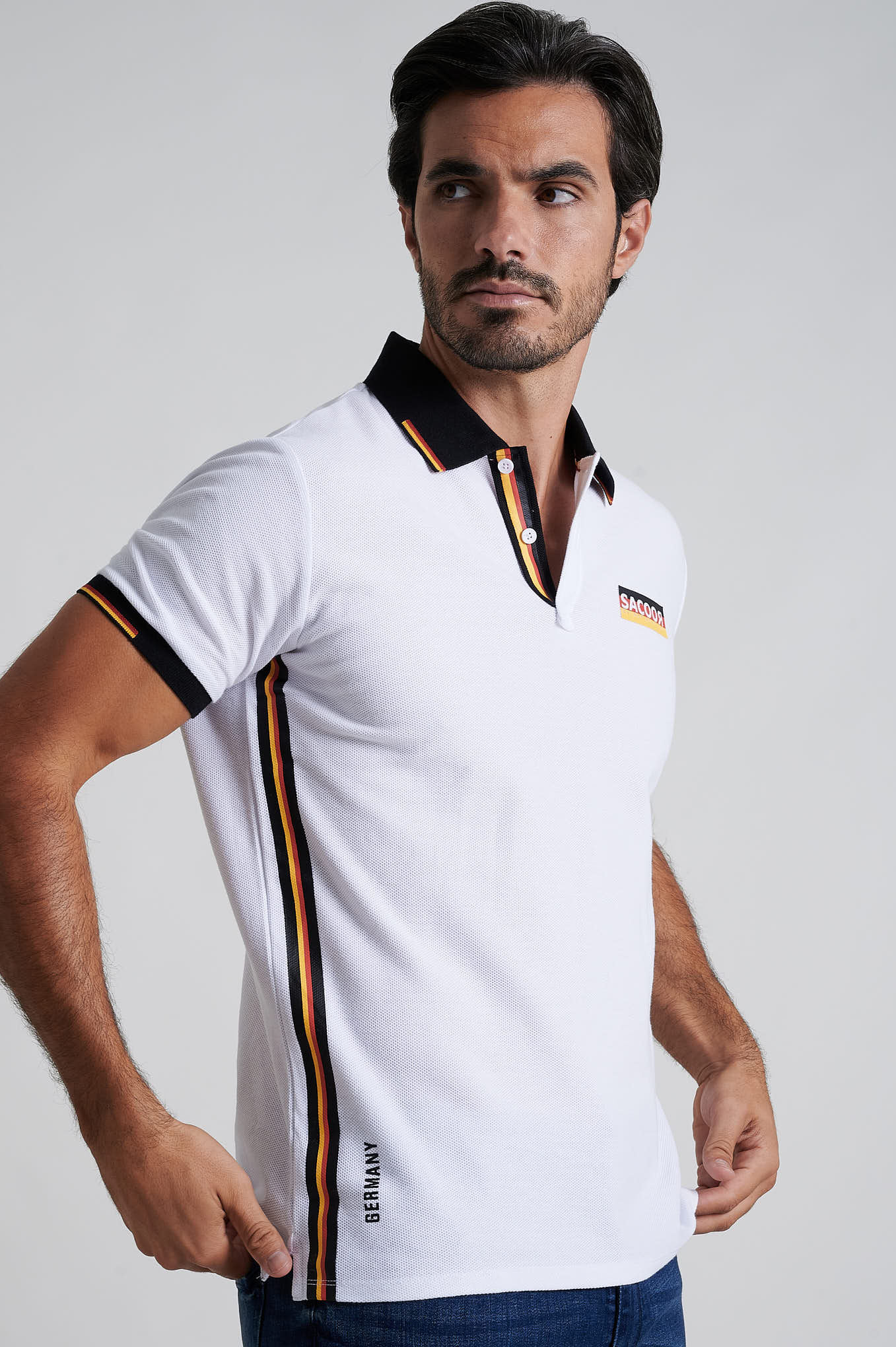 Polo-shirt made of 100% cotton piquet. Featuring a slim fit, ribbed collar and ribbed cuffs with small details with thin stripes in contrast color, two buttons, placket fastening - inside inferior with striped print , short sleeves. .Neck seam cover tape and slits oppening with striped tape in contrast colors..Logo print at back in contrast color. Undercollar with country name print.. Chest printed with name of brand with colors of country..Country name near to bottom and print at sides with stripes in contrast color. .The contrast color details have the same colors of GERMANY Flag